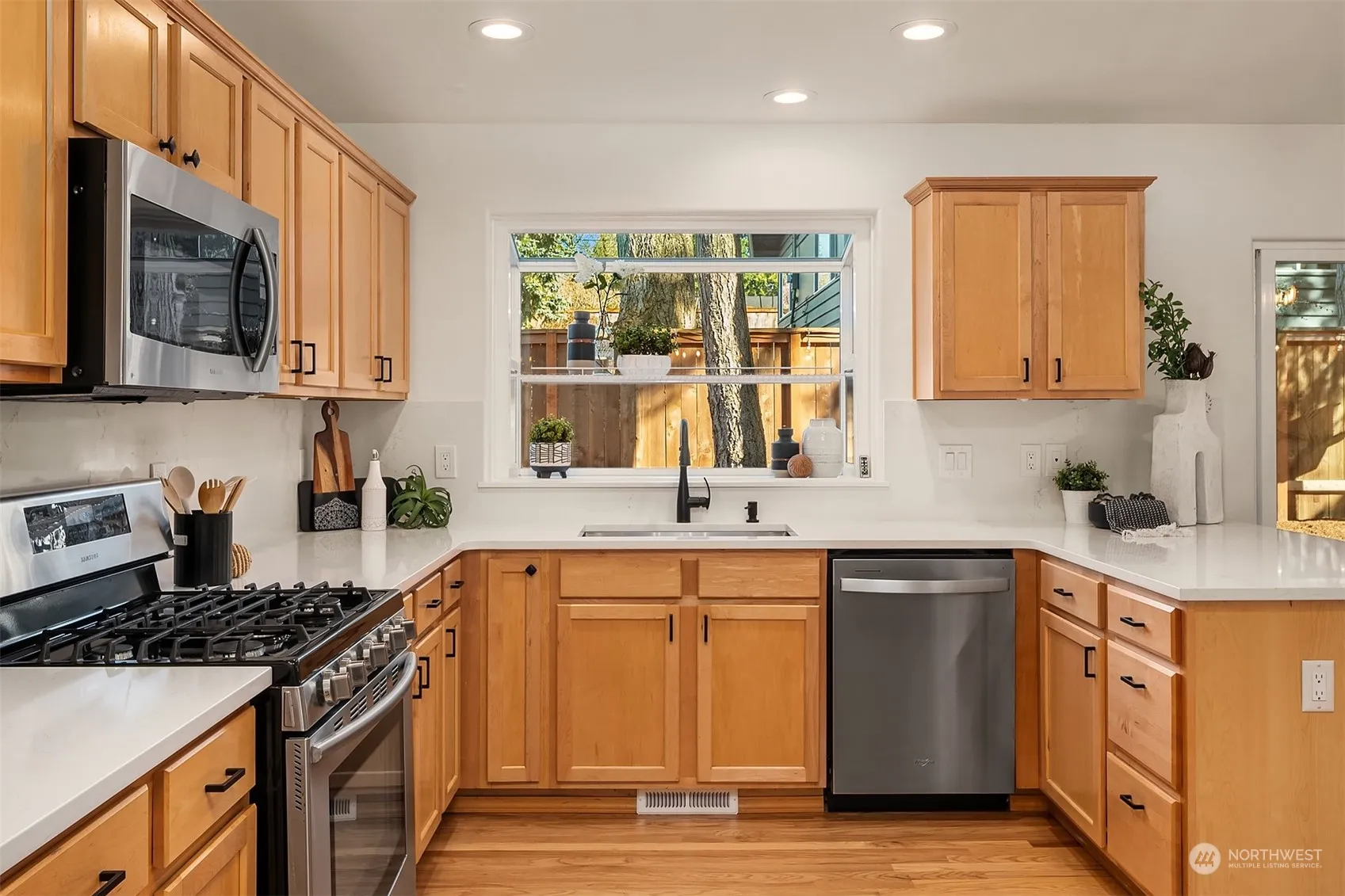 Kirkland Fully-Remodeled Two-Story w/5 bedrooms upstairs. Fresh BRAND NEW updates–New roof, complete int/exterior paint, carpet, modern trim, lighting, extensive refinished oak hardwoods. Enter from the covered front porch, sunny west-facing front room w/vaulted ceilings & custom built-ins. Updated eat-in kitchen w/new countertops/backsplash, opens to 2nd living area w/gas fireplace. Formal dining room & new custom stunning staircase. Primary w/fully remodeled 5-piece en-suite bath w/heated floors & walk-in closet. Updated hall bath w/heated floors & laundry room. Relaxing new cedar fully-fenced yard, Trex deck, heat pump w/A/C. Vaulted garage w/storage. Walk to Sandburg Elem, Finn Hill Mid, Big Finn Hill & St. Edwards Parks. Welcome Home.