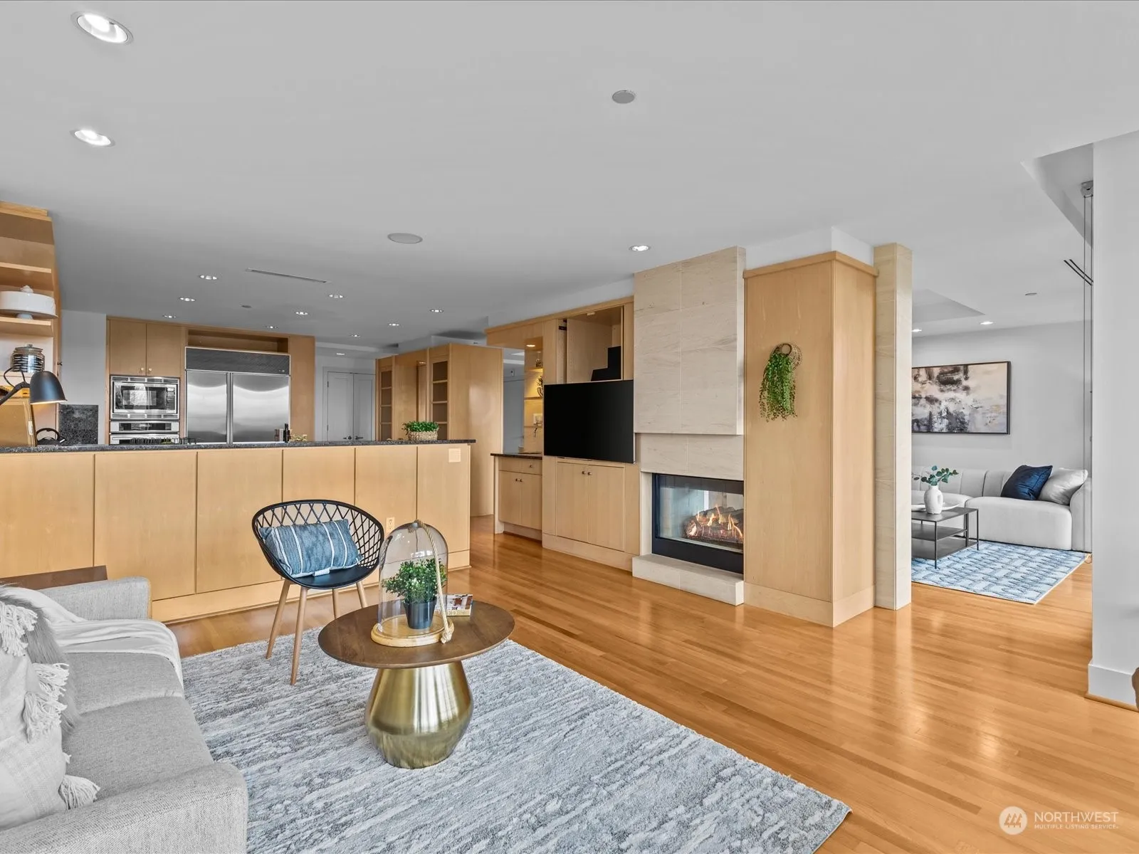 Iconic Marina Heights…Luxury-grade boutique concrete & steel building perfectly placed in the heart of downtown Kirkland. Over 2,000 sf of outdoor living space…patio with lake & city views…ideal for entertaining & gardening. 2nd patio extends off all 3 BR and lives like your own private yard. The Limestone fireplace is the anchor of the grand living room with walls of glass doors that lead to the exceptional view patio. Chef’s kitchen with abundant cabinetry, large island, walk-in pantry, butler’s pantry & built-in bar. Primary suite offers deluxe closet, double sided fireplace & opens to view patio. Abundant storage. 2 pkg spaces. Steps to parks, beach, fine & casual dining & more!