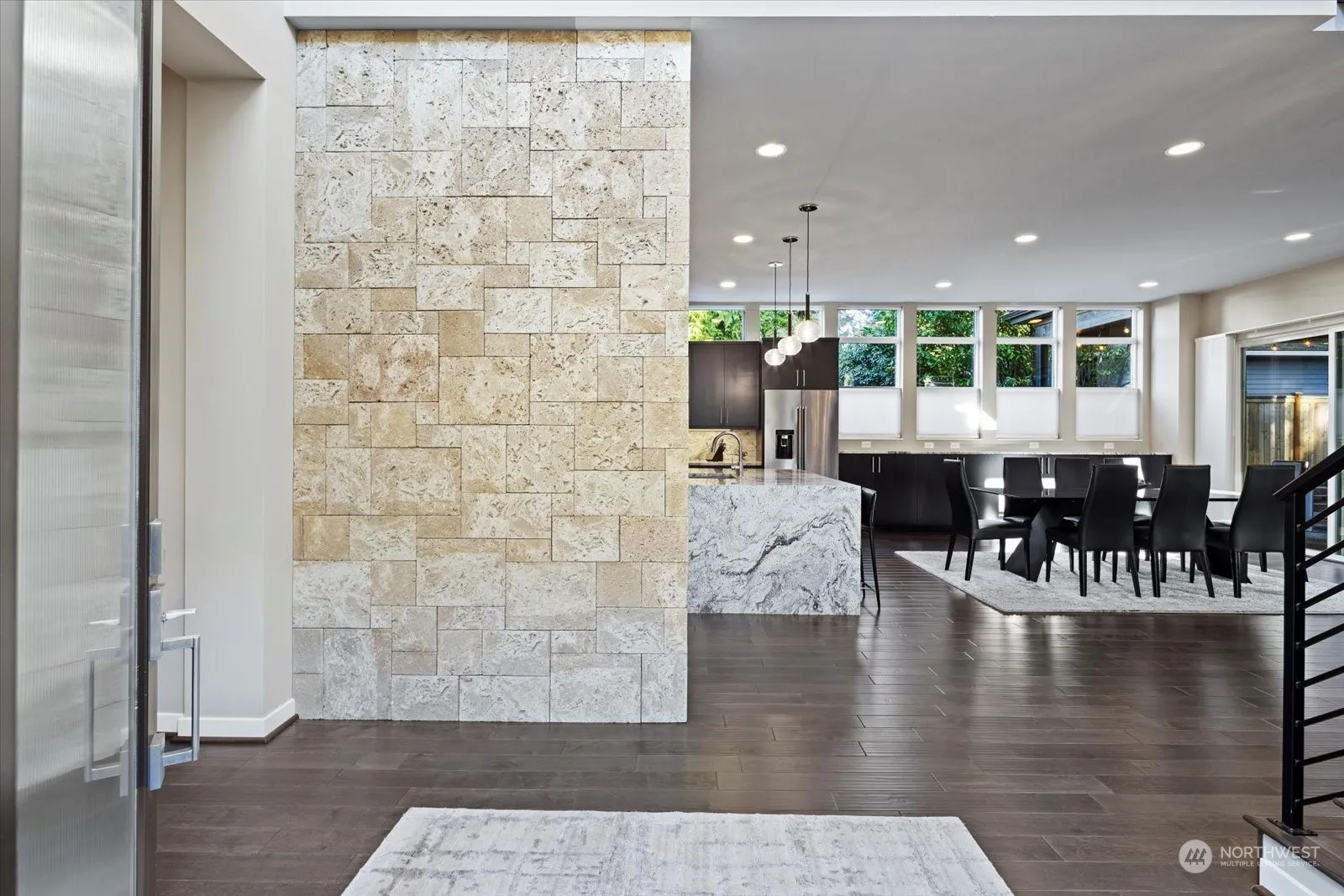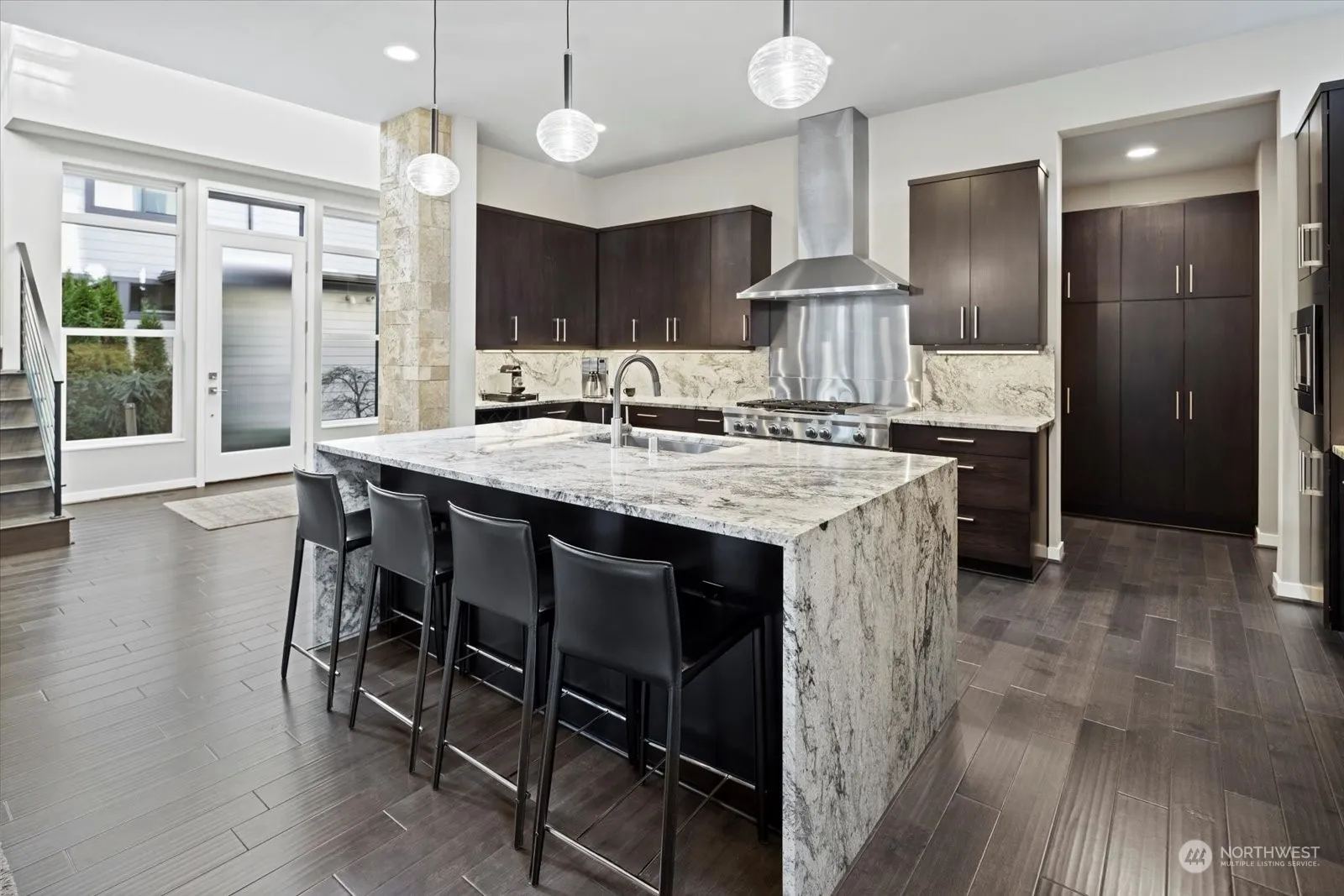 Stunning Contemporary luxury home! Built in 2019. Soaring ceilings, hand scraped hardwood floors, ample windows & natural light. Gourmet Kitchen w/stainless steel appliances, granite countertops w/waterfall island featuring bar seating, oversized pantry, wine storage, under cabinet lighting & 48″ commercial grade gas cooktop. Open layout dining room leads to spacious outdoor covered patio. Main level office/den, bedroom & bathroom w/walk-in shower. Family Room w/dual sided fireplace & grand metal surround. Primary suite showcases fireplace, spa-like bath w/large walk-in shower, obscure glass accent wall, & oversized walk-in closet. Upper level laundry room. Large 3-car garage w/240 volt outlet. Ideal location in the heart of all Kirkland!