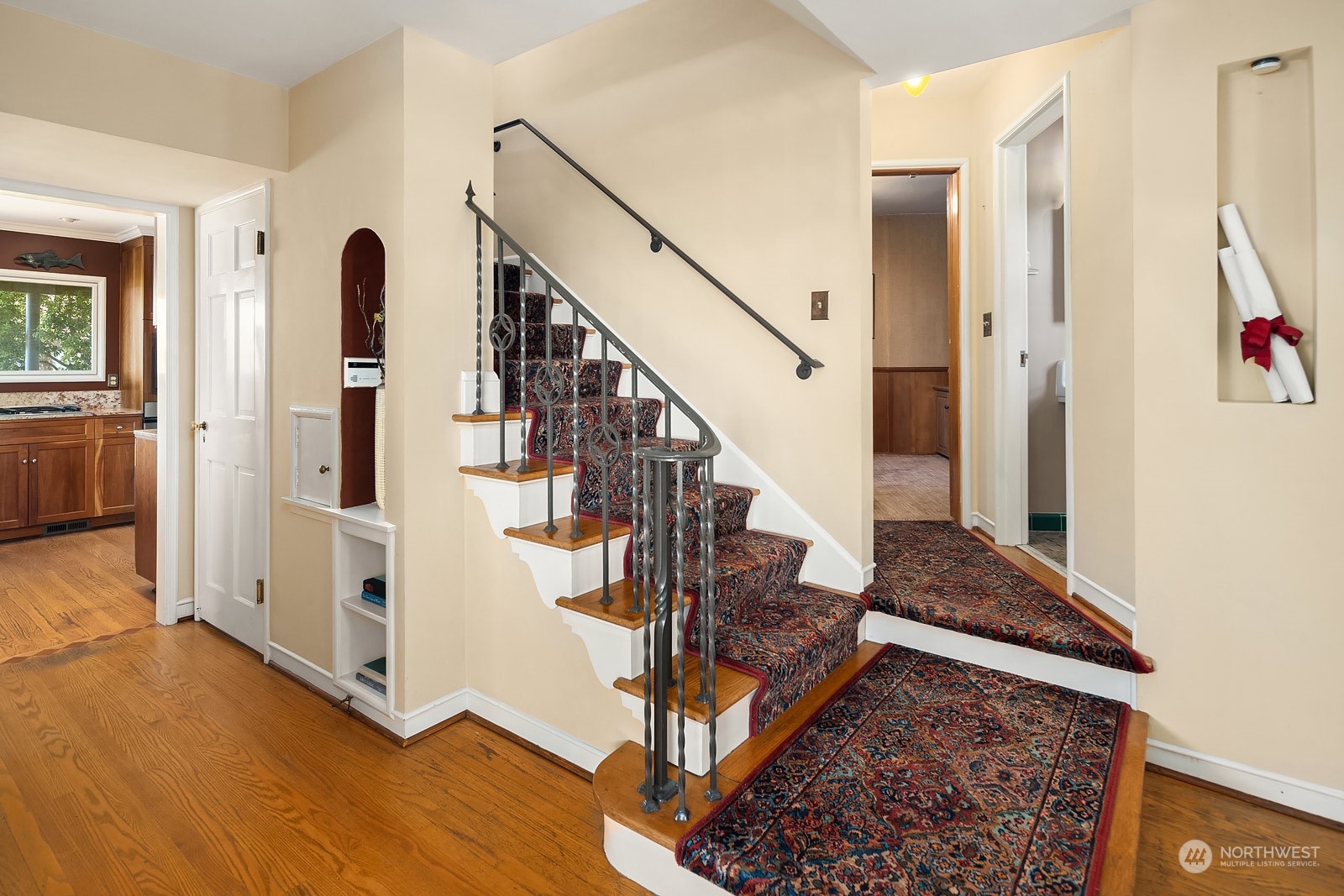 Enjoy water views from almost every window in this wonderful Magnolia home. So many original touches of the era. Excellent light and super floor plan, with two bedrooms and two baths up, a third bedroom/den on the main, and a view deck off the primary that captures the gentle water breezes all summer. Updated kitchen, hardwood floors, classic lighting and large bright basement bonus room. The gardens have been clearly loved with perennials galore and include a level grassy back yard area surrounded by flower beds. Private patio with easy garage access and a corner lot that serves almost no traffic. Located within walking distance to the village and two blocks from the beautiful water view walk along Magnolia Blvd. This one is a beauty.