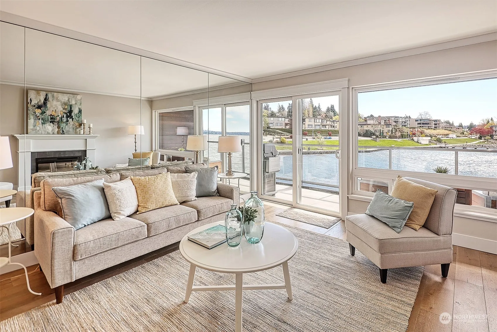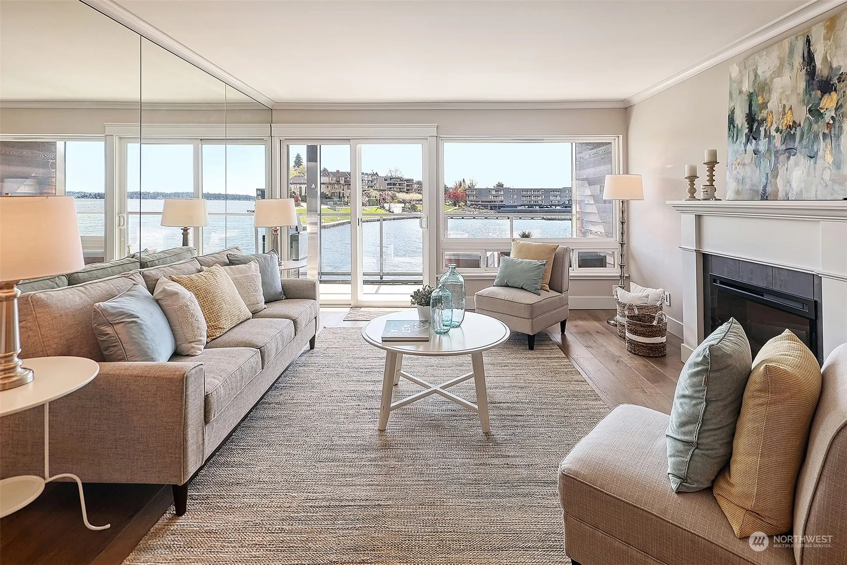 Exceptional opportunity to live in Kirkland’s downtown waterfront community, enjoying a luxurious, elegant home with tasteful updates, finishes & features throughout – a $250K complete remodel. The open floor plan allows you to entertain in style, with fireplaces for cozy evenings or doors open to the sounds of the lake. You’ll love the incredible kitchen with upscale appliances & cabinetry, your laundry room & the bedrooms with soothing lake view. The primary suite is large & luxurous. Great location, walking distance to shops, restaurants, parks. Enjoy activity on the lake, gorgeous sunsets, lights of Seattle, fireworks displays. No steps entry, elevator building, swimming pool & moorage opportunity. The building had a $3M reclad in 2008.