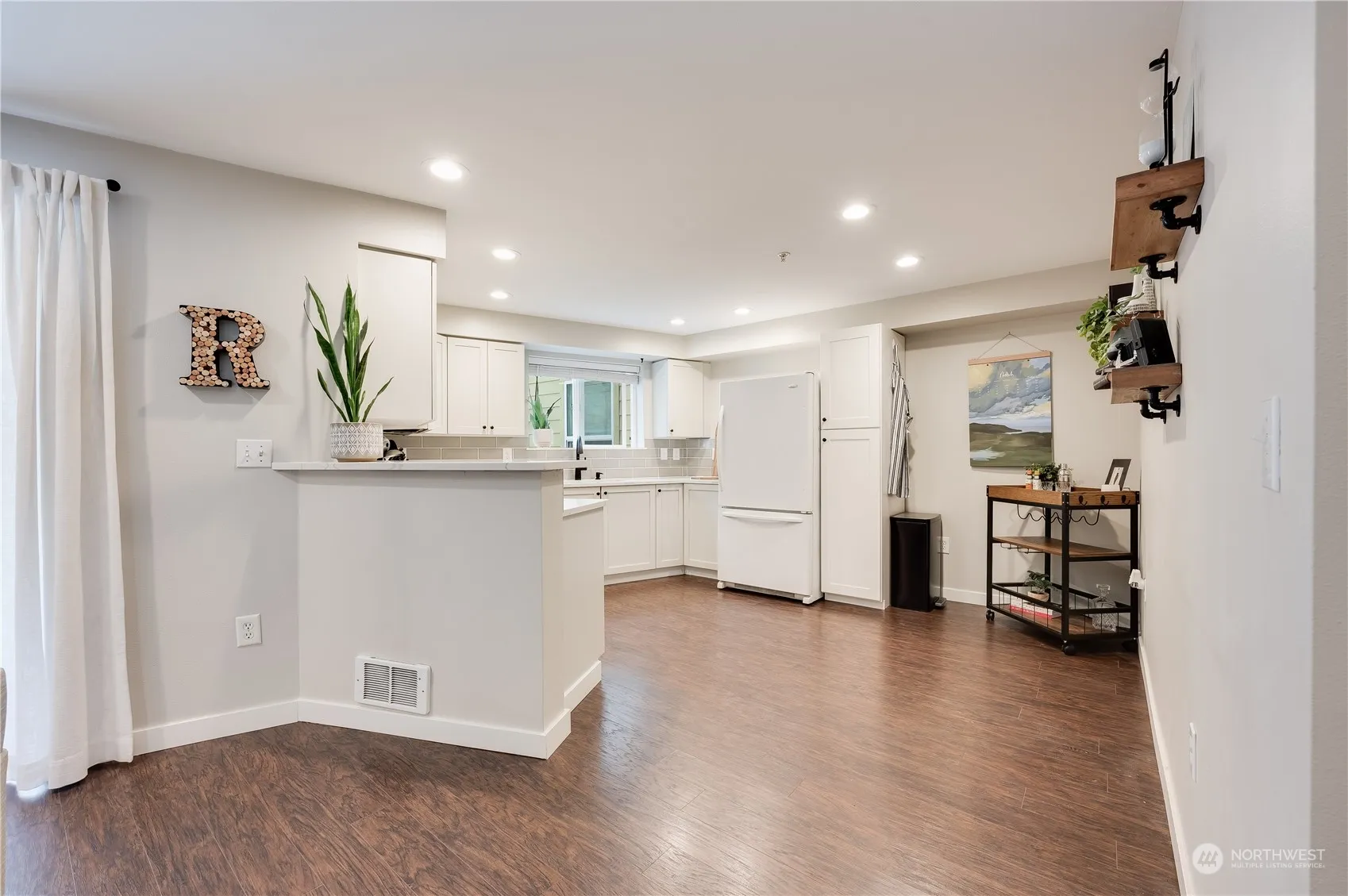 Welcome to the Overlook at Juanita Bay. This ground floor, ADA accessible unit features open floor plan (no access stairs & an elevator to parking garage!). Expansive, remodeled kitchen w/quartz countertops, eating bar & breakfast nook. Large primary bedroom w/ensuite three-quarter bath & oversized closet. Secondary bedroom for guests or an office for working from home. Full secondary bathroom, in unit W/D, electric fireplace & covered patio space to relax during these upcoming summer months. Complex amenities include community courtyard, gated garage (2 reserved parking spots, 1 ADA size), extra storage locker w/unit & new facia on the exterior. Across the street from Juanita Village & close to Juanita Bay Park. Healthy HOA/Reserves.