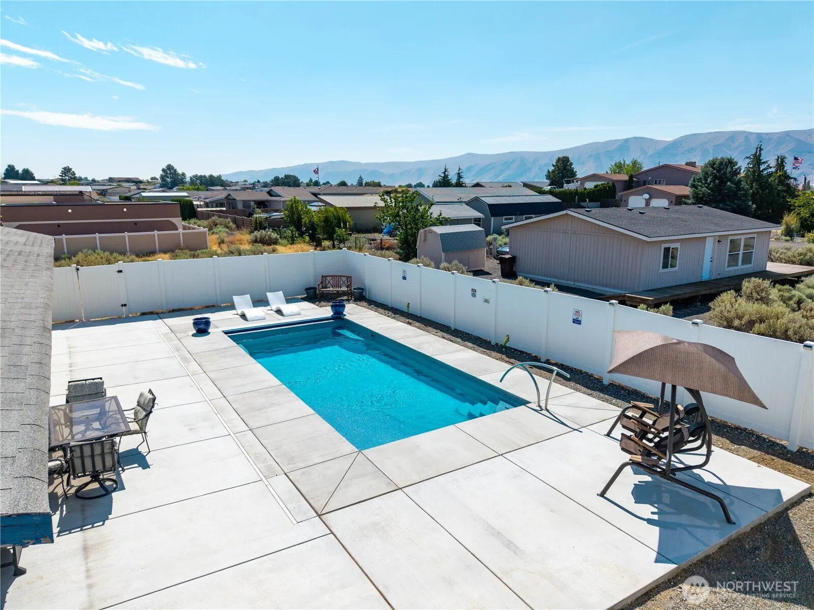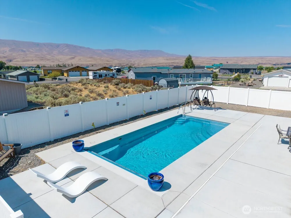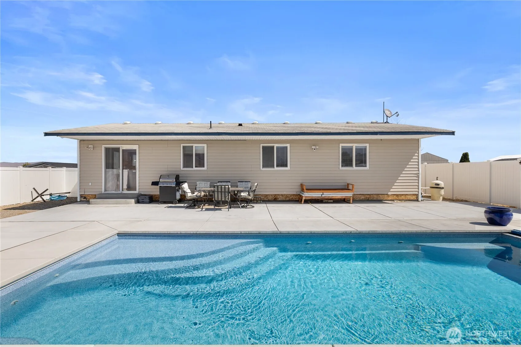 INGROUND POOL! The sellers have replaced the siding with premium James Hardie siding and a beautiful paint palette + new garage door. The home had a new Heat Pump recently and a new front door. Home is an excellent choice as a year-round residence or a week- end escape. With 3 bedrooms and 1 3/4 baths, there is room for guests. Appliances & home security cameras included. Backyard features a 14’x30′ inground swimming pool and 6ft vinyl fence for privacy & security. Front yard is low maintenance with the tasteful use of landscape rock and gravel. Enjoy all of Desert Aire’s amenities (golf, boat launch, tennis/pickle courts, proximity to Gorge Amphitheatre) BACKSIDE PHOTOS ARE PRIOR TO THE NEW SIDING.