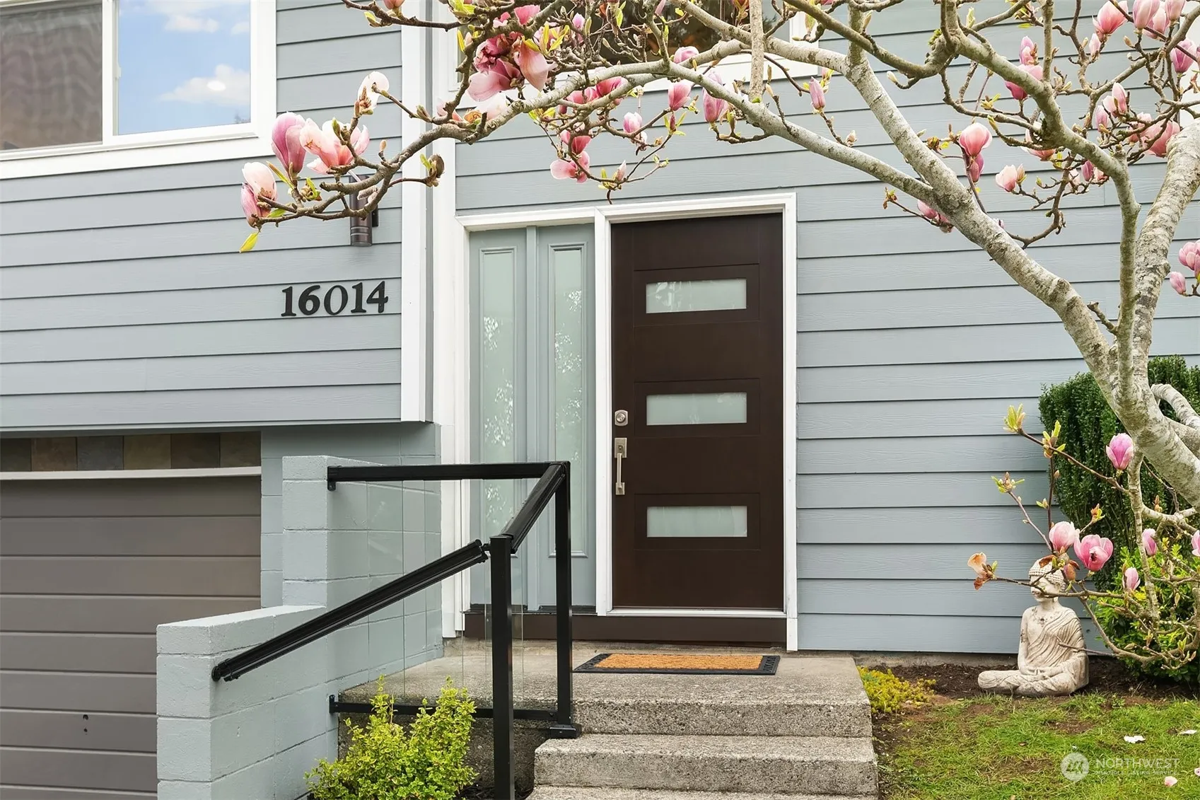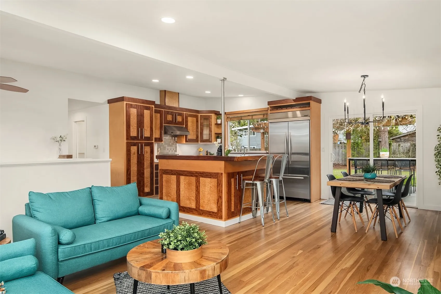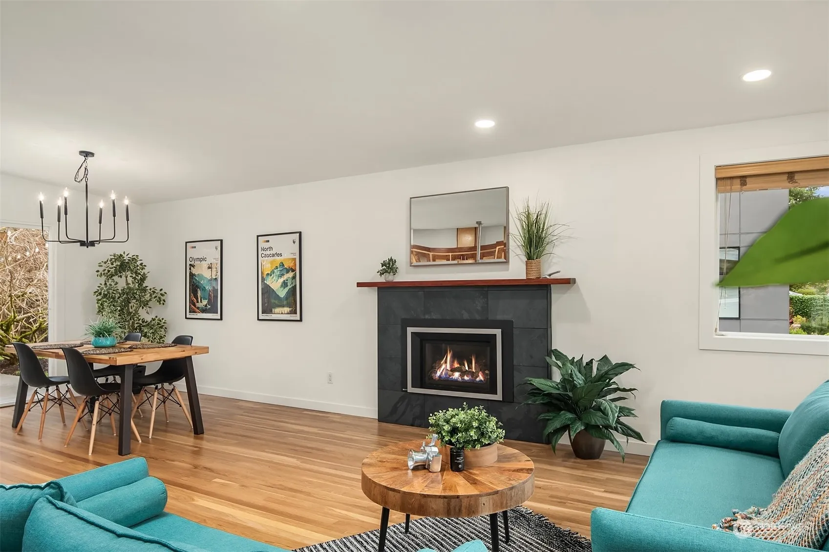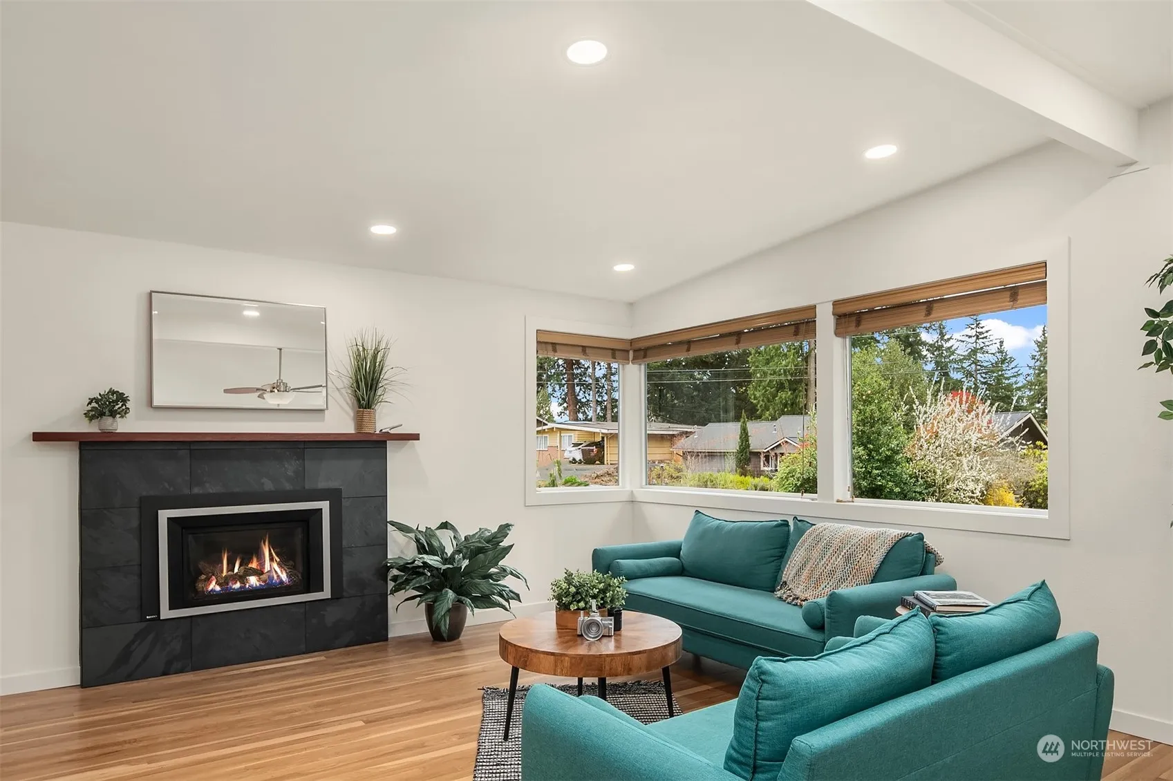 Lake Hills Mid-Century Modern Mid-Entry Rebuild. Sun-filled, SW-facing, vaulted-ceilings, open floor plan. Walk-out to large patio & rare large flat fully-fenced backyard. Custom kitchen exotic wood cabinets/bar, bright-white quartz counters/tall backsplash, pro Viking range & gas fireplace. So much BRAND NEW– Front door, hardi-siding, ex/interior paint, refinished oak hardwoods, trim, solid core doors & lighting. Tropical themed primary bath & vintage-styled hall bath w/heated floor. Lower-level Rec Room w/plush carpet & fireplace, half-bath/laundry room & 2 car garage. Copper/PEX plumbing, gas furnace & A/C. Central location between I-90/405, quiet street, walk to Lake Samm, parks, shopping & award-winning Bellevue schools. Welcome home.