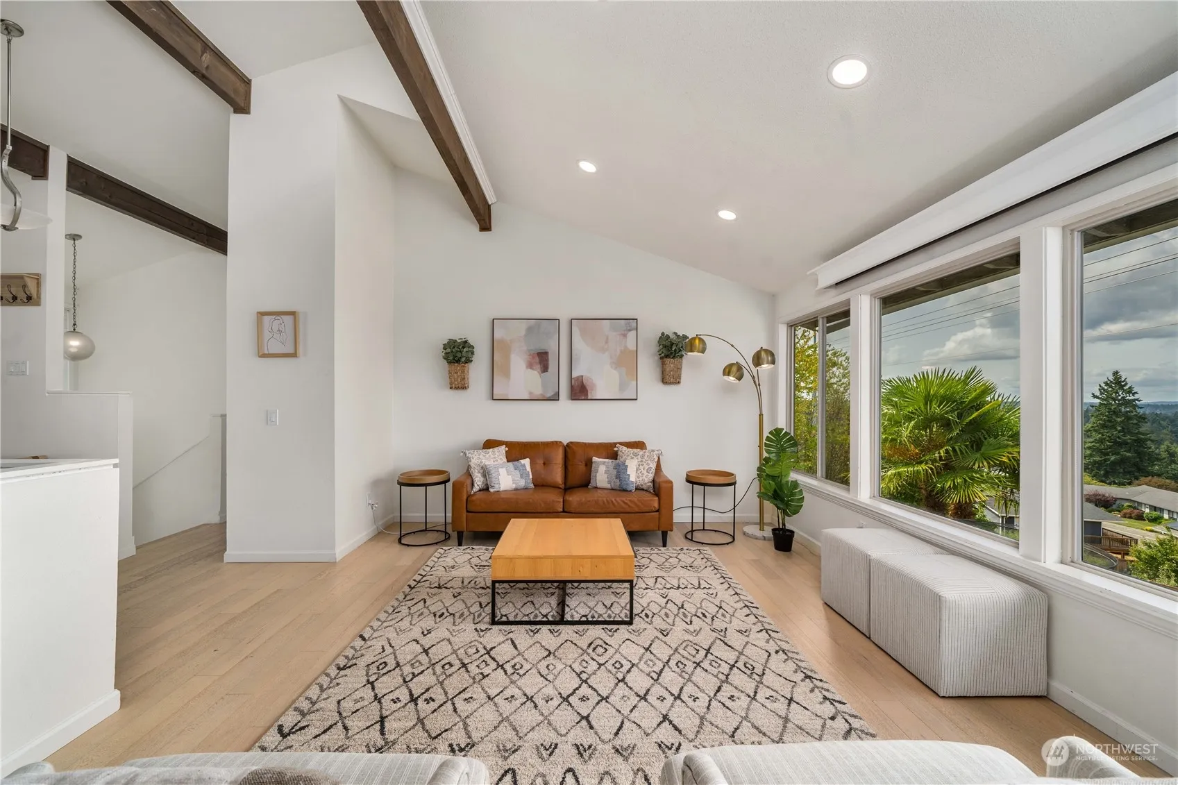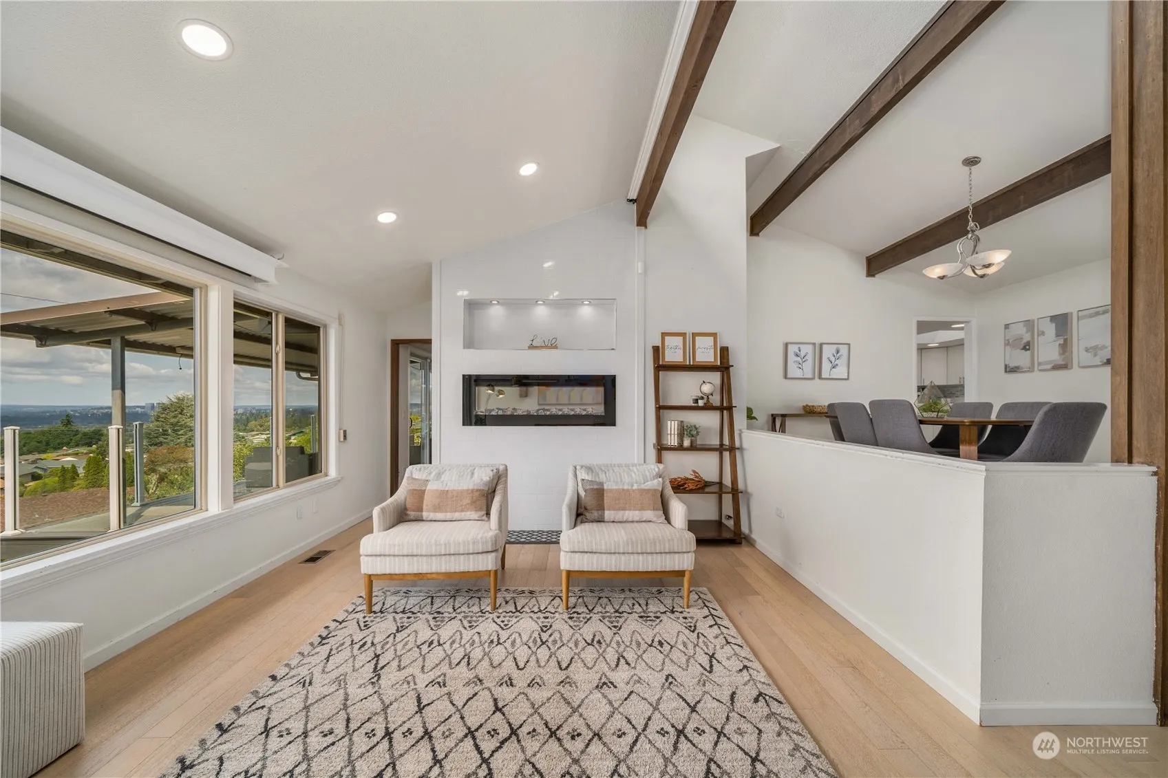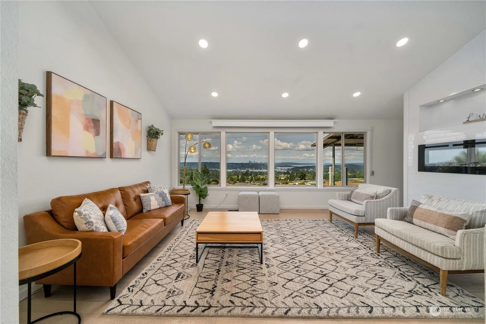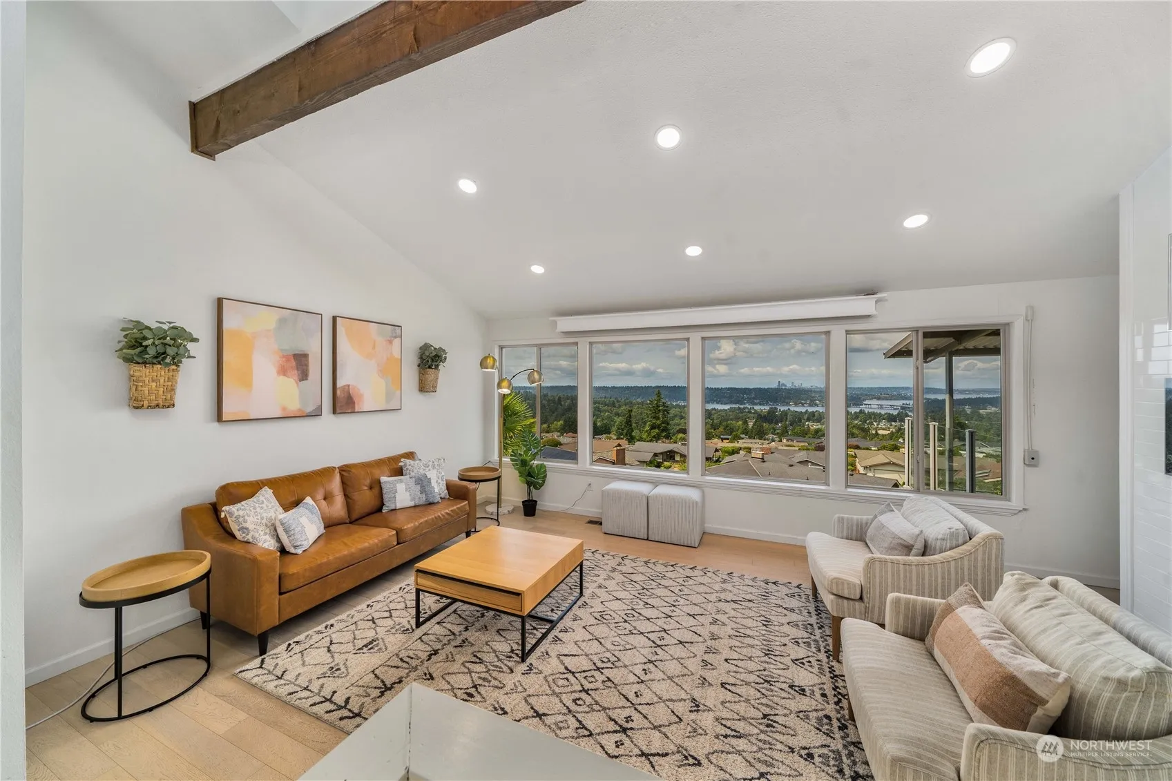 Panoramic views of Lake Washington, the Olympic Mountains, the city of Seattle, and Bellevue grace most rooms in this spacious, quality-built Lozier home. The master bedroom is conveniently located on the main floor. Formal living and dining rooms, and a family room with fireplaces, feature vaulted ceilings and clerestory windows. The bright, skylit kitchen with Corian counters and a new stove overlooks the family room and opens to a covered, large deck and patio. A tremendous terraced lot is adorned with figs, plums, and grapes. There are four fireplaces in total, providing cozy warmth throughout. Ample storage is available. The home is located on a quiet street. Top-rated Bellevue schools add to the appeal of this stunning home.