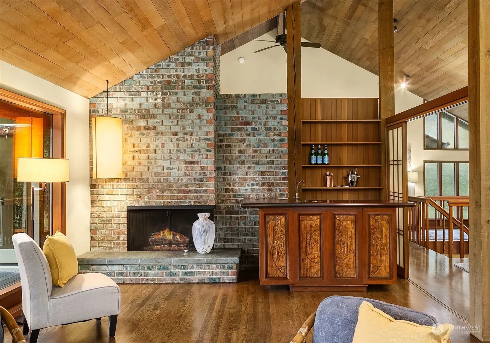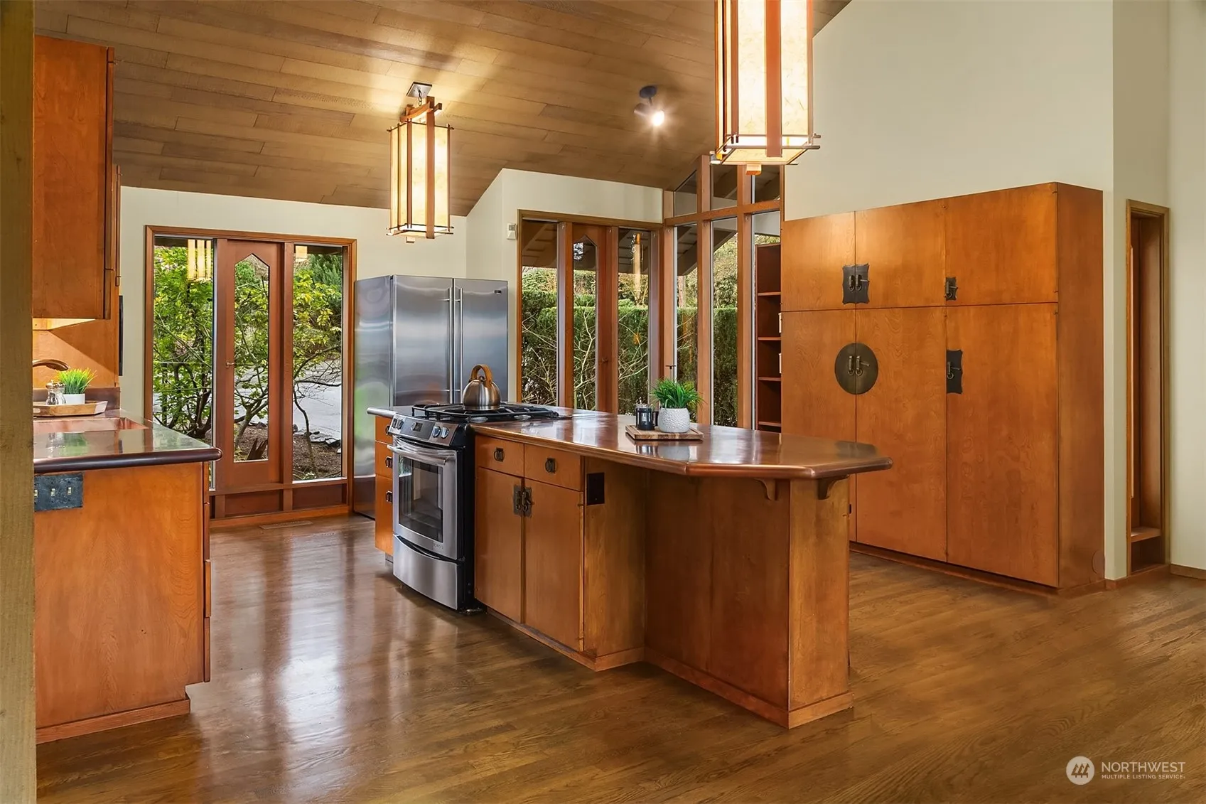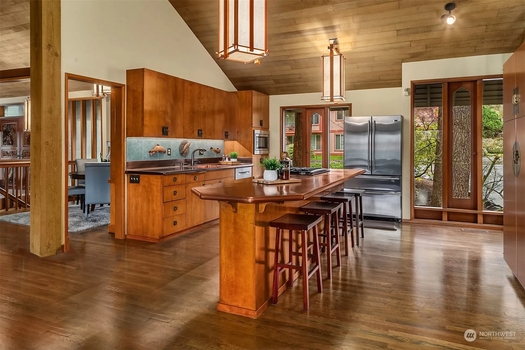 Incredible Northwest Contemporary home with an ideal location in Bellevue. The home features 3,047 sqft, 4 bedrooms, 2.75 bathrooms and backs to a greenbelt. Great room concept with wet bar, vaulted cedar ceilings, and walls of windows facing the greenbelt. The kitchen has a large center island, copper countertops, and stainless-steel appliances. The spacious primary bedroom has an ensuite updated bathroom. The main level has a dining area with built-ins, living room with fireplace, second bedroom/office, full bathroom & hardwood floors. The lower level has a kitchen, two bedrooms, full bathroom, family room & wine cellar. There is also an entertaining sized deck, large 2 car garage, fenced backyard, patio, shed. Bellevue School District.