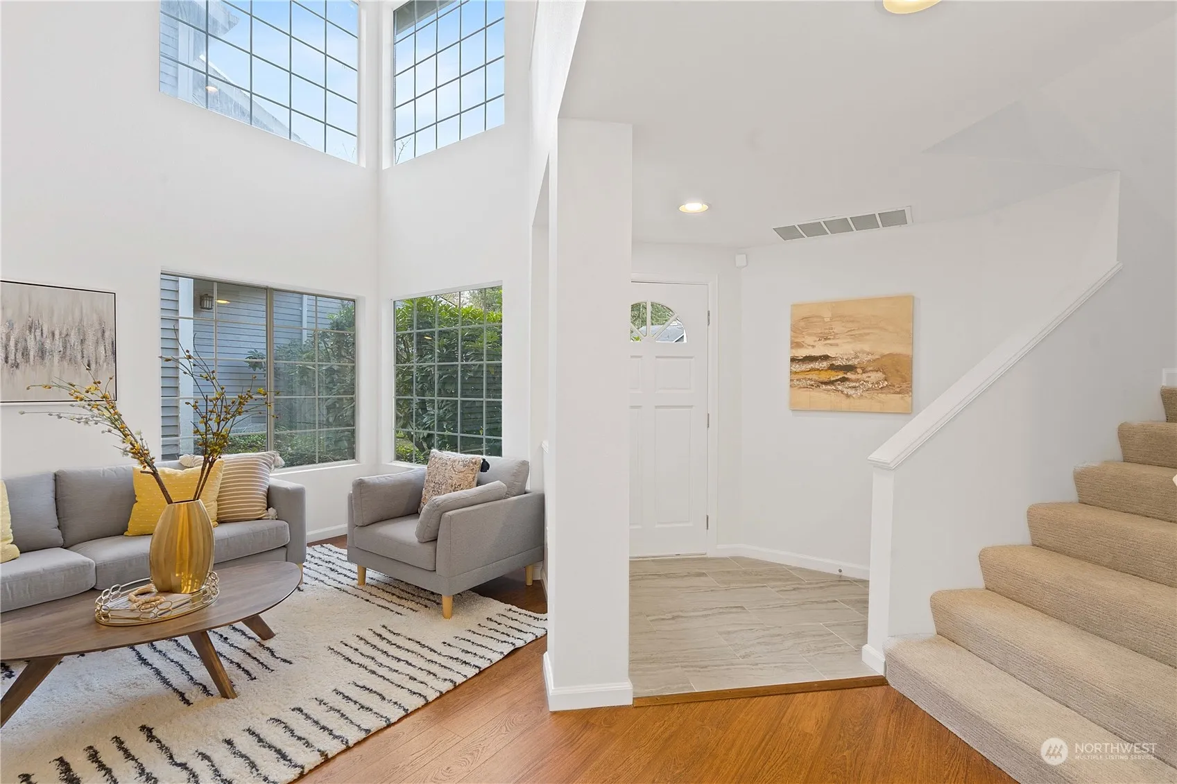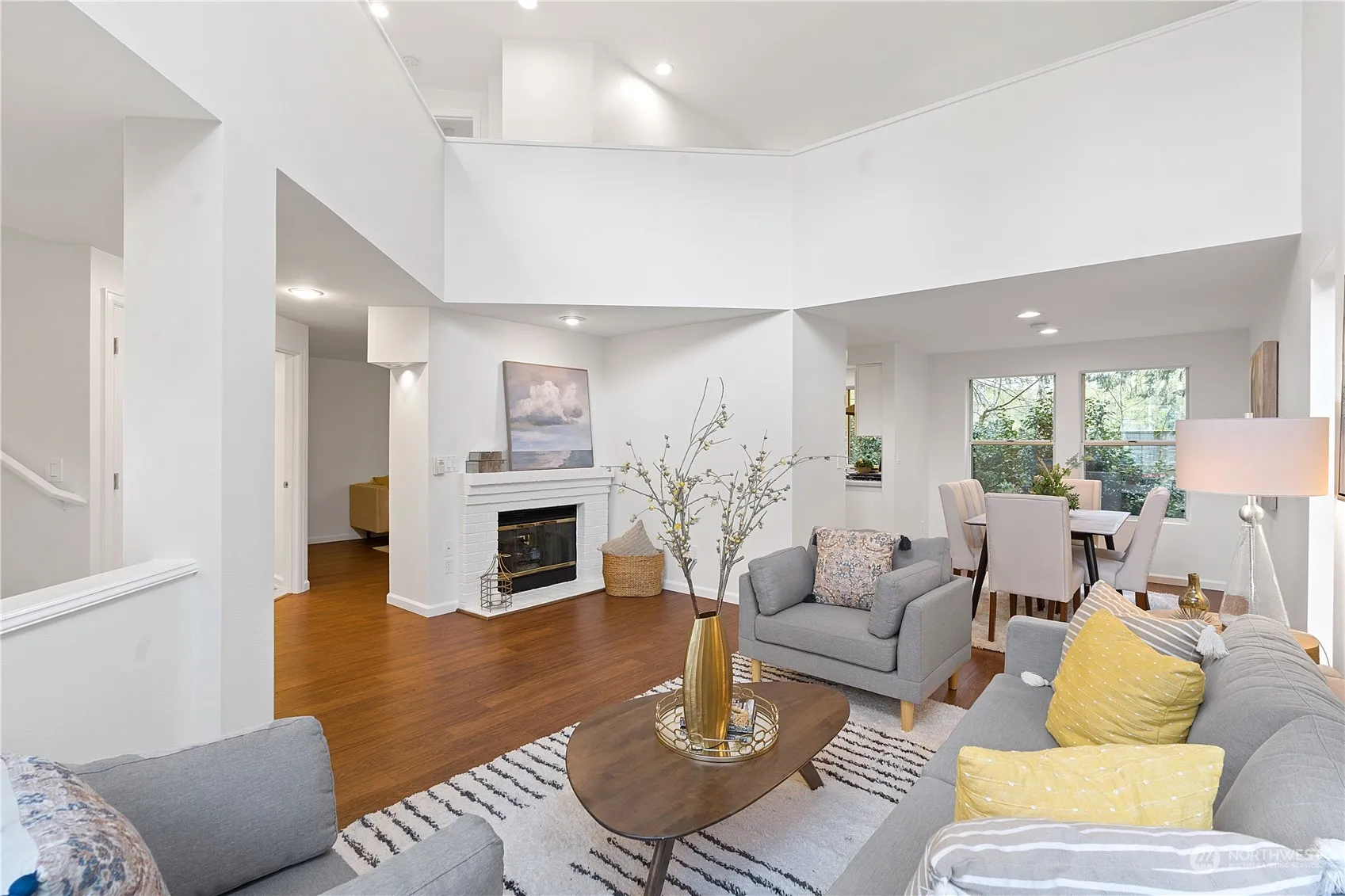 Incredible location: Riva Chase! Welcome home to this charming 2 Bd,2.5 baths, gem nestled conveniently close to Main St. shopping plaza. Oversized living room boasting a magnificent 2-story vaulted ceiling. Remodeled kitchen with quartz countertop, white cabinets, stainless steel appliances, and raised breakfast bar. Cozy family room off kitchen with double-sided fireplace and slider to the patio and the private backyard. Spacious master suite w/5 piece bath & walk-in. Versatile open loft area / possible den or 3rd bedroom.New carpet, fresh paint.One-year-heater and H Efficiency furnace. Heat pump for Cool/Heat.Healthy HOA.Within minutes commute to downtown Bellevue & all Eastside amenities. Pets OK. No rental cap.Bellevue School District.