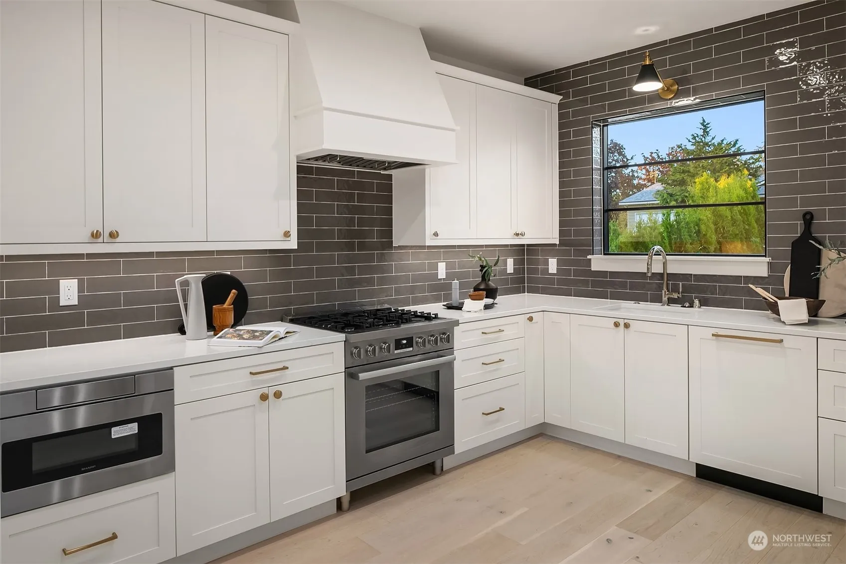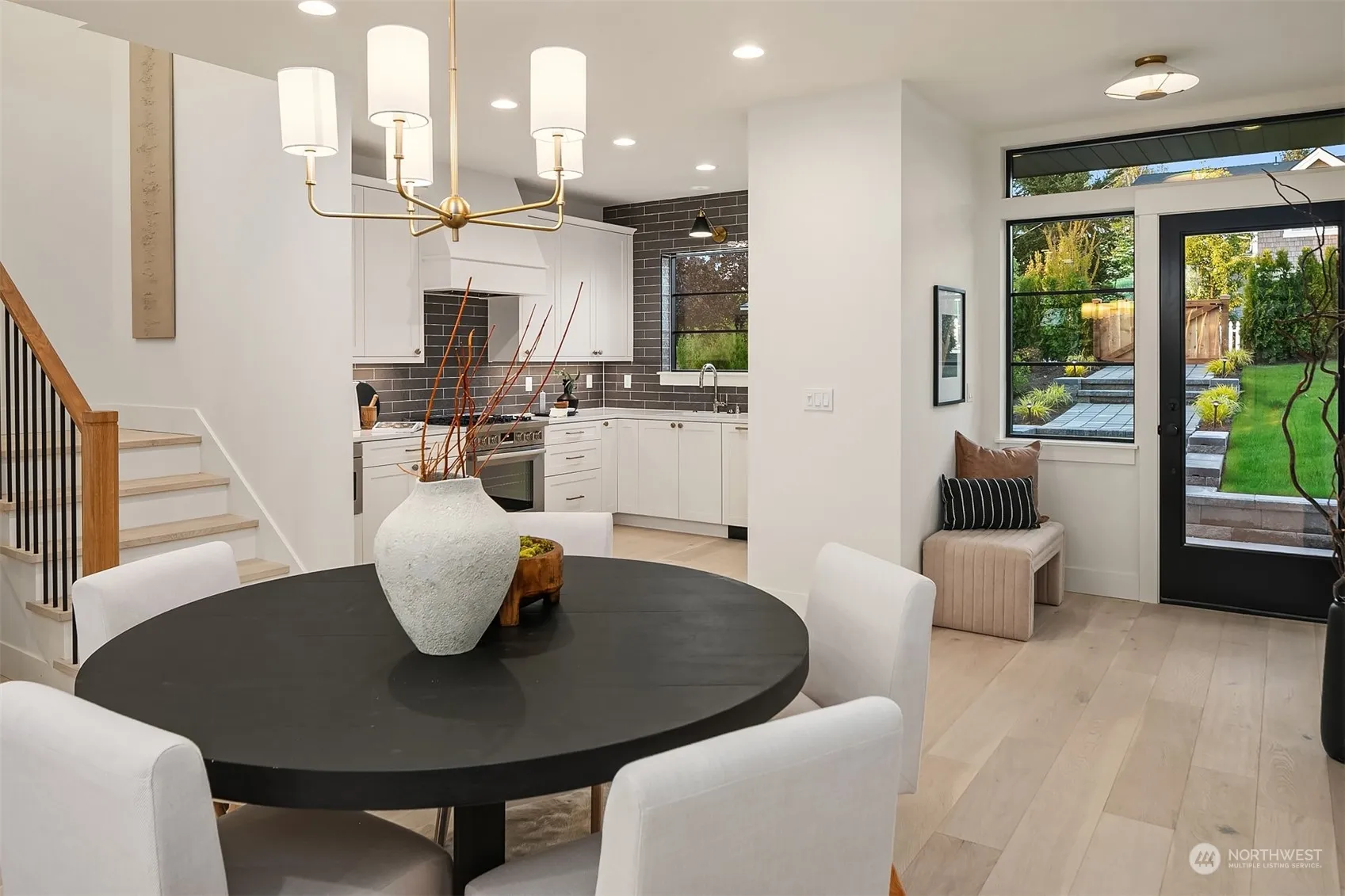 Designer finishes. Light and bright interiors. Conveniently located in the coveted West of Market neighborhood. Greeted with tons of natural light, the spacious great room opens to a private patio and fully-fenced yard. The stylish all-white chef’s kitchen features full tile backsplash, quartz countertops and Bosch paneled appliance package including a 5-burner gas range. Upper floor you’ll discover two en-suite bedrooms with vaulted ceilings and utility room with stacked Electrolux w/d. For comfort + convenience you’ll find smart home features include a Ring doorbell, Ziply fiber connected, wired for security system and an EV charger for off-street parking spot. Experience easy living + walkability to dt Kirkland and Waverly Beach Park.