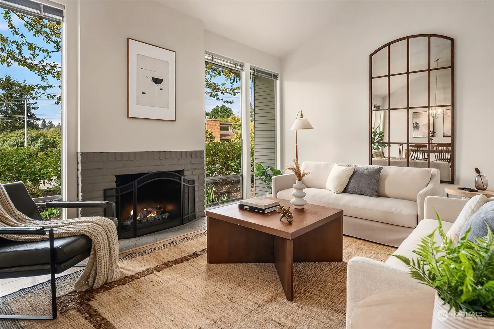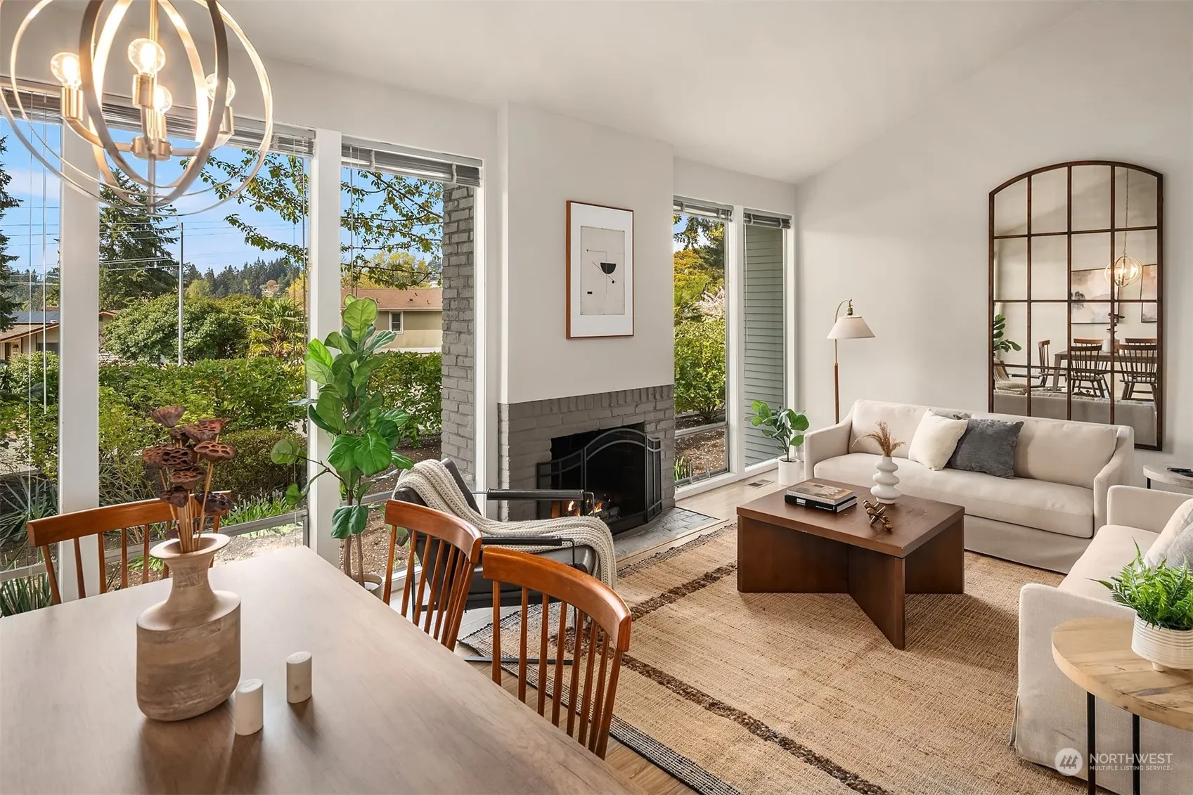 College Hill Contemporary set on a private, corner cul de sac lot. Bathed in western sunlight from floor to ceiling windows in living room & dining room with wood burning fireplace. White on white kitchen with stainless steel appliances, granite counters with butcher block eating bar. Kitchen flows to second eating area or family room, sporting sliders to rear patio and fenced yard. Main floor bedroom has double closet, with a full bath connector. Three generous bedrooms upstairs, plus full bath w/ granite counters & tile tub surround. Excellent location with quick access to I-90, Factoria and Bellevue College.