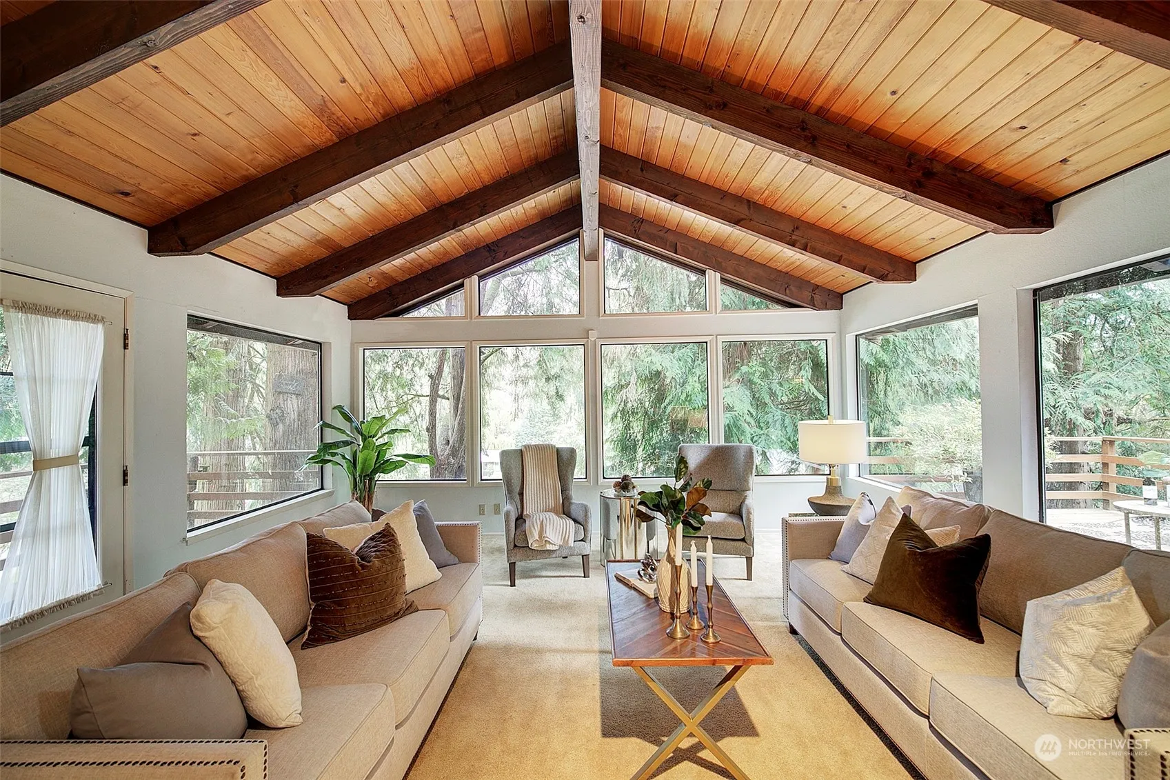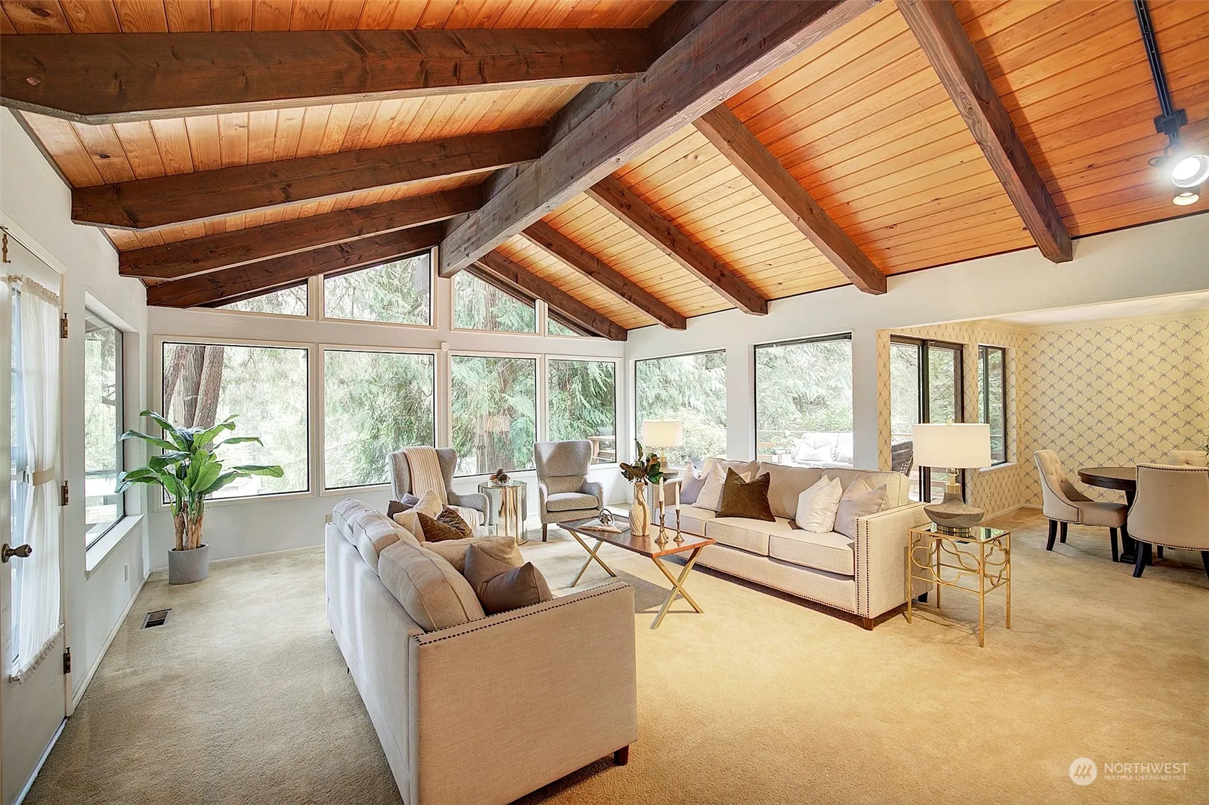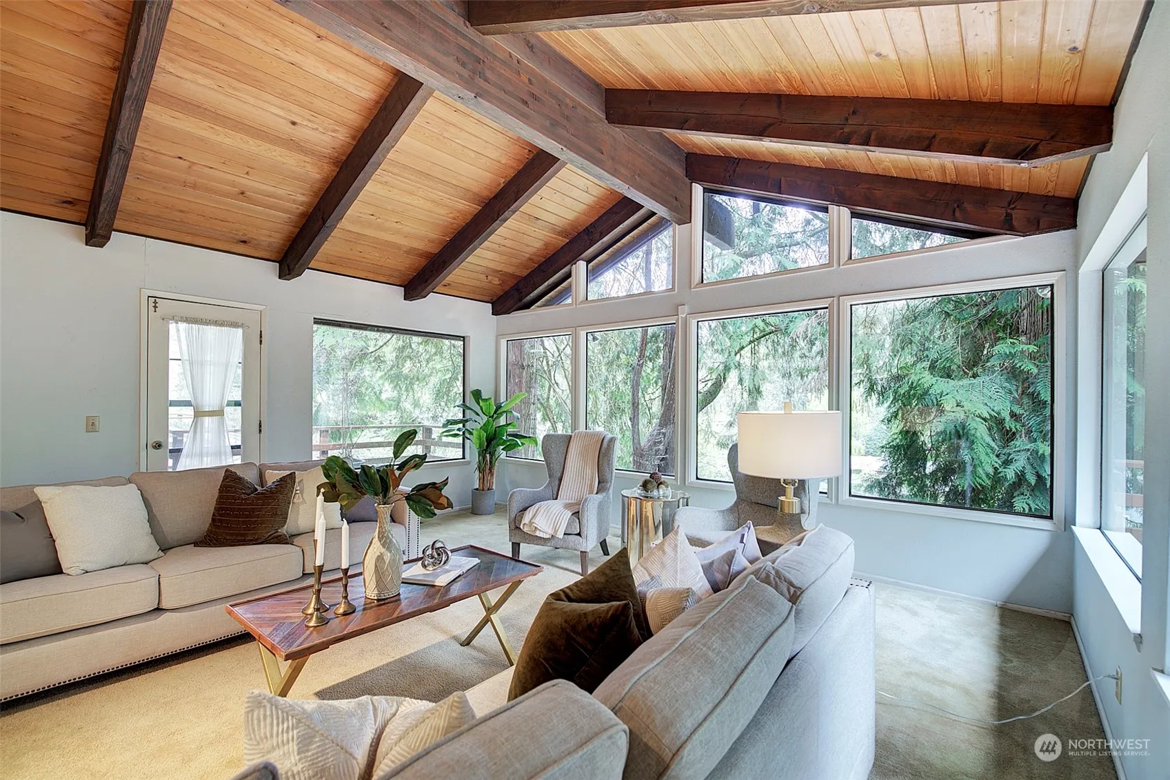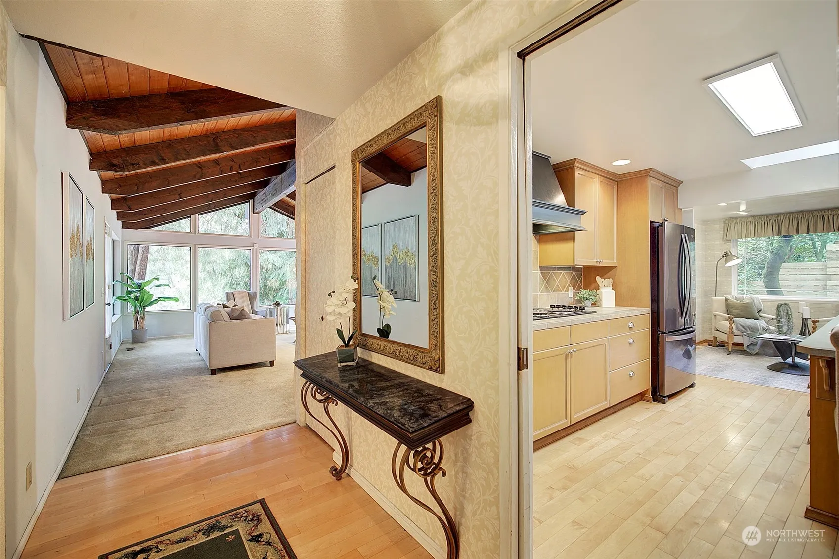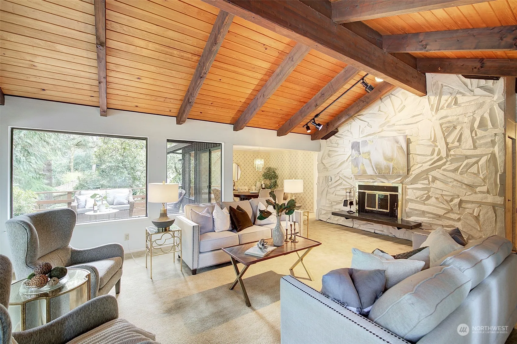 Welcome to the ‘tree house’! Enjoy forest bathing without leaving your living room. Vaulted ceilings frame your view over five different decks. Beautifully remodeled kitchen with maple cabinets, under-cabinet lighting and 5-person eating bar. Adjoining sitting area complete with personal sized gas stove. Two bedrooms on the main level with remodeled bath, plus the roomy primary suite. Lower level features a large rec room with fireplace, one large bedroom and another bedroom with slider to the lower deck. Remodeled 3/4 bath off the hall plus a full bath off the smaller bedroom. Amazing neighborhood close to Kelsey Creek and Wilburton Hill parks and Botanical Garden, downtown Bellevue, and the new Wilburton light rail station.
