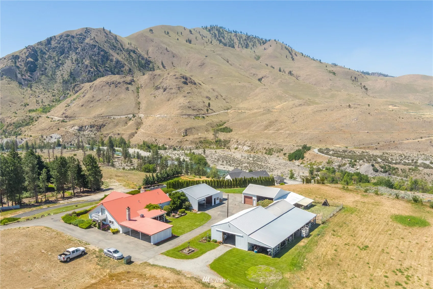 Motivated Seller – Optimal Urban Country living bordering the Chelan River Gorge – showcasing a 3+bed/3bath, 3,780sqft remodeled ranch-style home w/ a MIL on 1+ acre w/ multiple buildings. Shop #1 = 2,432sqft w/ 1,620sqft carport (100amp/ powered door), shop #2 = 1,475sqft w/ 615sqft carport (100amp/powered door), shop #3 = 1,440sqft (60amp), cabin = 132sqft (w/ power). Property offers ultimate privacy, tons of flexibility, and is highly suitable for a contractor or someone that is needing ample storage. Take in views from all directions of the Butte, Chelan River, the lower Lake Chelan basin, and west-facing mountain ridges. No better value in the Valley than this once-in-a-lifetime opportunity. Chelan River Irrigation offered to Property.