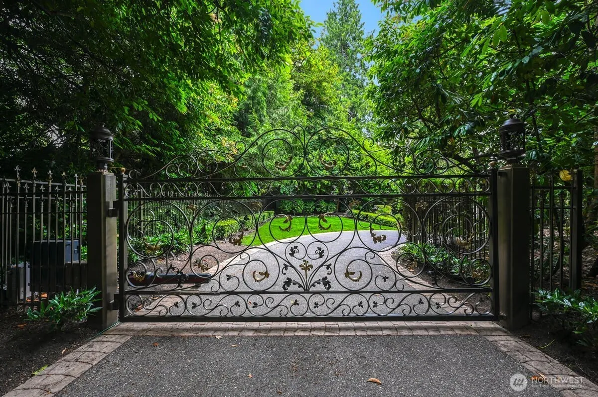 A distinctive gated estate in one of the nation’s most coveted neighborhoods. This Mediterranean-style residence features cathedral ceilings, Italian columns, and French doors opening to serene patios and a 200-ft dock with year-round moorage. Gorgeous wrought iron railings, crystal chandeliers, and a whole-house sound system add to the refined ambiance. Each bedroom is an ensuite. Downstairs offers relaxation with a wine cellar, spa, cold bar and terraces. Chef’s kitchen is outfitted with brand-name appliances. Curved design flows through the lush, landscaped grounds of this Lake Washington shore house. Mature trees, vibrant blooms, and curated shrubs welcome visits from blue herons and bald eagles. Fountain, BBQ island, firepit, dog run.