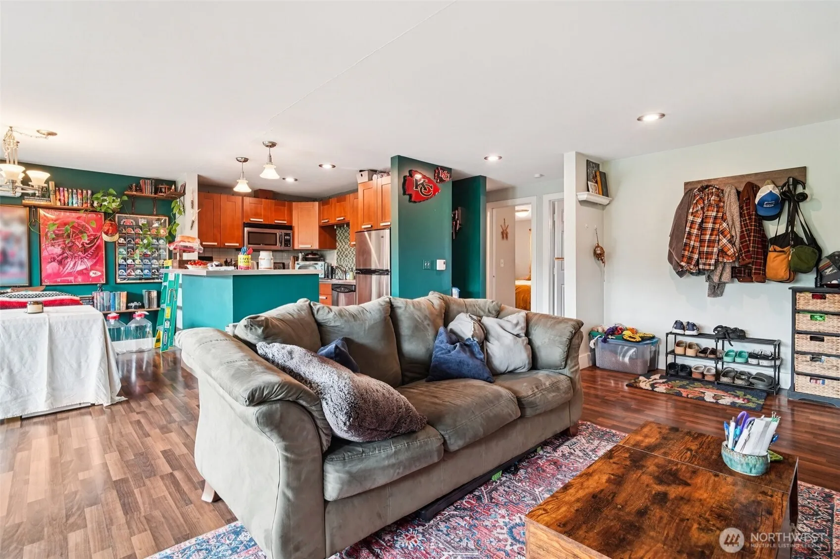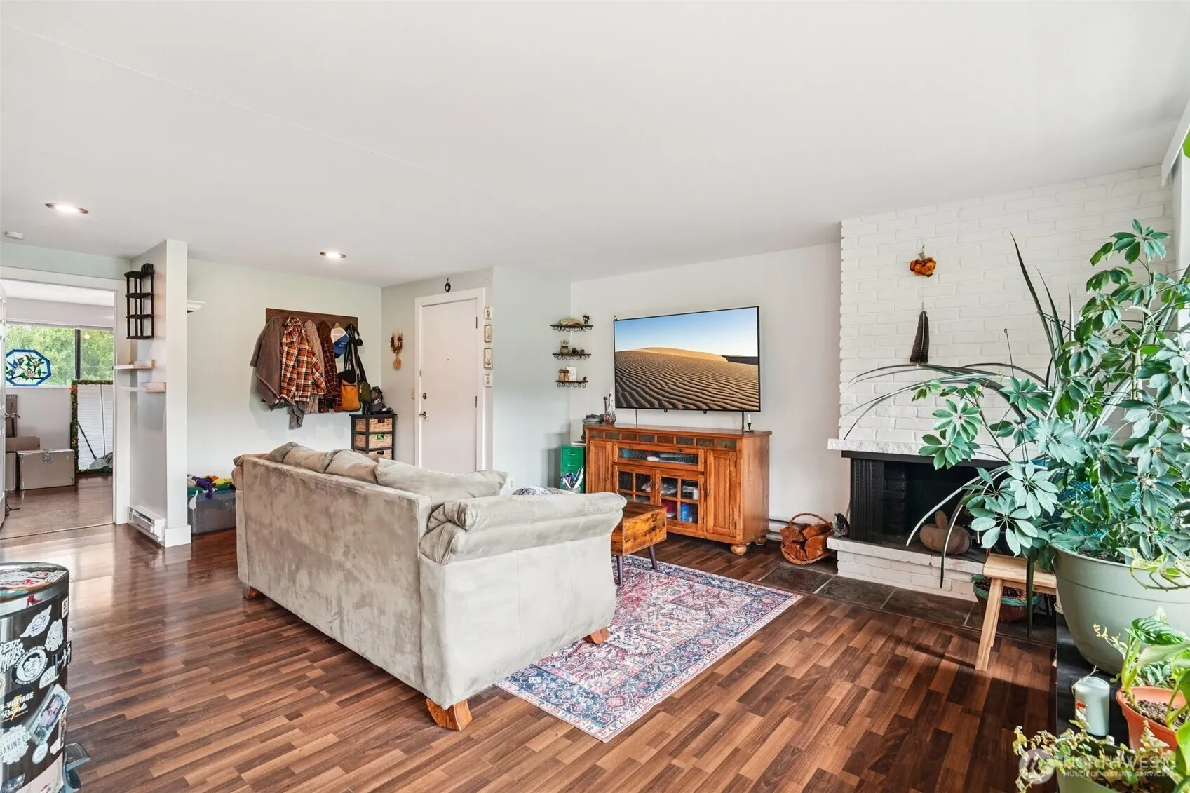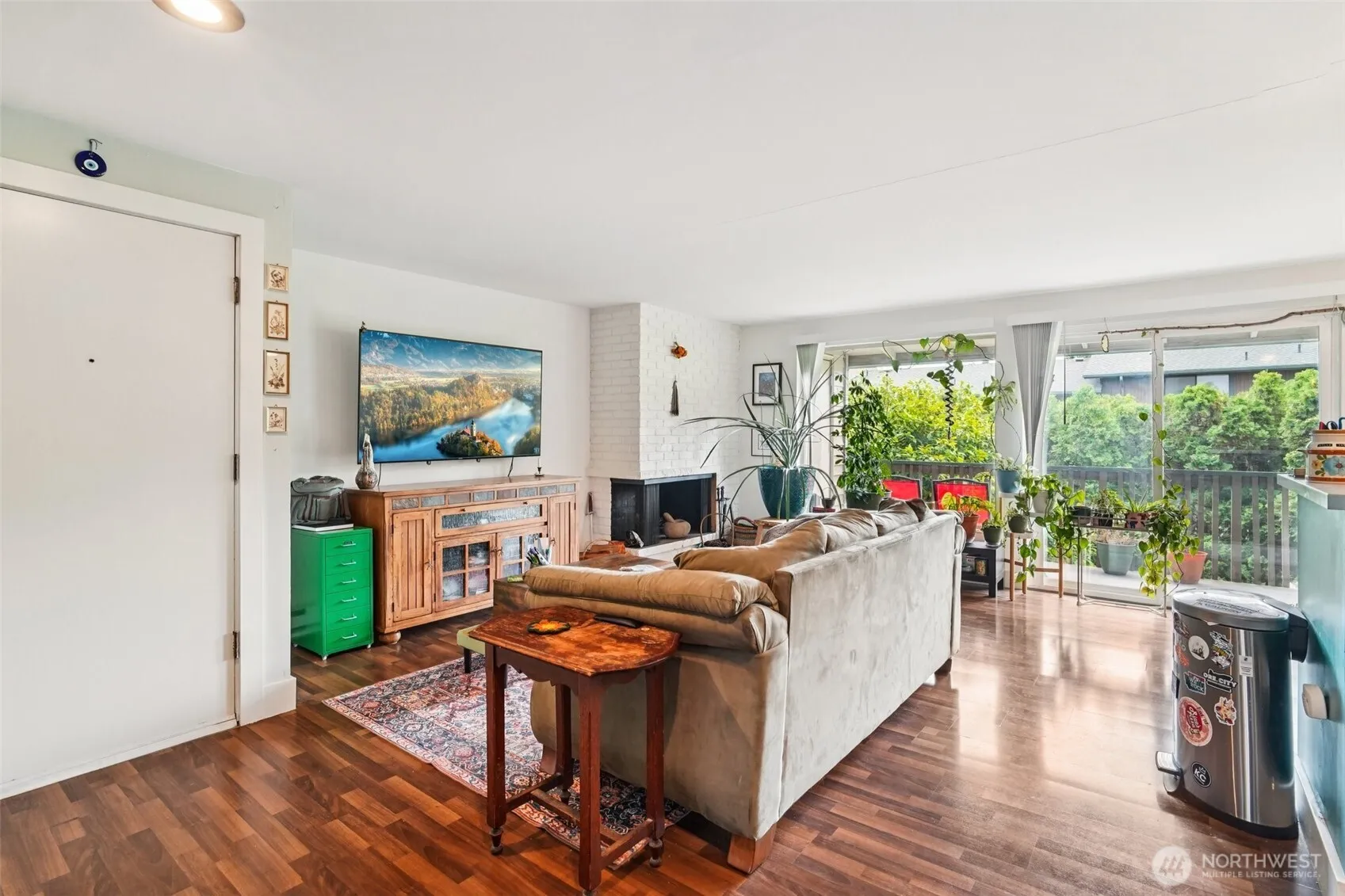 This open-concept home, which features two bedrooms and one bathroom. The spacious dining area, located just off the kitchen, includes an eating bar—perfect for a quick morning coffee. The living room is filled with natural light and features a cozy wood-burning fireplace, ideal for relaxing and enjoying the ambiance. The kitchen is equipped with beautiful cabinets, offering plenty of counter space, cupboards, and drawers to store all your cooking gadgets. Outside, you’ll find a large patio, perfect for entertaining and offering privacy thanks to the surrounding nature. The home also includes two assigned parking spaces, with one conveniently located directly across from your front door.