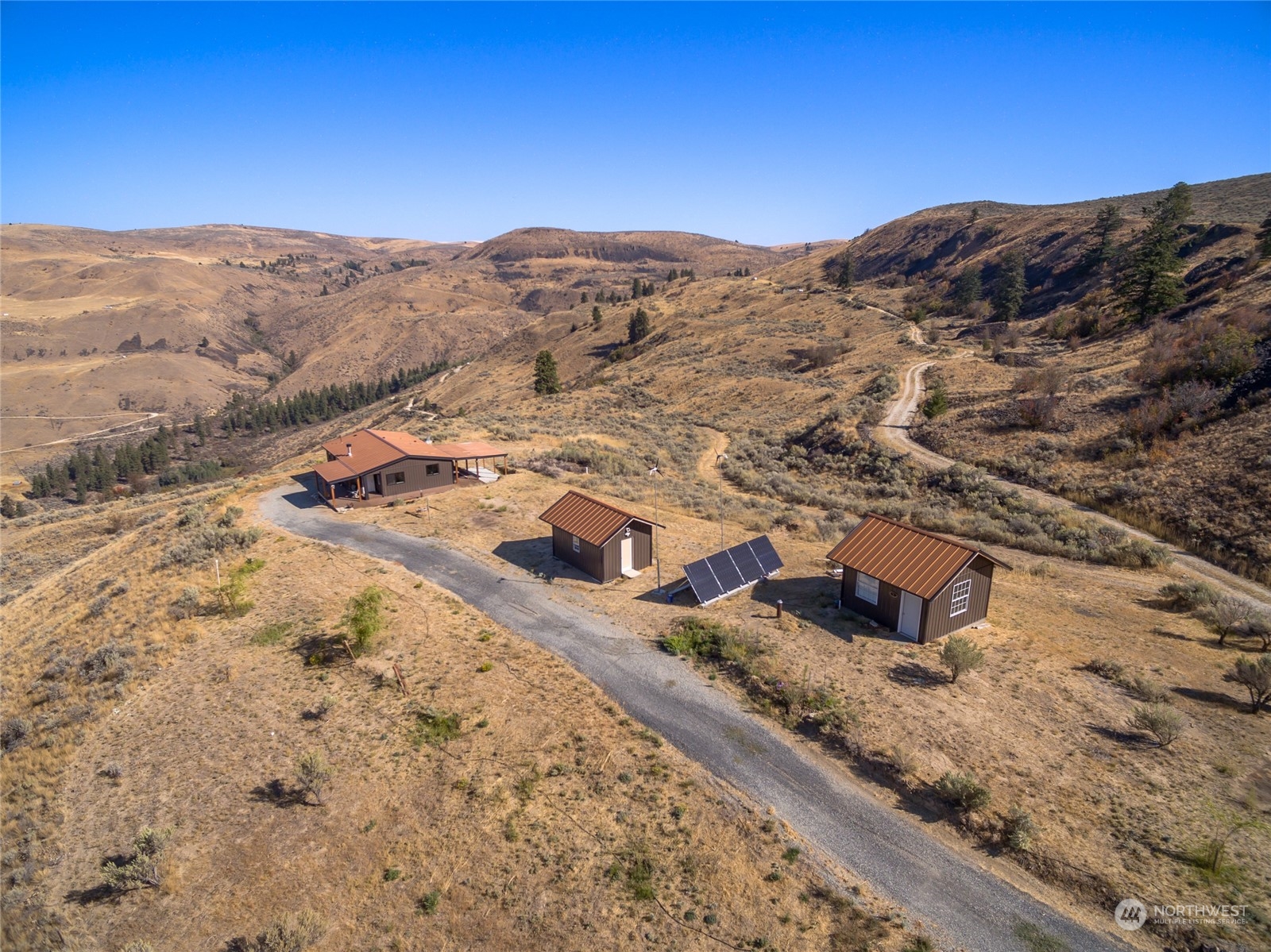 Dream Off Grid home with top-of-the-world views. Enjoy your morning coffee with panoramic views of the Columbia River, Lake Chelan, and Chelan Valley all the way to Stehekin. Remodeled 1100+ square foot home boasts large open kitchen, living and dining with wood stove, vaulted ceilings and new stainless appliances. New flooring and new paint throughout. Home is powered through solar and wind energy and heated with a wood-burning stove and propane furnace. Well offers 2,000 gallon cistern for additional water storage. This stunning 20 acre property also features 2nd level building site with room to expand. Peace, privacy and unbelievable views await you!