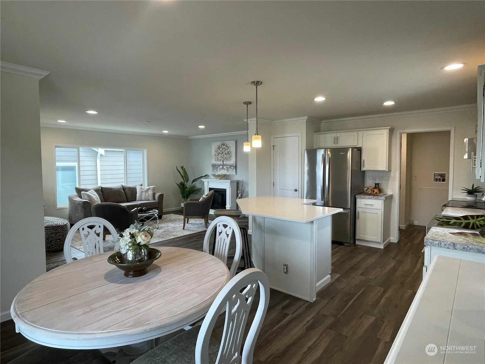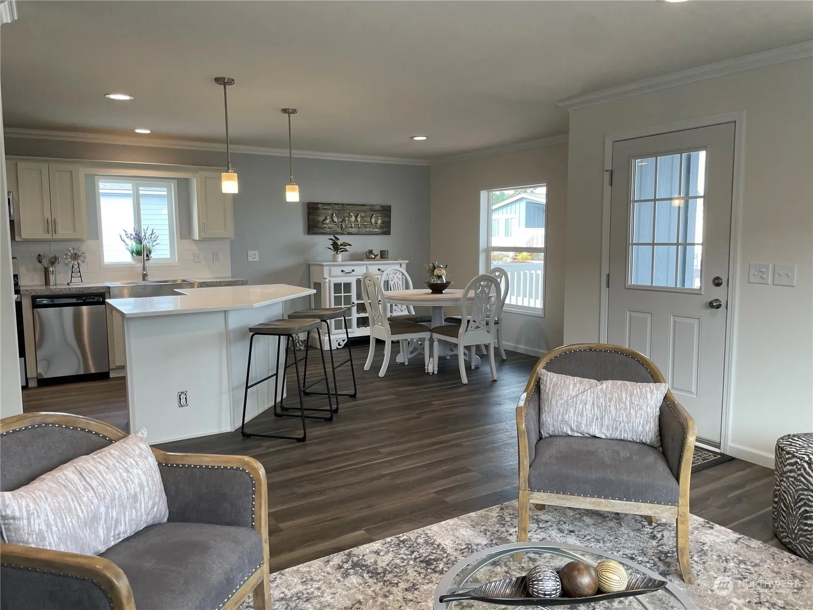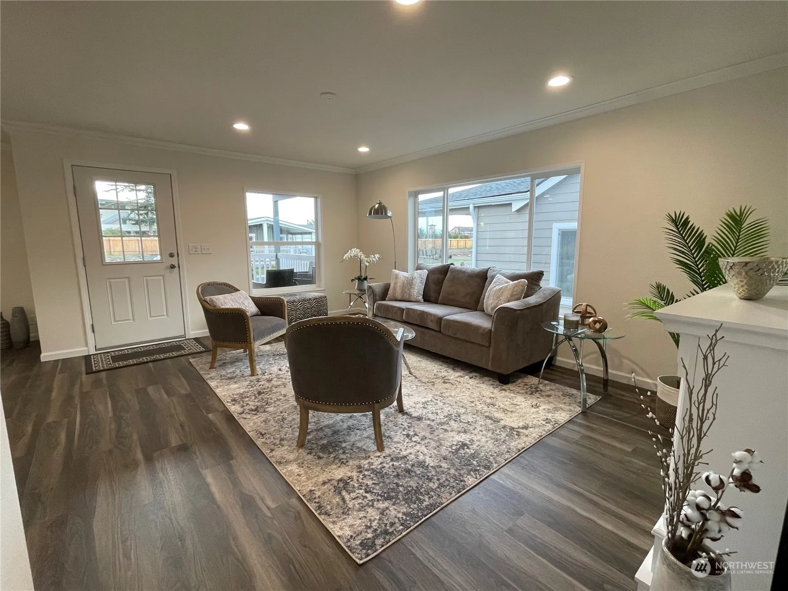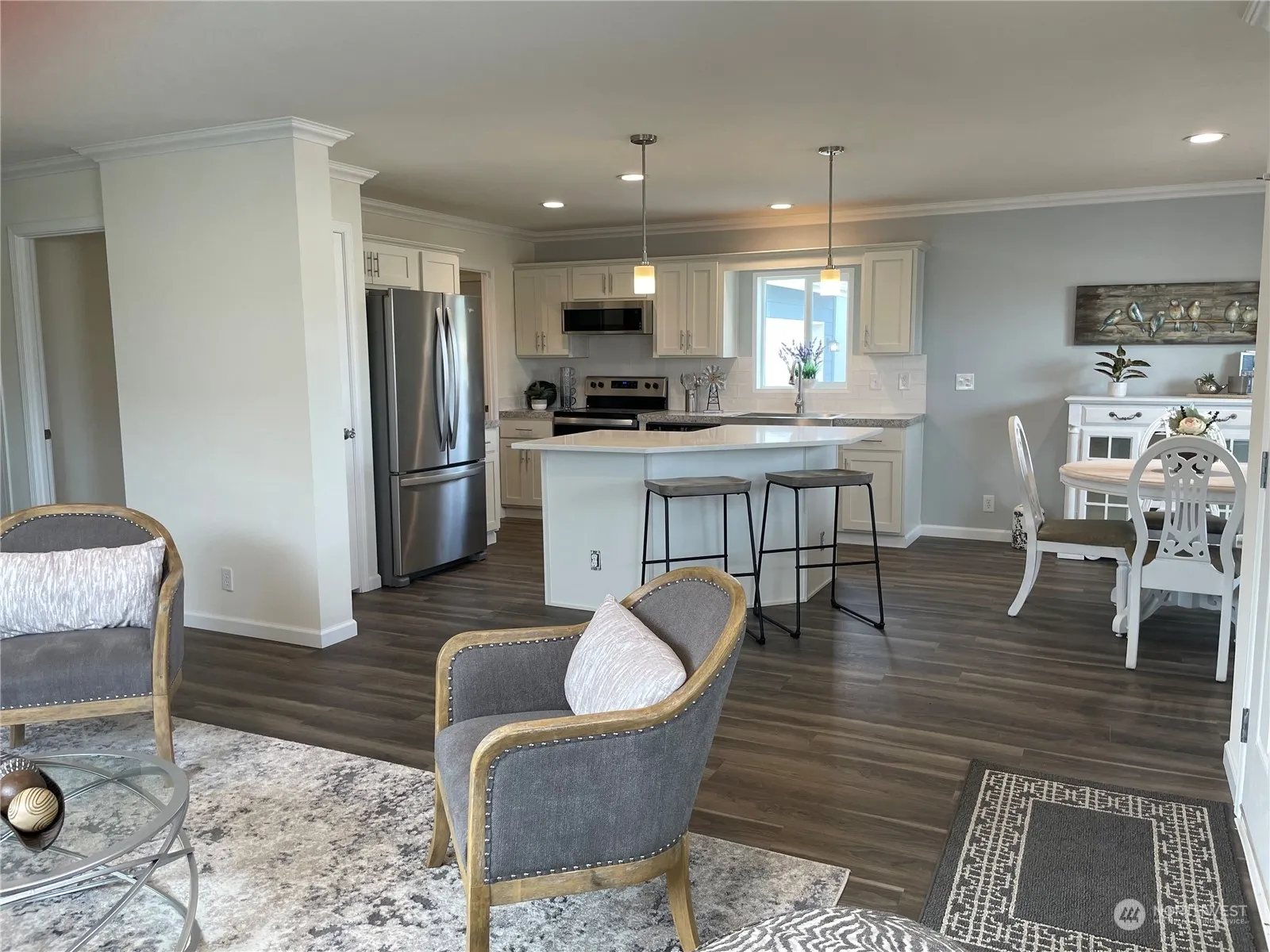 Offering a double buyer bonus of $6000, on this home and a few other select homes, limited time. HUGE front porch, attached 2 car garage, and beautiful exterior landscaping with irrigation in place. Inside enjoy the oversized farm sink, kitchen pantry, stainless steel appliances, island with bar, crown molding, tray ceilings with ceiling fans and plank flooring. Primary BR has double vanity, extra storage and walk in closet. Beautiful new home in sunny down town Sequim Experience Quality Community Living in Lavender Meadows. Within this private pet friendly, 55+ community, there are miles of interior sidewalks, pickle ball courts, horse shoe pits, bocce ball area, pocket parks, multiple dog parks and a club house all for residents use.