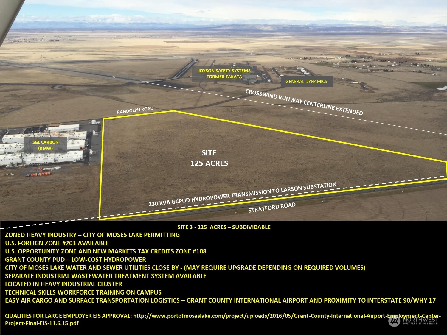 This 125 acre property is completely useable, has firm soils, in an Opportunity Zone, can be in a foreign Trade Zone and is near Grant County International Airport with direct access to I-90. All utilities are available including industrial sewer, but will need to be extended to the property. The property lies on the West side of Stratford Road approximately 5700 feet North of Tyndall and extends up Stratford for another 2900 feet. The property is bounded on the west by Randolph Road, it is fenced and it shares its southern line with the SGL Carbon property.