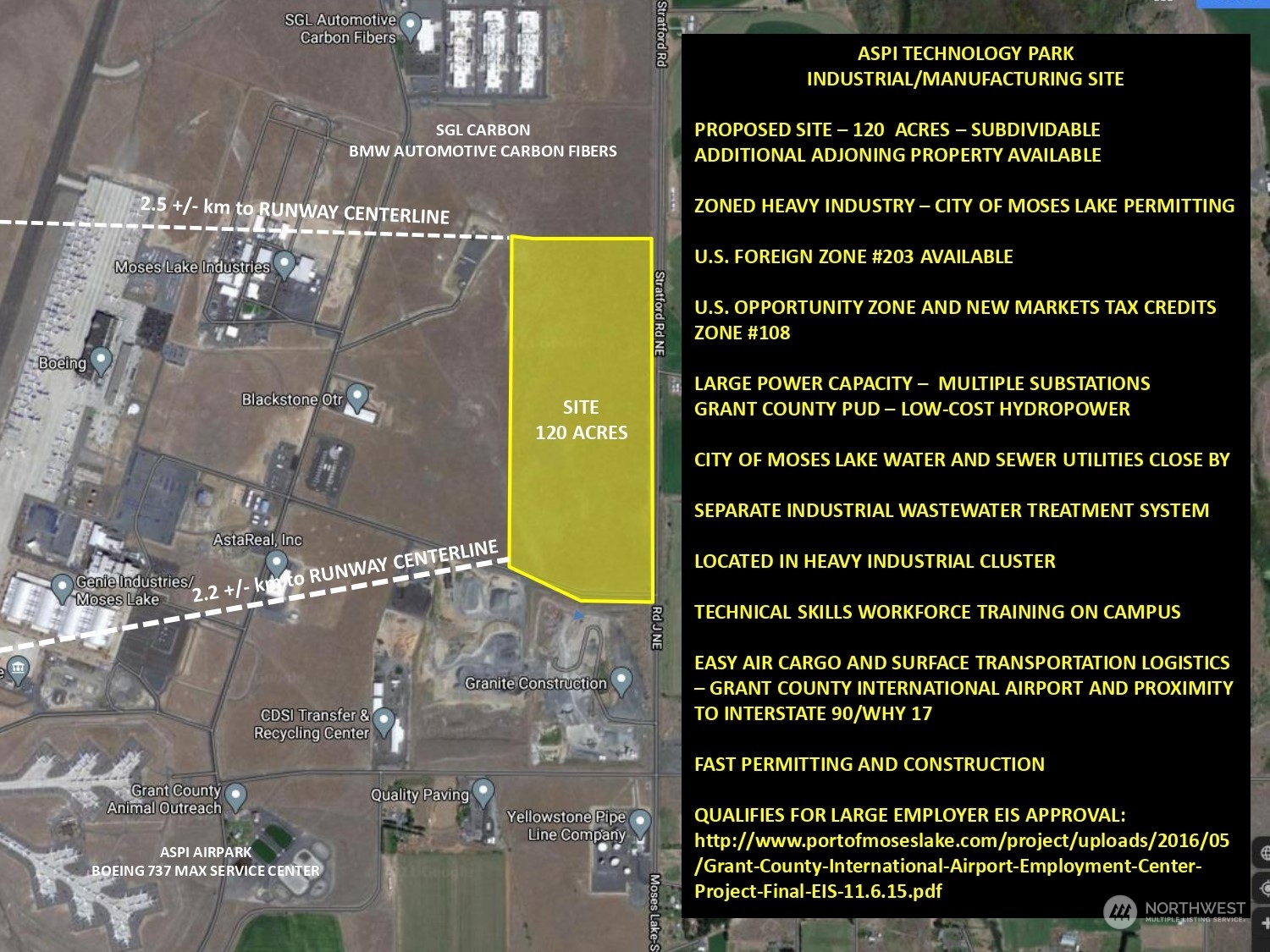 “ASPI Technology Park 120” The entire parcel is mostly level and has very firm soils. The land is all useable and as an added bonus is in an Opportunity Zone. Can be in a Foreign Trade Zone, as well. This property is across the intersection from the large Larson substation, is a few blocks from the Grant County International Airport, and can be served by the Port of Moses Lake’s industrial sewer system.