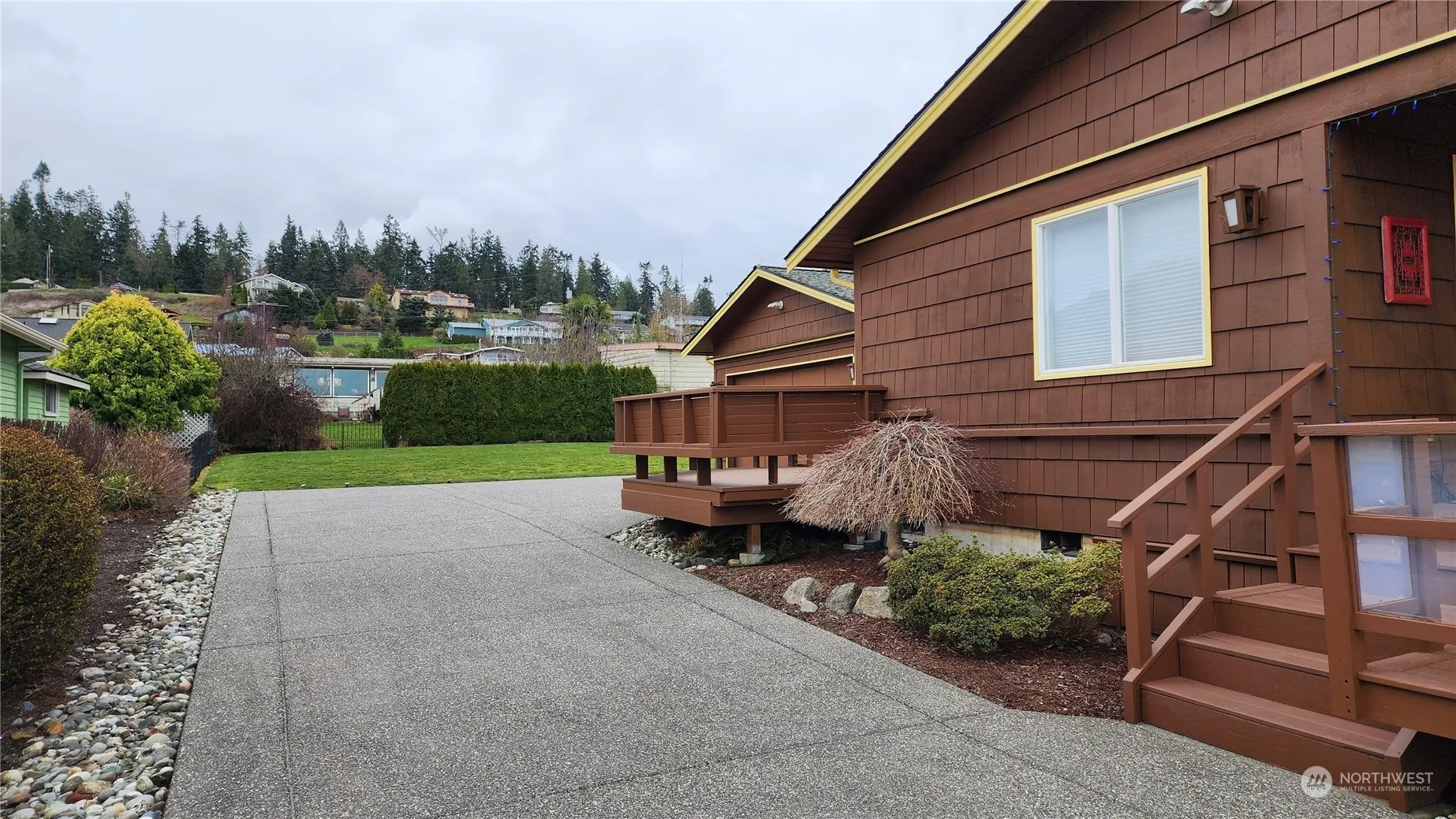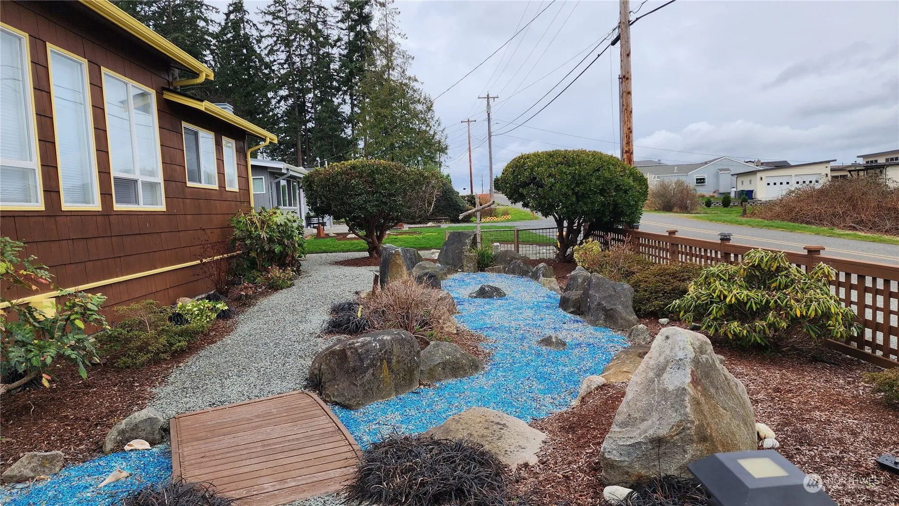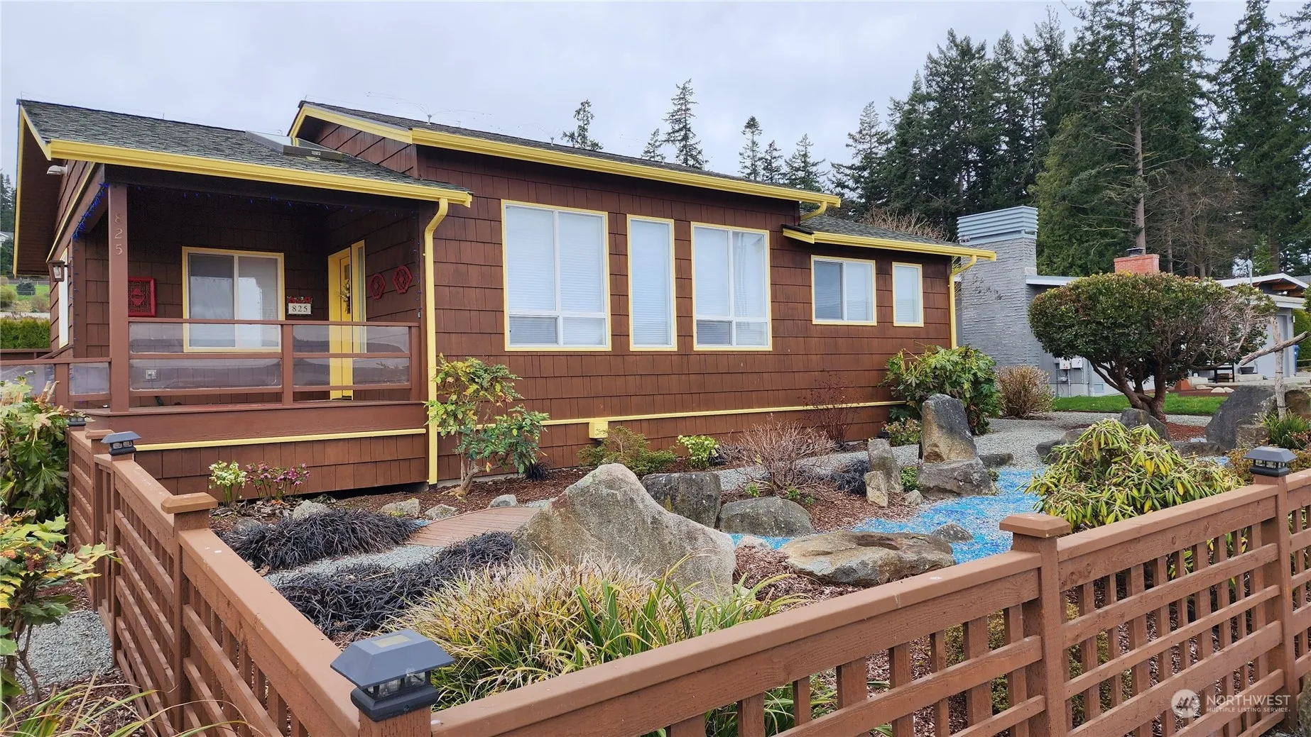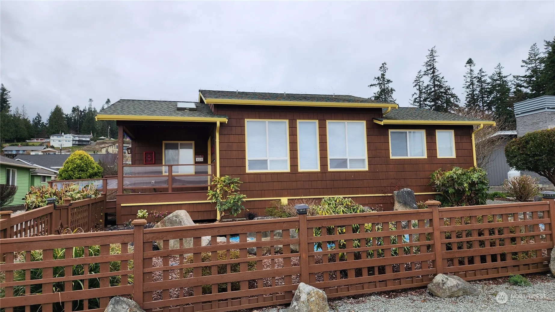 Charming 2 bedroom + den office home with water and mountain views. Welcoming Living room with vaulted ceilings and tall windows to let in the amazing view and natural sunlight. Kitchen with Quartz counters, all stainless appliances, vaulted ceilings, and skylights. Kitchen connects to dining area with many windows. Beautiful hardwood floors throughout all main rooms. Master bedroom boasts large windows and hardwood floors. Master bath has tiled floors and tile shower with glass doors. 2 car garage. Community beach access. Landscaping included.