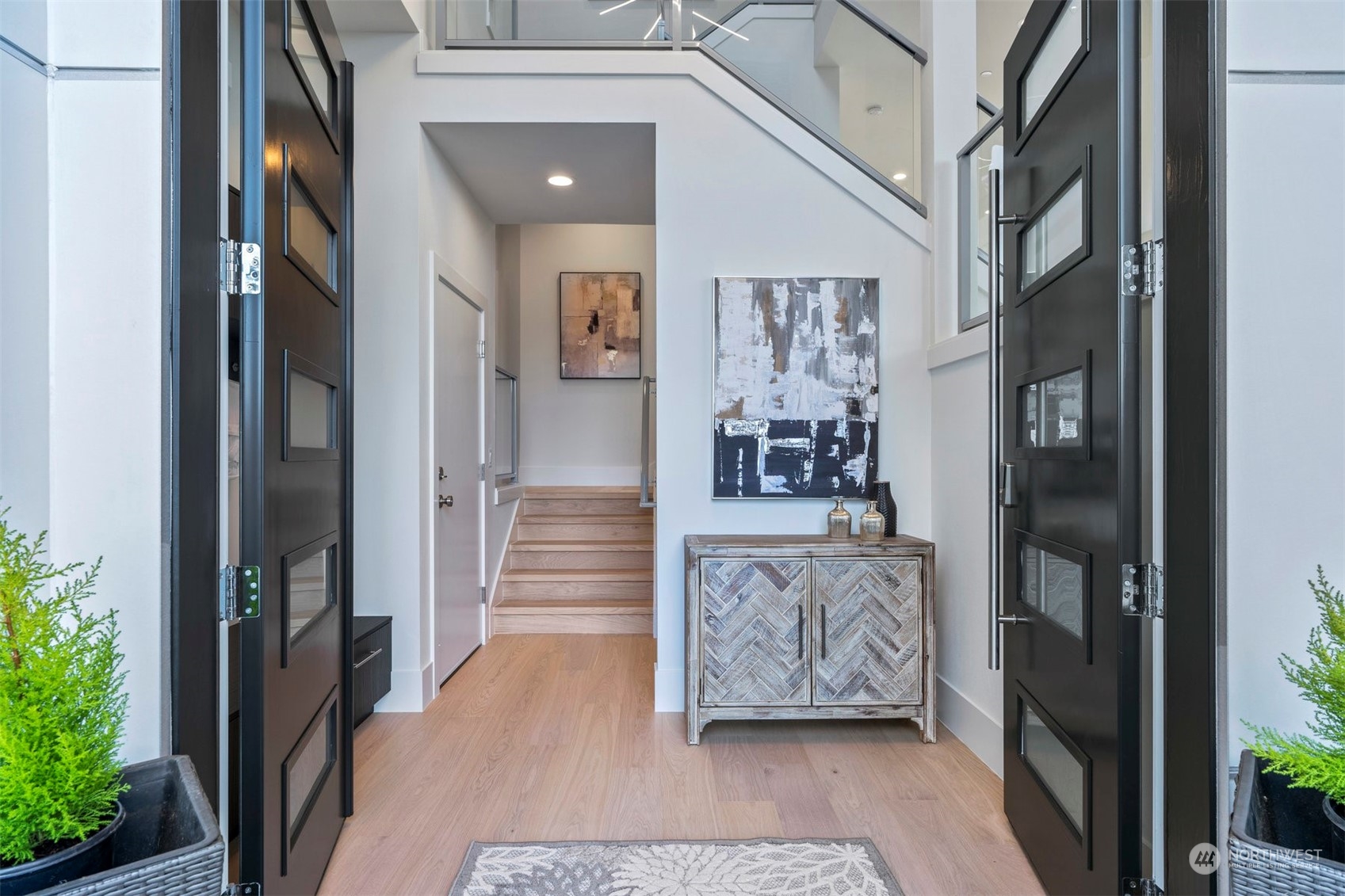 NW Contemporary with fabulous sound/mountain views and tons of natural light. This beautiful home features a chef’s kitchen with SS appliances, built in freezer, fridge, and wine, built in wolf coffee maker. 11 foot island with quartz counters, custom cabinets, hardwood floors throughout the main floor. Upstairs features 3 bedrooms, luxury primary suite with walk in closet and bath. Heated floors in both hall and main suite bathroom. Fireplaces on main floor, family room, and primary bedroom. Lower floor has two bedrooms, family room, and bonus gym/office with outside access. Possible ADU in lower level. Walking distance to the park the beach and coffee. This is not your average new construction, come take a tour.