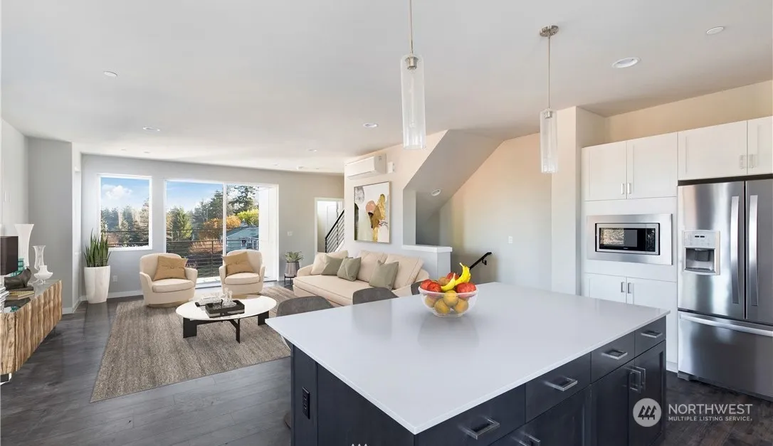 DBW is proud to present an extraordinary modern townhome in desirable Towns on 145th community of Shoreline. Just 1/4 mile from new light rail station and just steps away from the best private school – Lakeside, this 4-star BuiltGreen certified 2022 construction features high quality finishes and expansive windows throughout. Tons of space in this tastefully furnished* 3BD/4BA end unit: Open kitchen w/ large island, quartz counters, stainless appliances and walk-in pantry; 1st floor ensuite + top-floor bonus area; Expansive balcony off living room. Oversized primary suite w/ spacious spa-like bathroom + walk-in closet. 2-car garage. Air conditioning. Highly ranked Shoreline school district. Right off I-5 and only 15 minutes to DT Seattle.