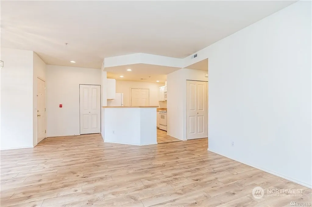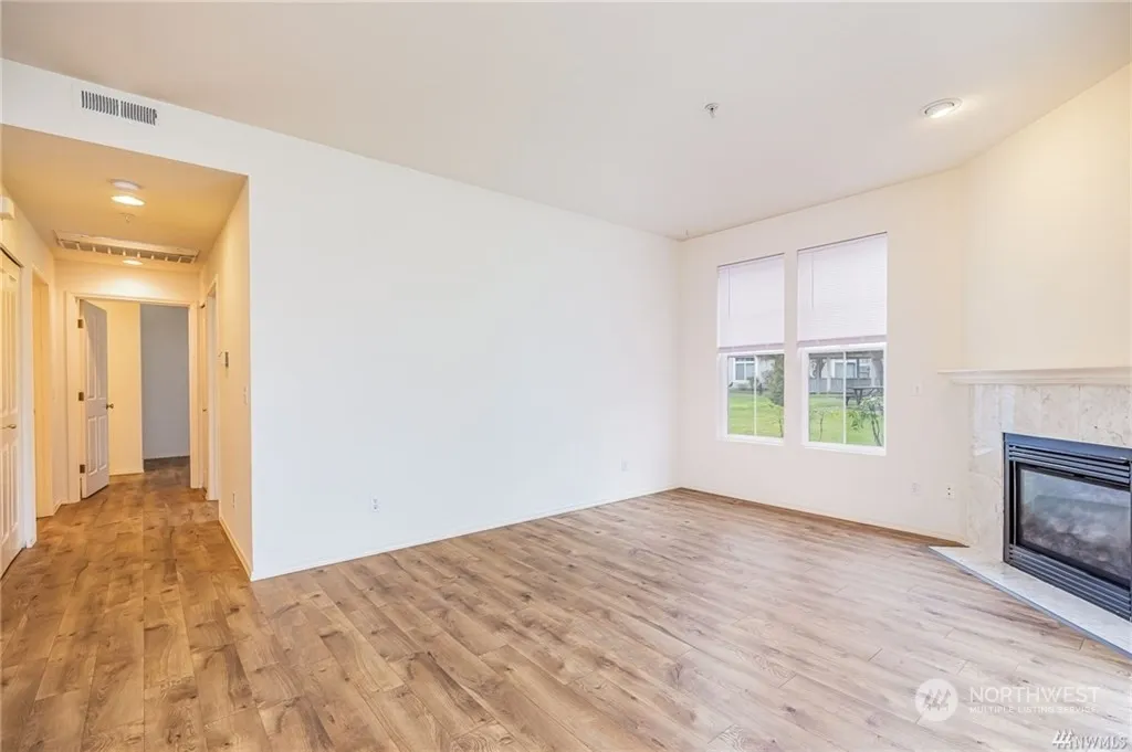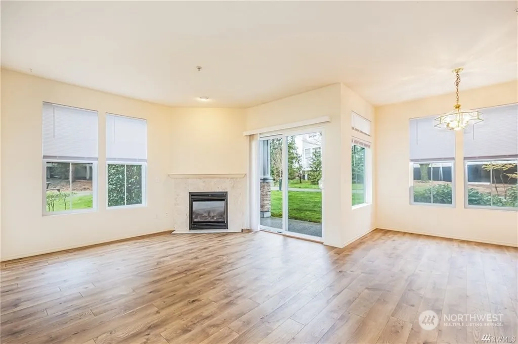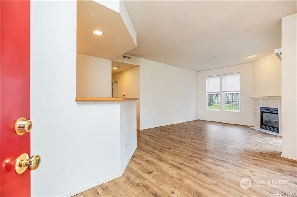 Beautiful, ground level condo, close to all amenities. This lovely condo faces out to a green space between the buildings. The front door opens to a large kitchen/living room dining room space that is bright and filled with windows. Around the corner are 2 bedrooms and 2 full bathrooms. The entire home has hardwood floors. Access to the one car garage is through the kitchen and you can park a second car in front of the garage. W/S/Landscaping included in rent. Small pet allowed with 2 year lease. Home is available now.