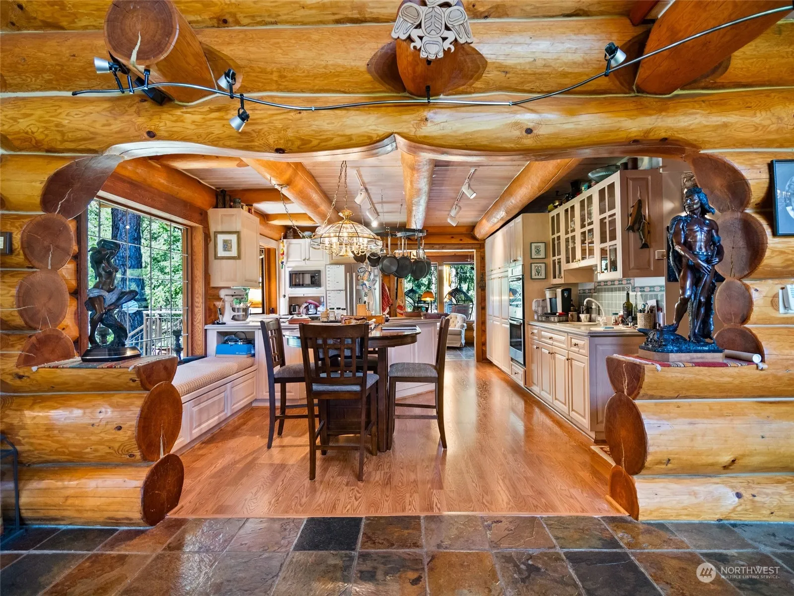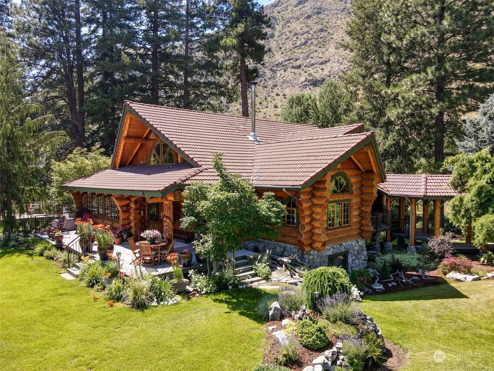 On a sprawling 14.3+/-acre property sits the Stormy Lodge. This custom log cabin provides a blend of rustic charm and modern luxury. Step inside to find an open-concept living space, where exposed wooden beams and vaulted ceilings accentuate the natural beauty of the log construction. Large windows frame views of the surrounding wilderness, Entiat River, and beautiful pond, allowing you to stay connected with nature while indoors. The kitchen is a chef’s delight, featuring a double oven, custom cabinetry, and ample counter space. With rooms and bathrooms in the lower level, you can hosts guests or clients with ease. The Stormy Lodge on the Entiat River offers a magical escape that will leave you enchanted with its charm and beauty.