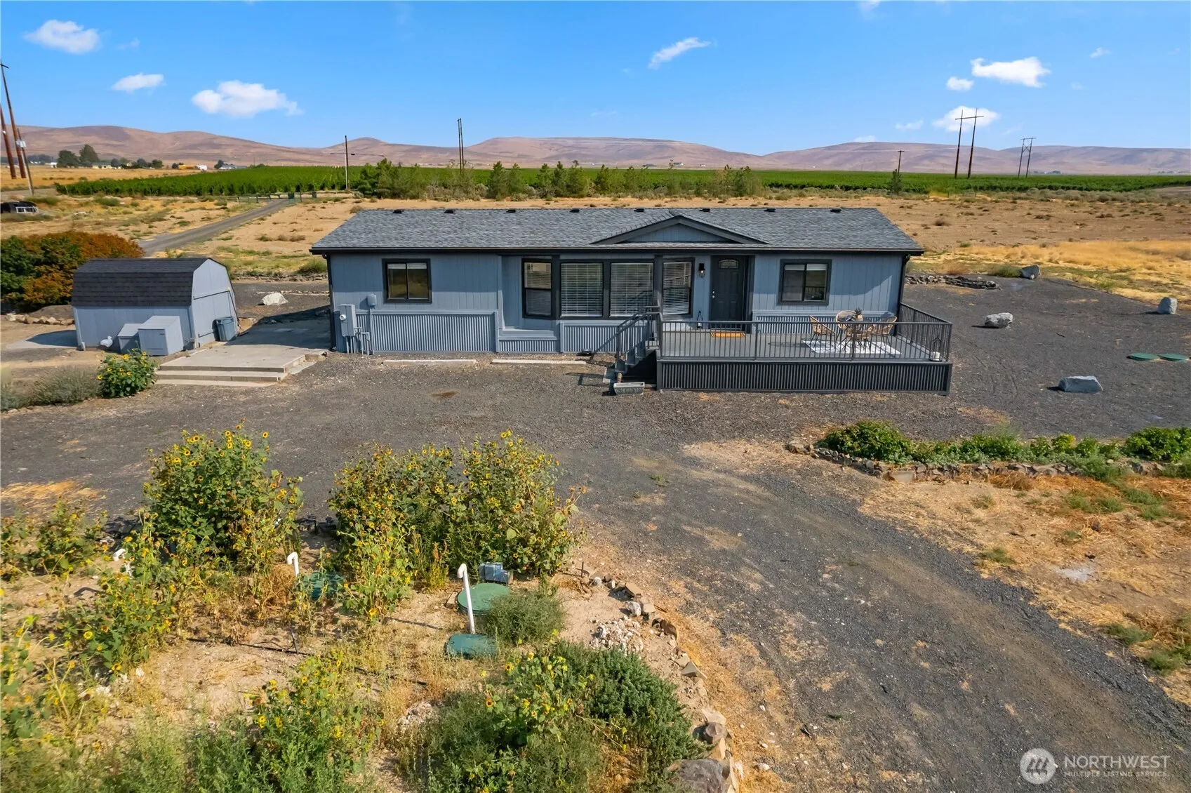 From sunrise to sunset, enjoy breathtaking Quincy Valley views from this 9.75-acre property. A 3-bed, 2-bath MFH has been refreshed with new deck, flooring, trim, and paint. Two 30×50 state-of-the-art greenhouses with heated floors, grow lights, and climate control are ready to produce. A private well with dual 3,000-gal. tanks supports agriculture or expansion, plus a shop and buildable lot with ADU potential. Zoned ag use—ideal for vineyard, nursery, lavender, or Christmas trees. Three acres are cultivated and ready to plant; the balance is natural high-desert landscape enhanced by lilacs, sumacs, lavender varieties, and a sunflower garden. Buyer to verify. Professionally inspected!