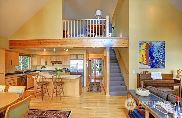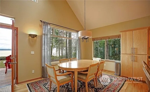 Live on the Island this high bank Waterfront Home with amazing views of the water and mountains This 3 bedroom 2 bath home features an. open floor plan with vaulted ceilings, gourmet kitchen with eating bar, stainless steel appliances, hardwood floors, massive rock fireplace for those winter nights. Enjoy the views from every room of this home. Storage shed and parking available, community beach access and country club access, washer and dryer included, 1 small pet ok with additional deposit. If you want the Beach Lifestyle This is your home! Come to Camano Island the no ferry Island!