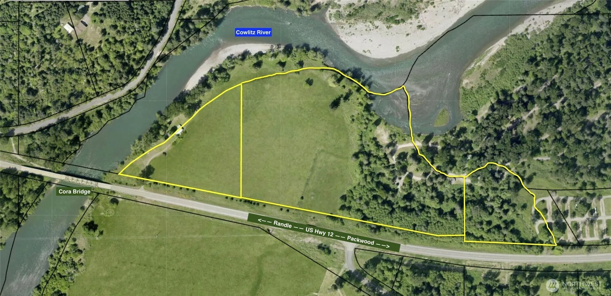 40+ acres, 3 parcels, stunning 2,300+ ft of Cowlitz River frontage, private beach, & your own little slice of history on a ~1900 homestead. 1,550+ ft of Garret Creek flow through the east edge. Spectacular territorial views surround you from everywhere on the property. The home is mostly original with rustic shiplap & interior and remnants of antique wallpaper. There is newer electrical and a pellet stove, but owners consider the home a “glamping” cabin. Approximately 33 acres of harvestable hayfield & mature timber. Long-standing water rights from gravity-fed spring since 1910. Power and water are available at the camping/picnic area. Large fenced garden area with raised garden beds. Build near Mt Rainier and White Pass Ski Area!