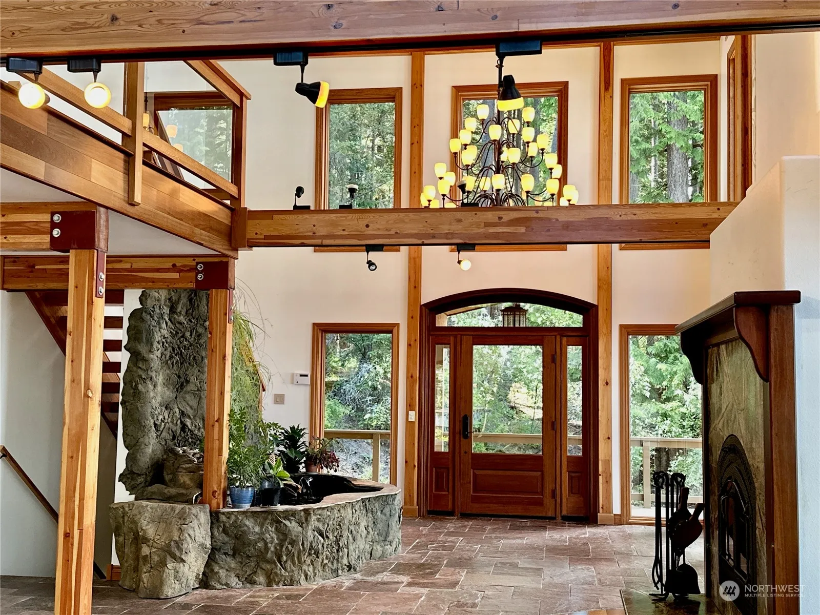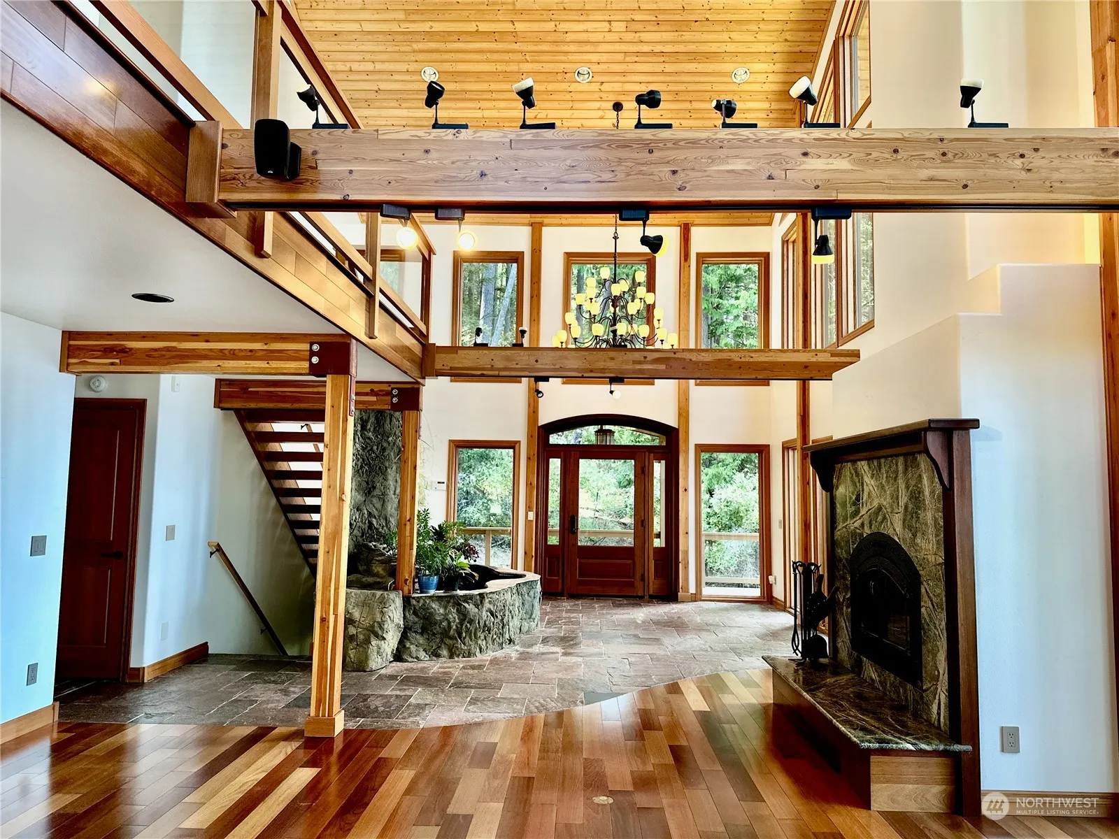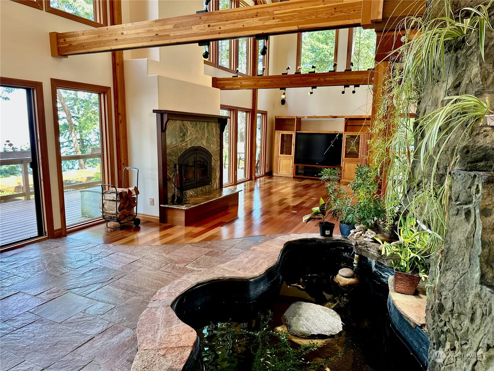Designed by the owner for their retirement comfort, this elegant high-bank waterfront home has a bright, warm feeling from sun’s light streaming through multi-story windows into a great room which features indoor pond & a fireplace that is a work of art. With a double-oven, 2 warming ovens, sinks, propane stove & a separate grill along w/ a huge amount of counter space there is plenty of room for multiple chefs. Enjoy the privacy of a cul-de-sac location adjacent to a HOA owned greenbelt, viewed from bedrooms, balconies and the large soaking tub in the primary bath. Hobby rooms, including one w/ a closet plumbed for a bathroom, could be converted to make full use of the 4 BR septic system. Daylight basement features wine cellar & hot tub.