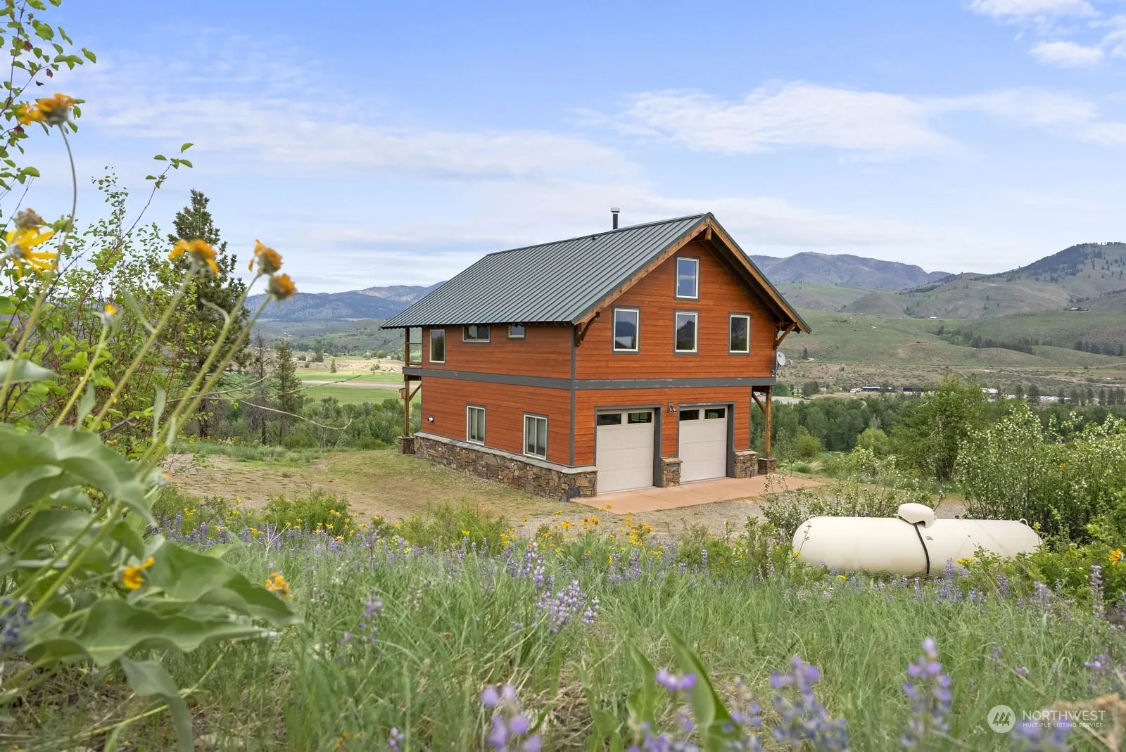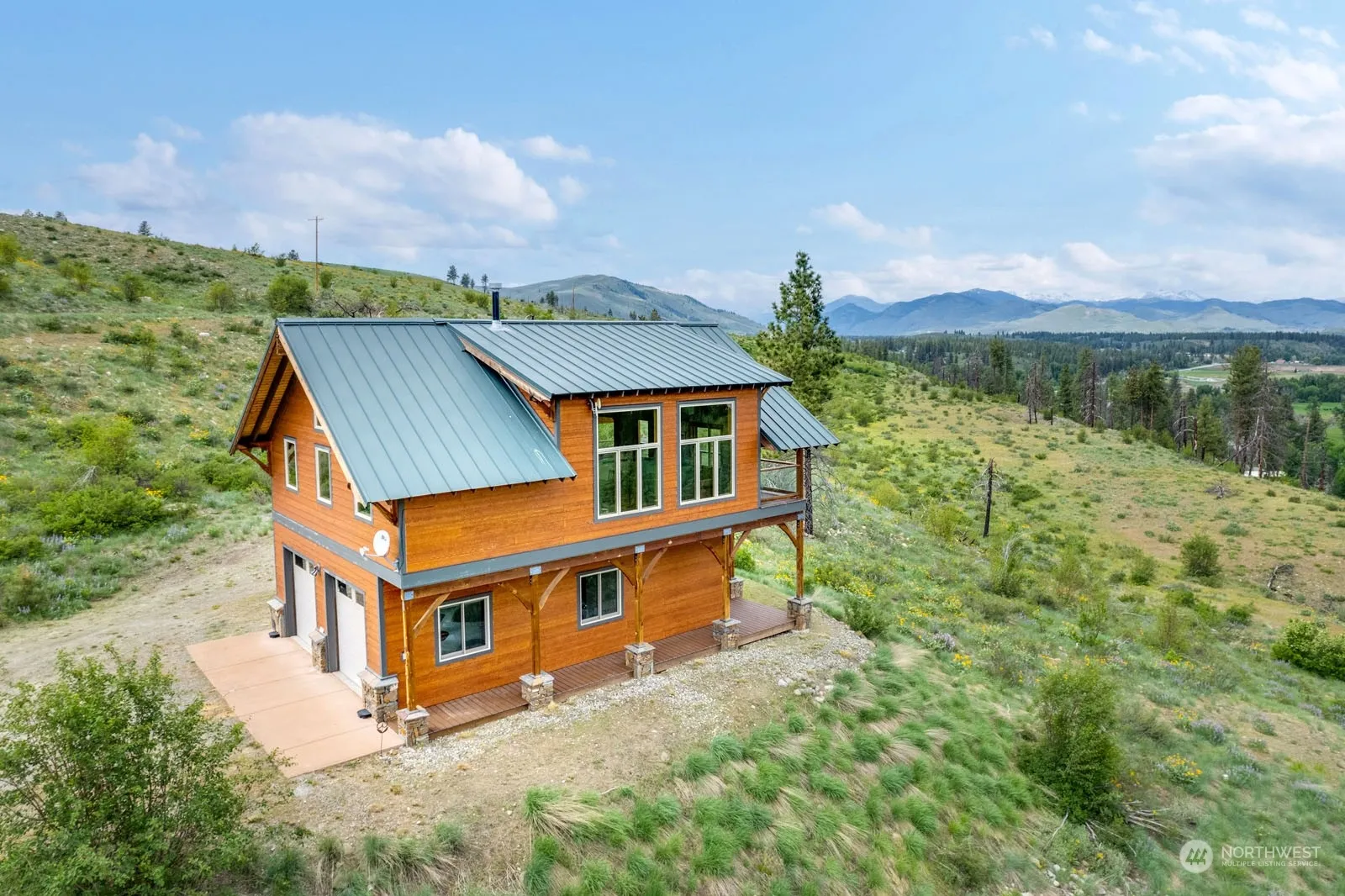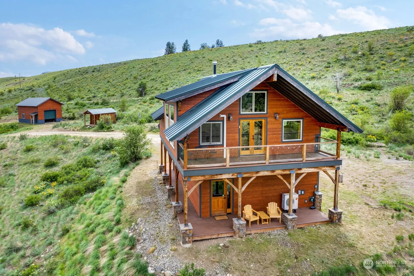 Custom home on 20.20 acres. Two story double car garage with 1 BDRM home upstairs. Expansive views; including the surrounding mountains, the Methow Valley and the Methow River. Privately tucked away at the end of the road, good year round access. Includes two-story home with 1 bedroom, 1 bath, 896 sf., balcony with views, wood & tile flooring, wood cabinets, wood details throughout. Exterior details include HardiePlank siding and grout-less stacked stone wainscot, attached garage, extra storage, gardening shed and detached over sized shop with utilities (water, power & septic) stubbed inside. 20.20 acres of natural landscape, a few scattered pines, good wells, fantastic views.