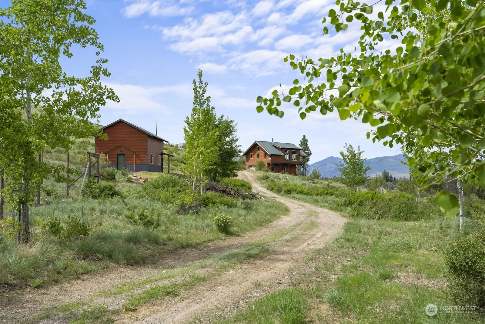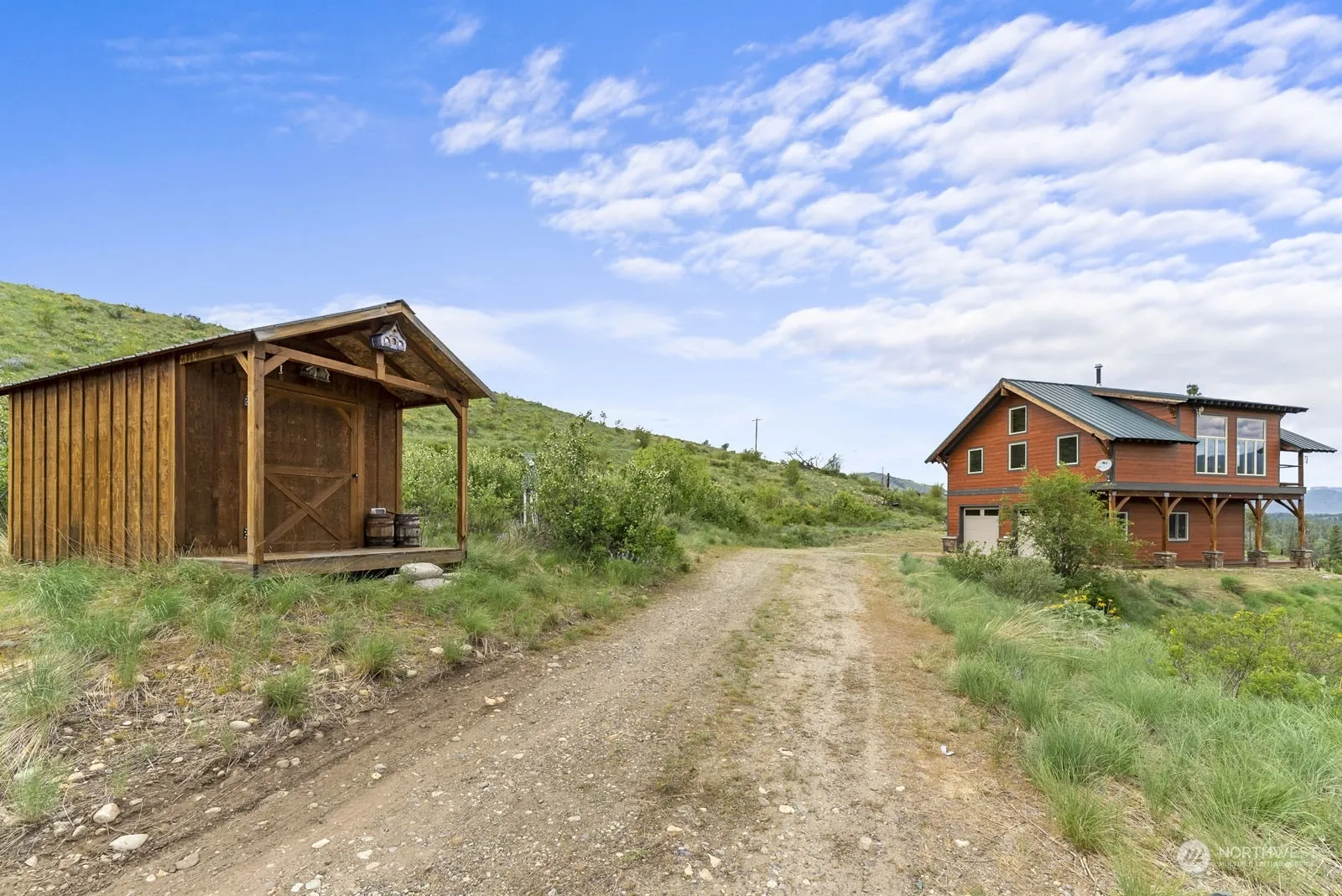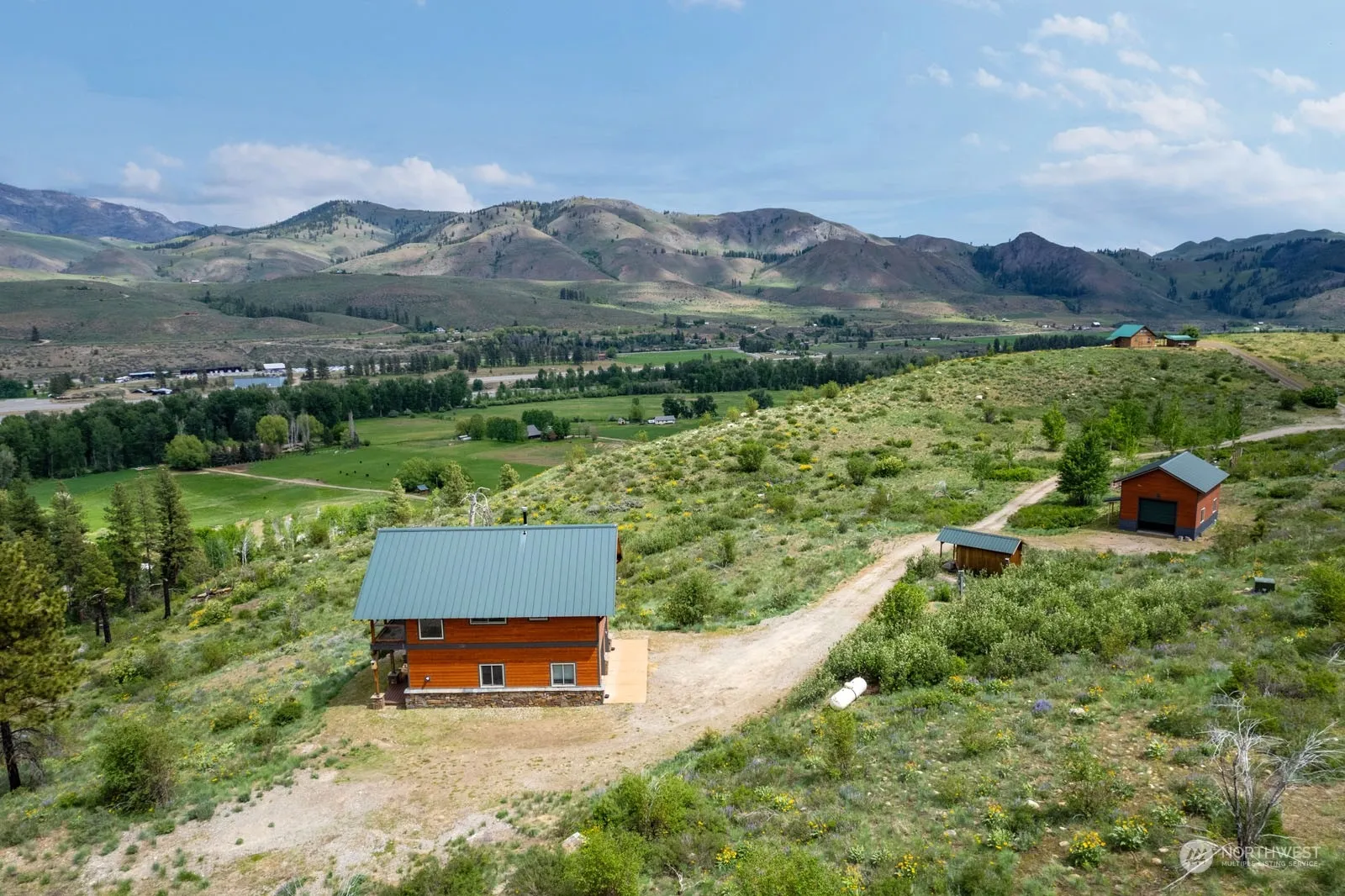 Custom home on 20.20 acres. Two story double car garage with 1 BDRM home upstairs. Expansive views; including the surrounding mountains, the Methow Valley and the Methow River. Privately tucked away at the end of the road, good year round access. Includes two-story home with 1 bedroom, 1 bath, 896 sf., balcony with views, wood & tile flooring, wood cabinets, wood details throughout. Exterior details include HardiePlank siding and grout-less stacked stone wainscot, attached garage, extra storage, gardening shed and detached over sized shop with utilities (water, power & septic) stubbed inside. 20.20 acres of natural landscape, a few scattered pines, good wells, fantastic views.
