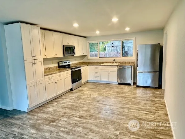 Welcome to this beautifully updated rambler, offering comfortable one-level living with all 4 bedrooms conveniently on the main floor. The open-concept kitchen flows seamlessly into the family room, where you’ll find a cozy gas fireplace and sliding doors that open to a private patio and fully fenced backyard, perfect for outdoor entertaining. A spacious two-car garage provides ample room for vehicles and additional storage. Nestled at the end of a quiet street, this home offers both privacy and easy access to Hwy 18, shopping, schools, and more. Don’t miss the opportunity to make this charming home yours!