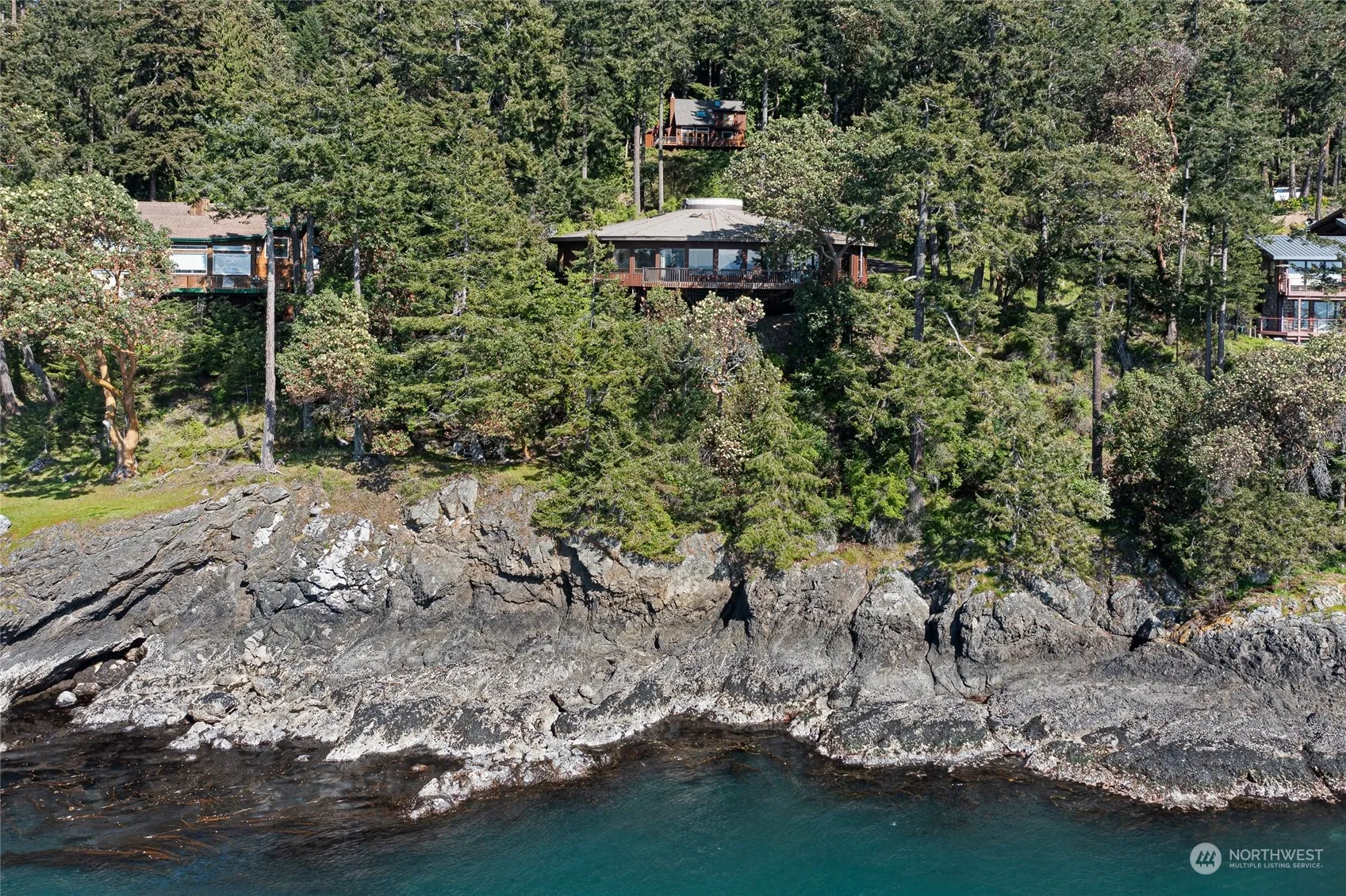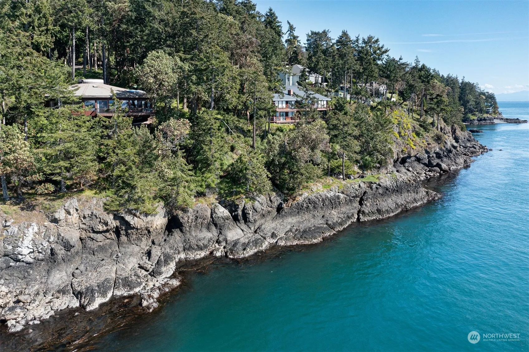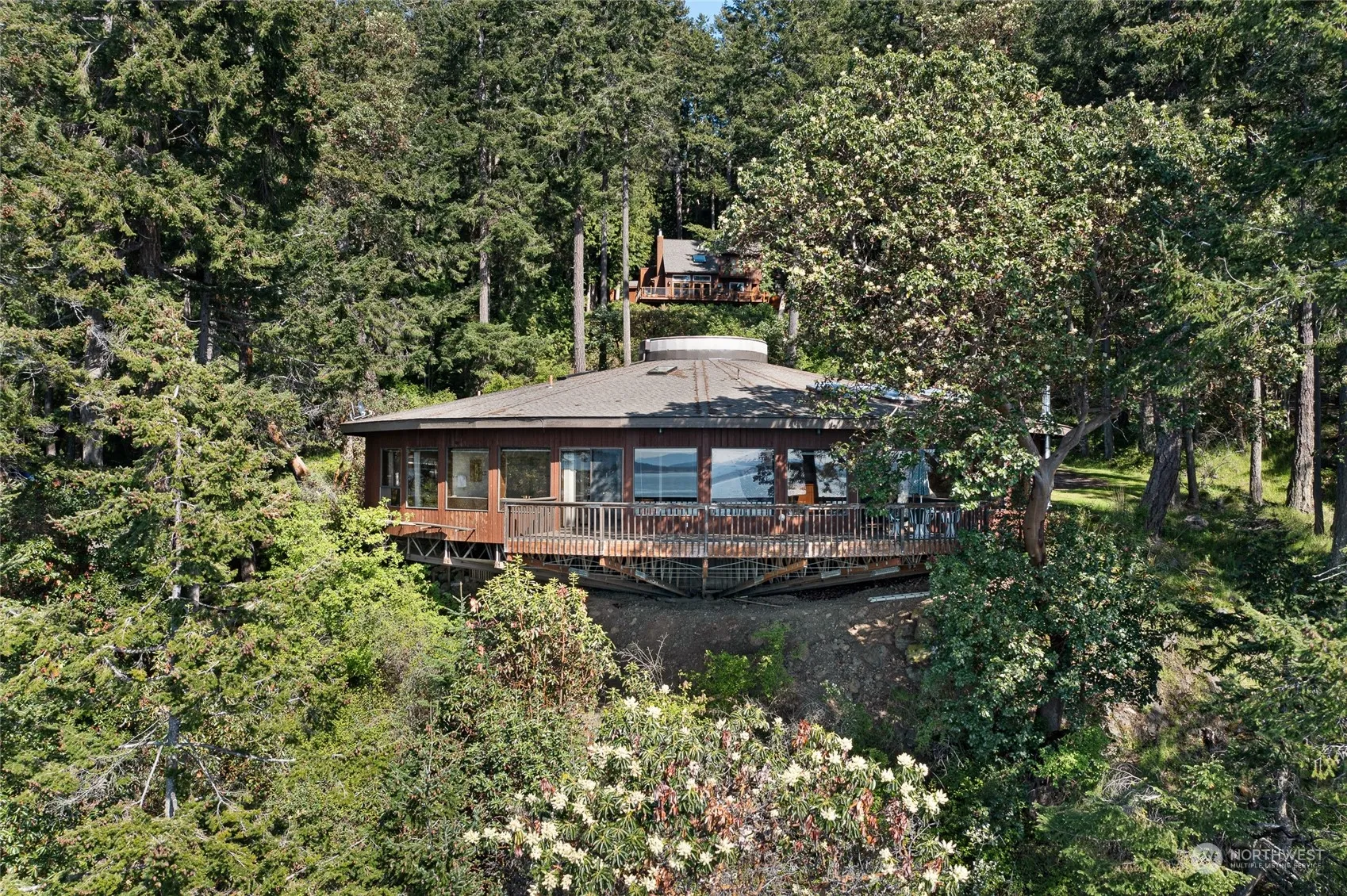 A successful active vacation rental for the last several years, this one-of-a-kind pedestal home sits on a 1.1 acre double lot with 238ft of high bank waterfront. The unique circular building design offers open concept living with idyllic water and sunset views from every window. Relax on the deck above the water and enjoy the sighs and sounds of the coveted San Juan Island Westside. Observe orcas, humpback whales, sea lions and other wildlife frequenting our waters. The primary bedroom includes an en-suite bathroom, large closets and a sliding door to the deck. The home also features two additional bedrooms, full bathroom, powder room, bonus room up the stairs in the pedestal, skylights, vaulted ceilings and a shady covered front patio.