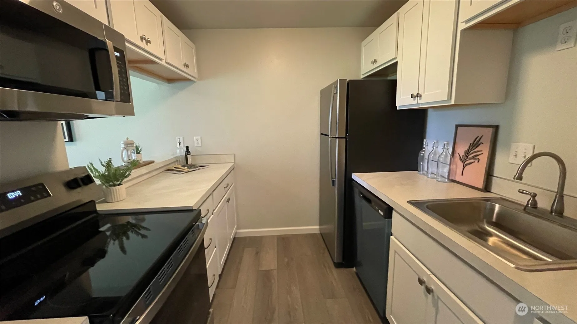 Welcome Home! This remodeled 2-bed 1-bath top floor, end unit home offers exceptional value and charm while featuring all new kitchen cabinets, countertops, sink, LVP flooring throughout, fridge, dishwasher, stove/oven, microwave, washer and dryer, hot water heater, forced air heaters, bath sinks & cabinets, countertops, tub, and toilet. A 4’X8′ storage unit, 1 covered and 1 uncovered designated parking spaces. Come and be a part of Kobuk’s small 16-unit community where you will experience low maintenance living while being close to shopping centers; Costco, Fred Meyer, Safeway, Schools and I-5. Unfurnished and move-in ready.