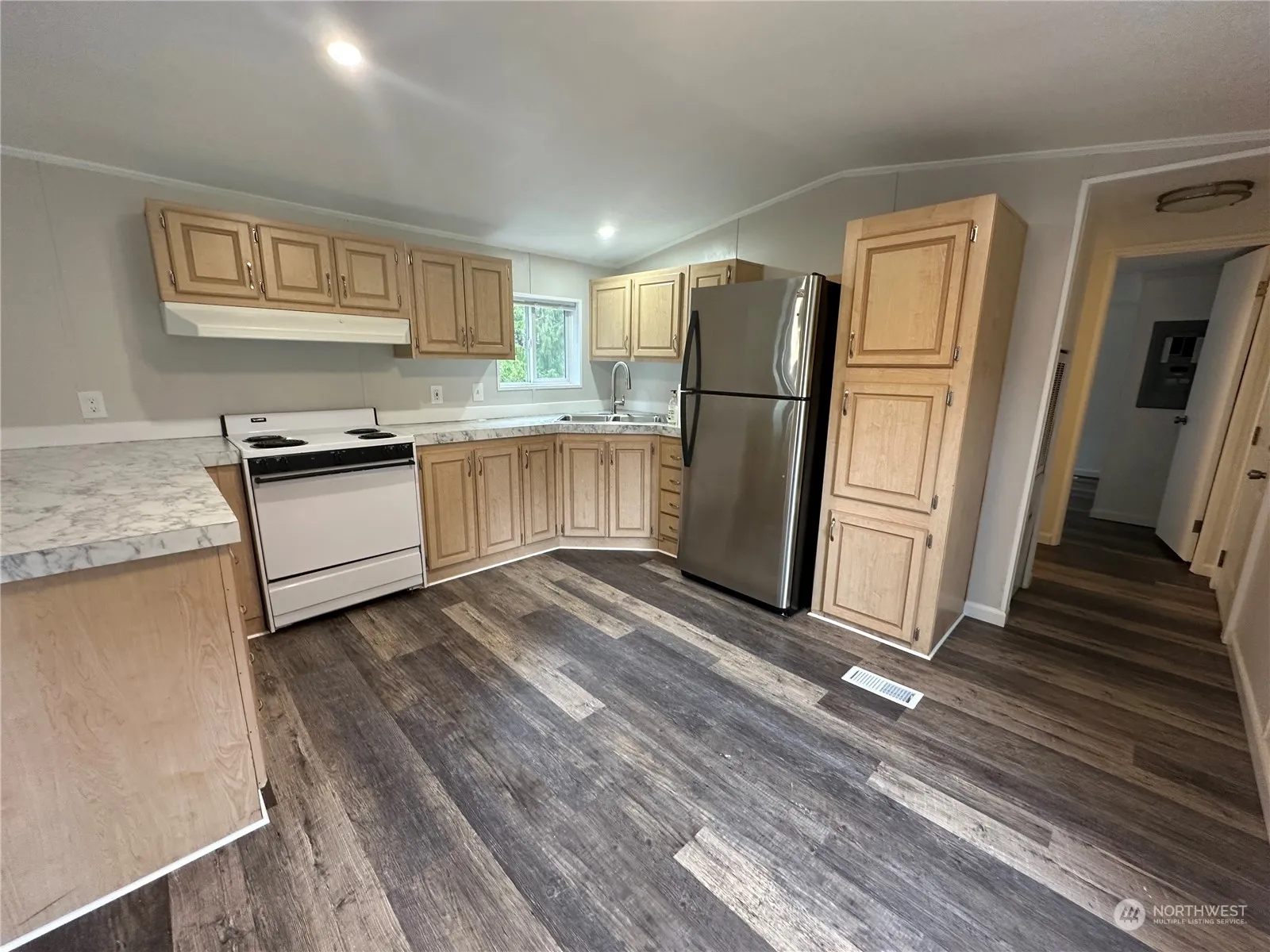 This charming 924 sqft home features 2 bedrooms and 2 bathrooms, including a master bath with a convenient walk-in shower. The interior boasts updated flooring and newer paint throughout, creating a modern and inviting atmosphere. Step outside to a covered back porch that overlooks a spacious backyard, perfect for relaxation or entertaining. The home also includes washer and dryer hookups for added convenience. Carport is also available to park under.