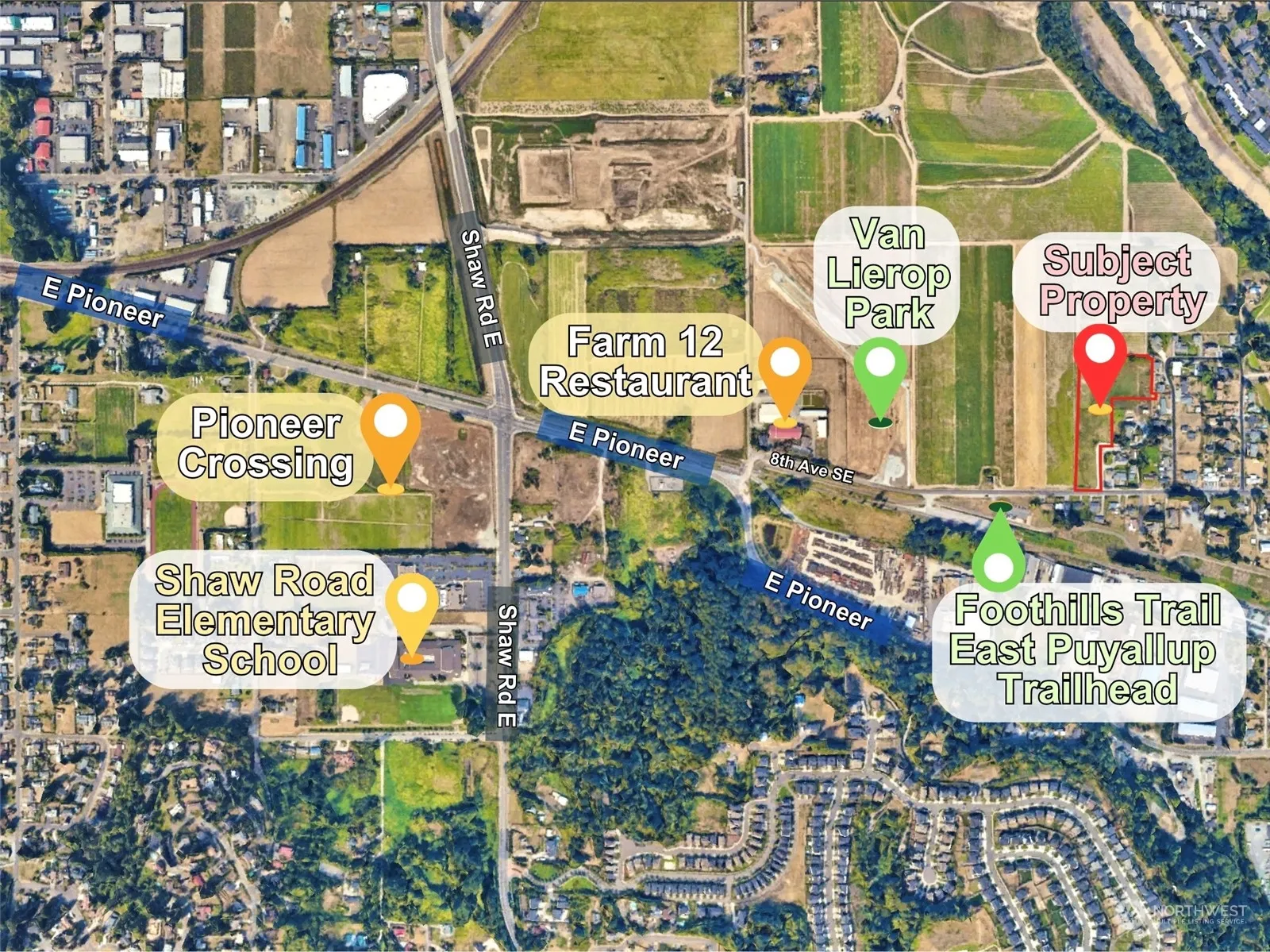 4.11 buildable acres located between Puyallup & Sumner. This parcel is mostly pastureland & ideal for you to build your dream home on a larger lot or establish a hobby farm outside of town while still being close to everything else. Topography is level w/ views of Mt. Rainier from some portions. Public water, natural gas, & electricity are in-street. Situated just east of the intersection of East Pioneer & Shaw Road and proximate to Foothills Trail, Van Lierop Park, Farm 12, Pioneer Crossing & Shaw Road Elementary. Also not far from Hwys 512 & 410. Property also has development potential once sewer is closer making it a great long-term investment opportunity. Very impressive property w/ room to roam unlike anything else on the market.