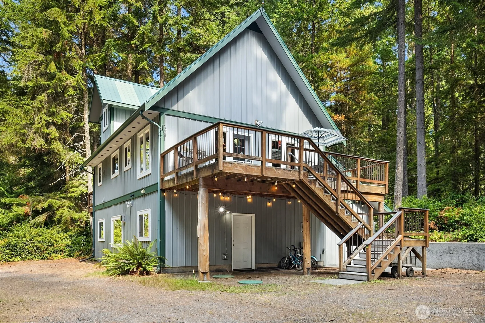 Charming A-frame style home on 5 wooded acres in South Whidbey! This private island retreat blends rustic charm w/modern comfort. Step inside to fir floors, detailed woodwork, a handmade stair rail & vaulted ceilings w/wood beams, open kitchen w/breakfast bar, dining room, primary bedroom & full bath. Upstairs bedroom w/ 3/4 bath & loft, great for home office. Lower level features a generous family room plumbed for a 2nd kitchen, full bath (new in 2020) & large bunk room ideal for gatherings. Enjoy outdoor living w/trails winding through the property & a fire pit for cozy evenings under the stars. Currently an active ST rental, this home is offered fully furnished, providing a rare turn key opportunity just minutes from the Clinton ferry!