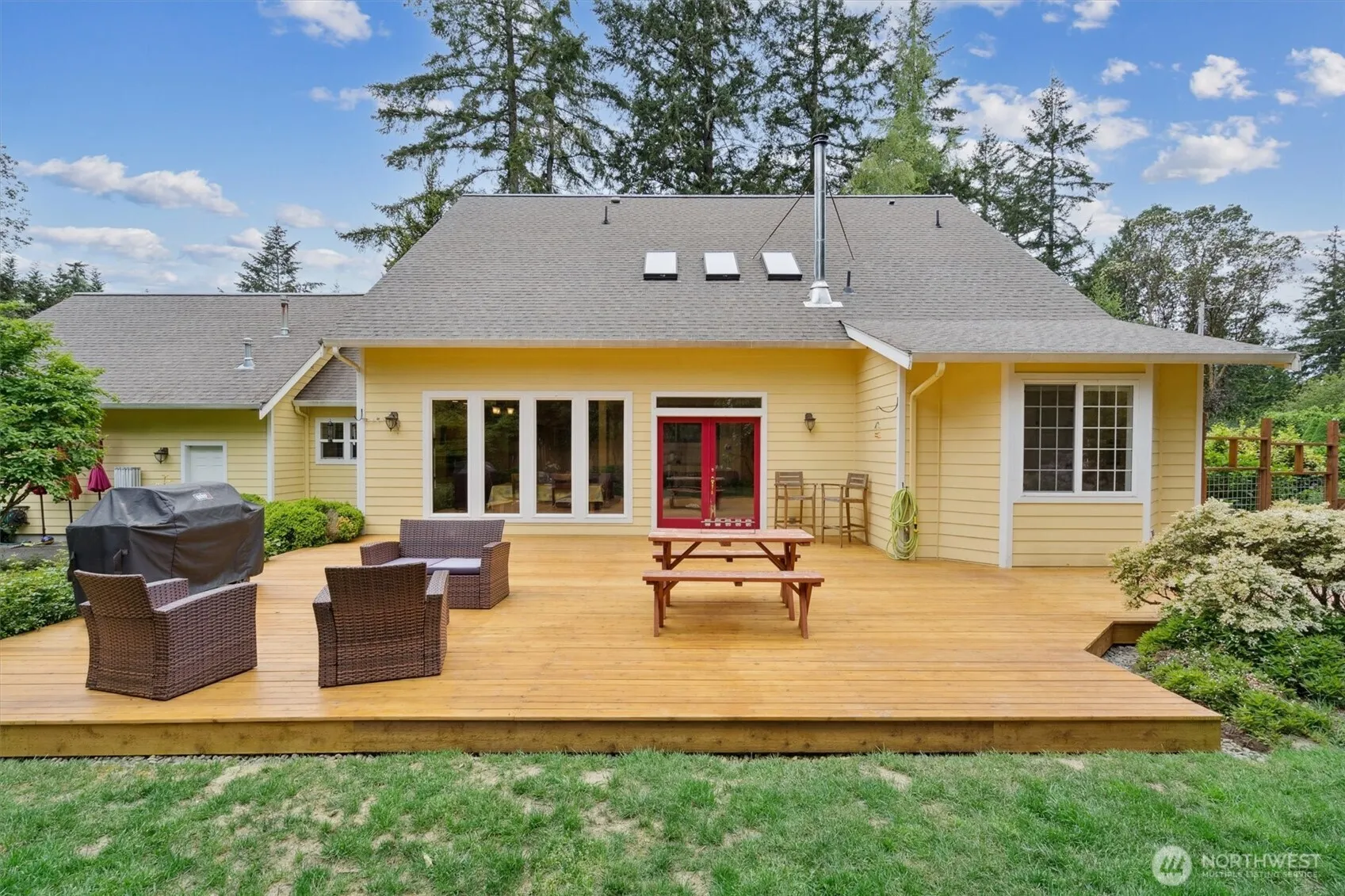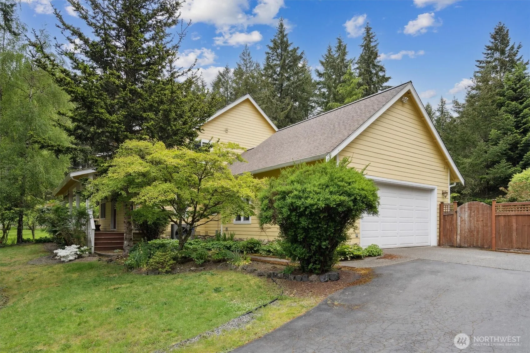 Contemporary farm house on a quiet, country road but only minutes to schools, amenities and Seattle ferry. Covered front porch to formal entry. Open-floor plan with cathedral ceilings & skylights, wood-burning stove and hardwood floors. French doors to entertainment-sized deck and fully-fenced landscaped yard. Amazing kitchen with newer appliances. Primary suite with stunning new bathroom and home office on the main. Two more bedrooms and full bath upstairs plus two extra rooms for even more space–play, exercise, study. Attached 2-car garage AND Detached RV/boat garage with heated workshop and guest studio. Not to be missed— gardener’s dream veggie garden and mini-orchard!