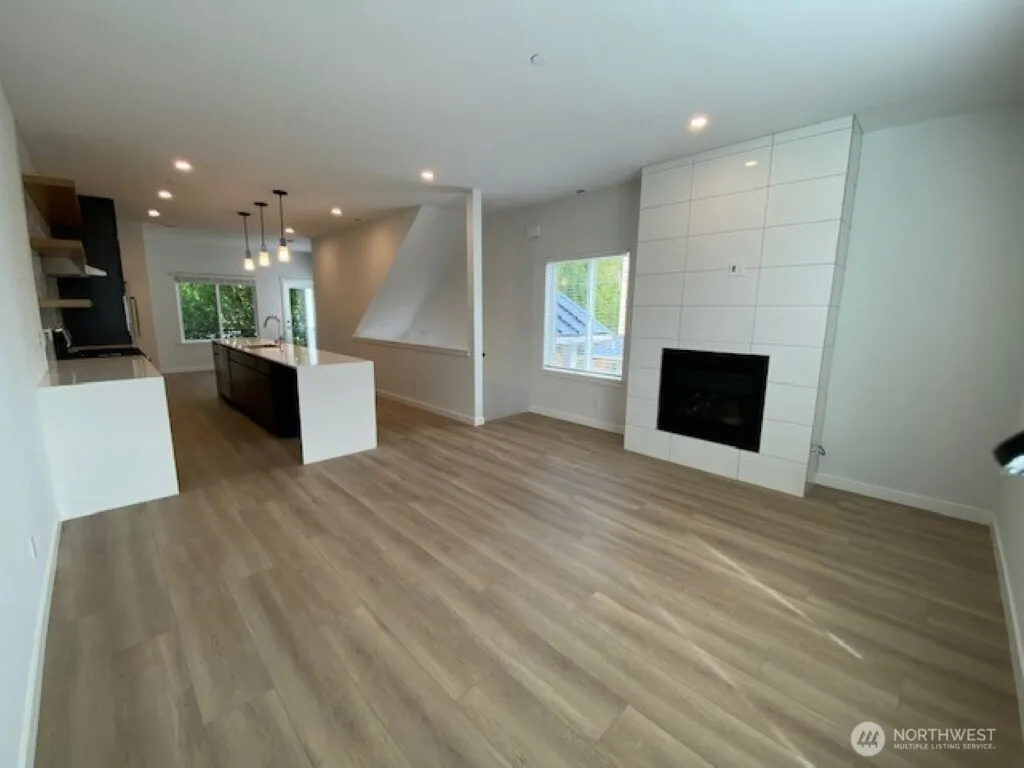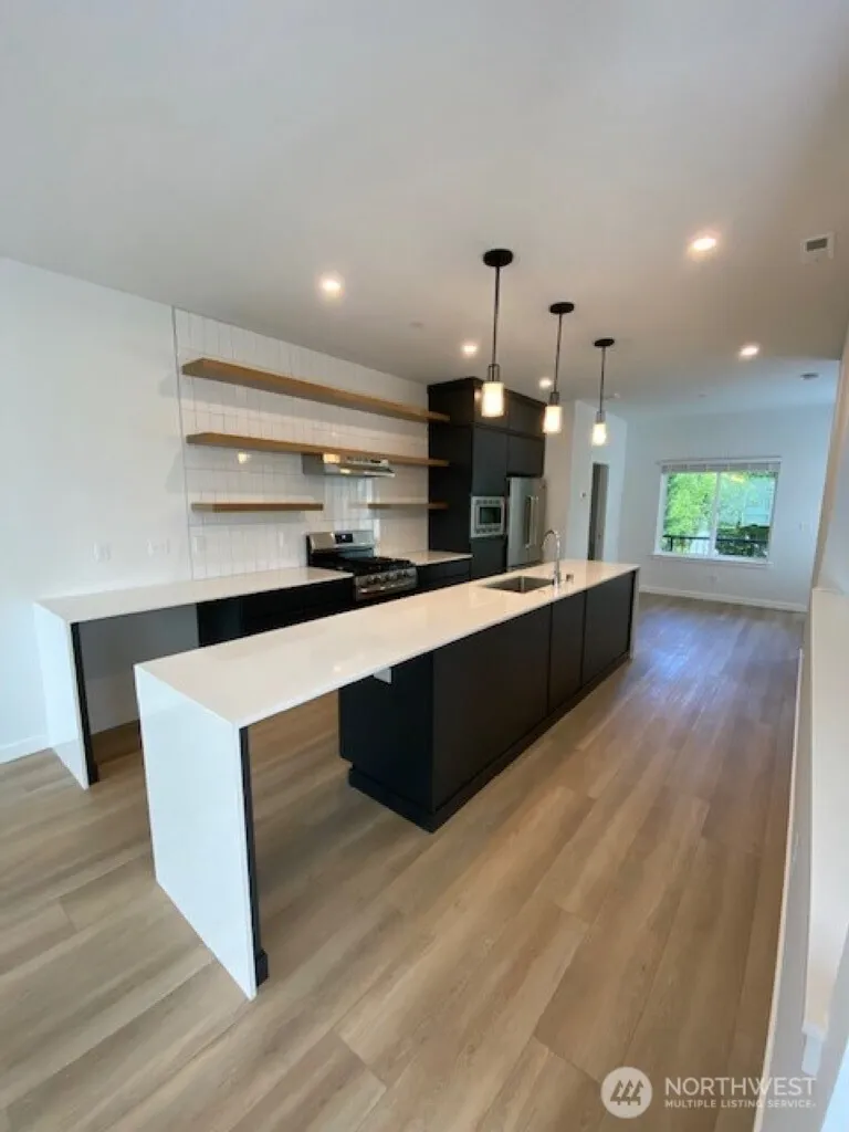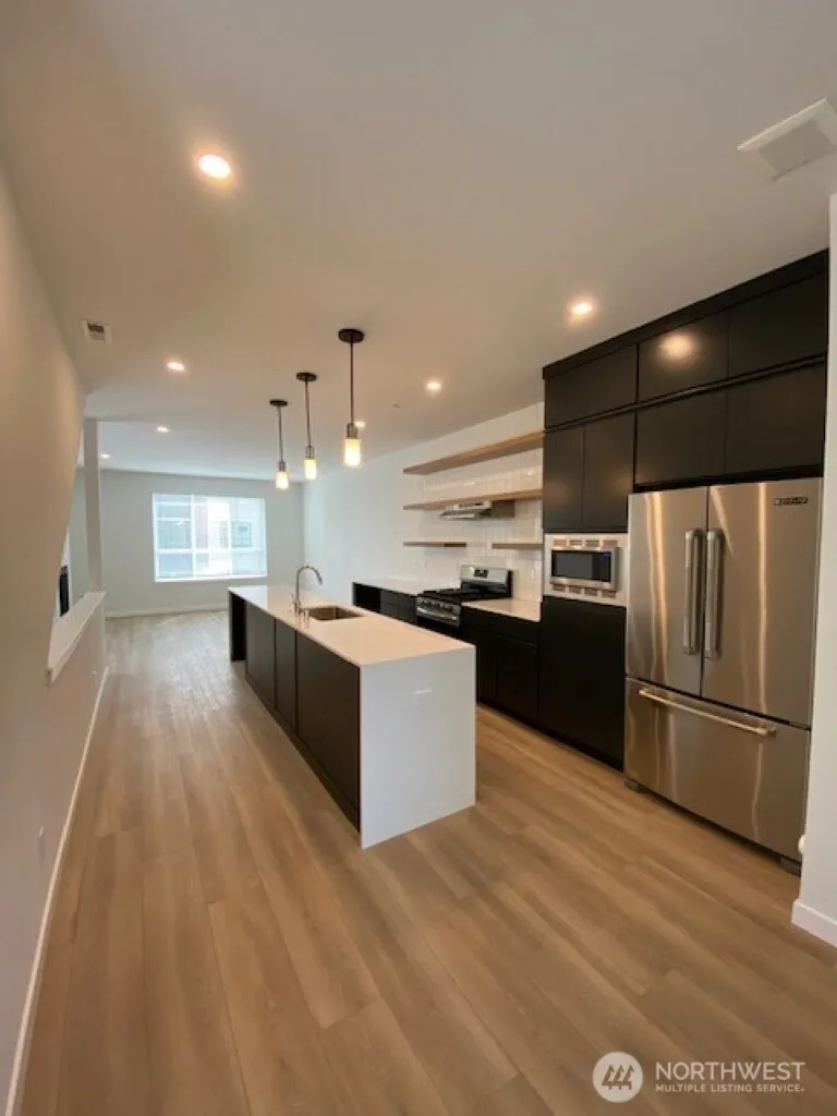 Avail July 6. Welcome to MainBrook Townhomes! Beautiful end unit 3 bed/3 bath home on 3 levels. Enter the front door on the side of the home. Head down to the third bedroom with an en-suite 3/4 bath and the garage, or up to the main level, with an open concept living room/gourmet kitchen featuring waterfall quartz counters, full tile backsplash, open shelving & SS appliances. Half bath and a large covered deck. Top floor has a main suite and additional bedroom with its own bath. The laundry machines are upstairs. Small, fully fenced backyard. Additional reserved parking spot on the side of the home. This home is stunning and just waiting for you!