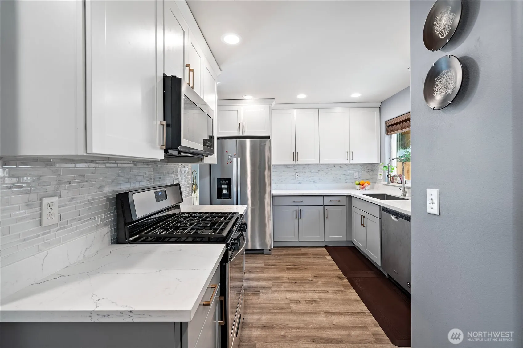 Beautifully remodeled rental home in top-rated Shoreline School District, located at the end of a quiet cul-de-sac next to a community park. Prime location near I-5, Costco, Trader Joe’s, Fred Meyer, and excellent schools. This spacious 4-bedroom, 2.5-bath home offers a functional layout with upstairs laundry and an expansive primary suite featuring a 5-piece bath, jetted tub, and large walk-in closet. Enjoy modern upgrades from the 2022 remodel, including updated kitchen and baths, new flooring, lighting, utility room, garage cabinets, and outdoor shed. In 2025, the home received new fencing, gutter cleaning, and pressure washing of the driveway and patio. Oversized 2-car garage and a low-maintenance fully fenced yard complete the package.
