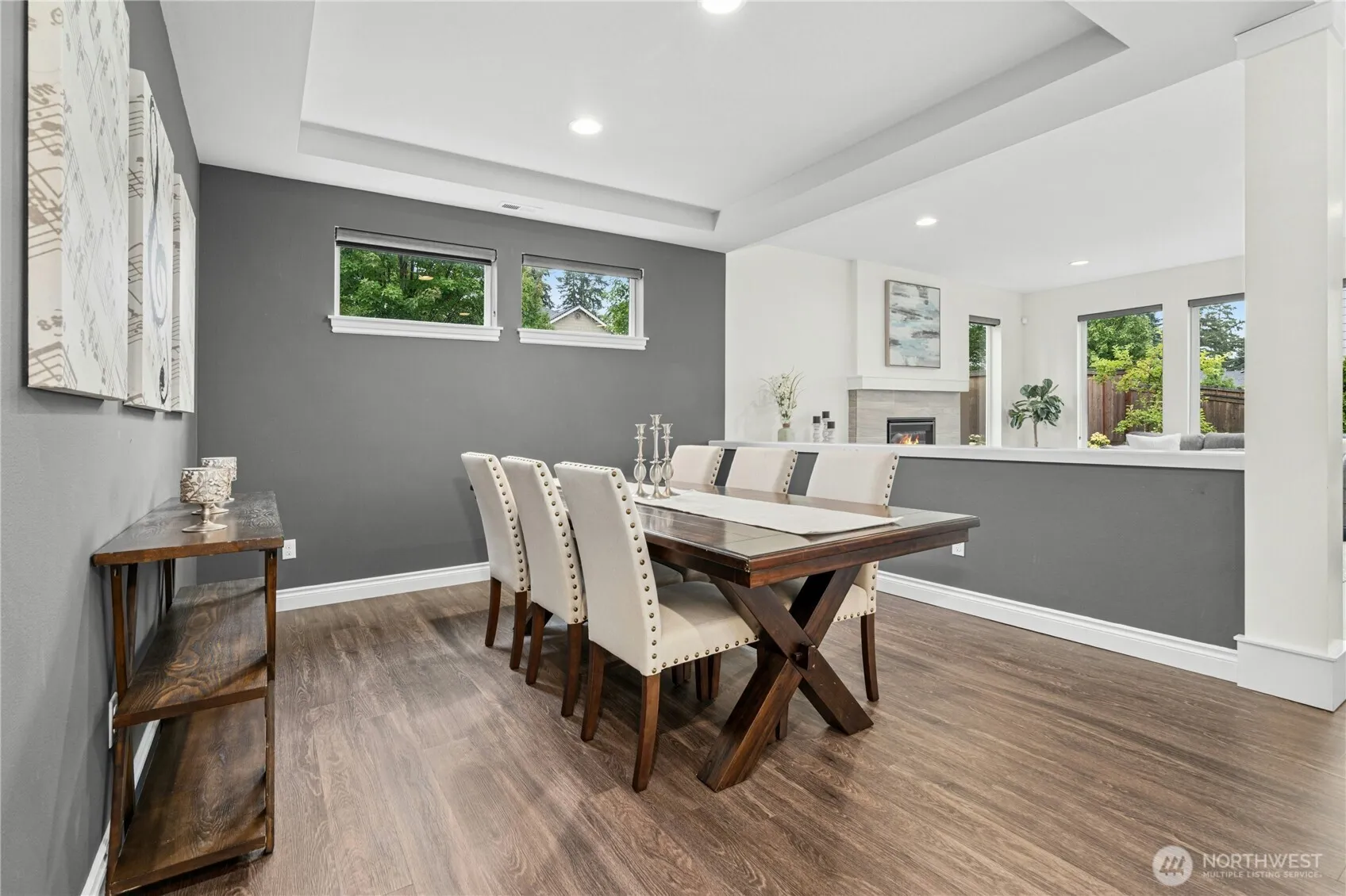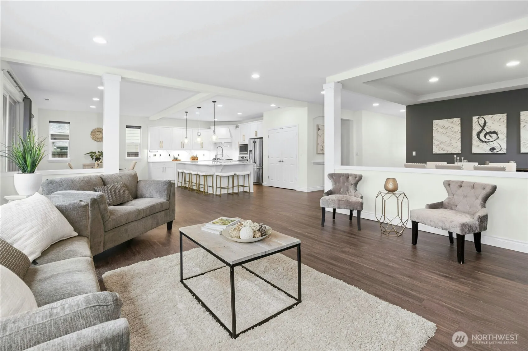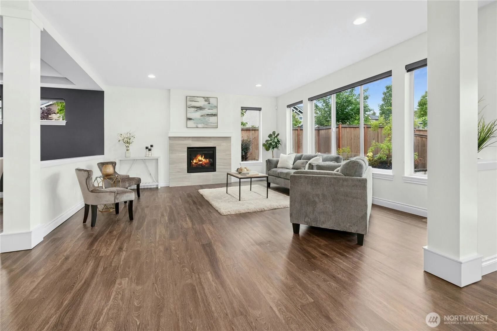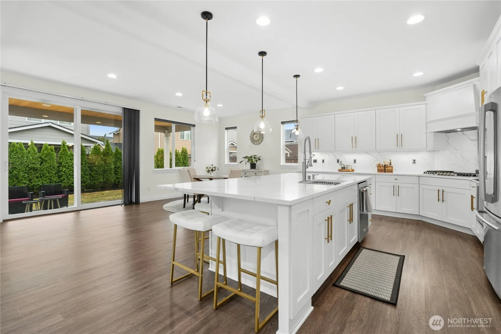 Immaculate 5BD/3BA home in desirable Vinterra offers 3,740 sq ft of comfortable luxury. The open floor plan connects a stunning quartz kitchen with large island, SS appliances, gas cooktop, and dining nook to an inviting family room—perfect for gatherings. Main-level bedroom & ¾ bath add flexibility for guests or office use. Upstairs: four bedrooms with custom closet built-ins & a bonus room with built-in speakers & Juliette balcony. The primary suite features a spa-inspired bath with soaking tub and walk-in closet. Enjoy outdoor living on the covered patio overlooking a fully fenced yard. Three-car garage includes EV charging & storage. Smart-wired, pre-inspected, & move-in ready. Minutes to parks, shops, I-405, and top Northshore schools.