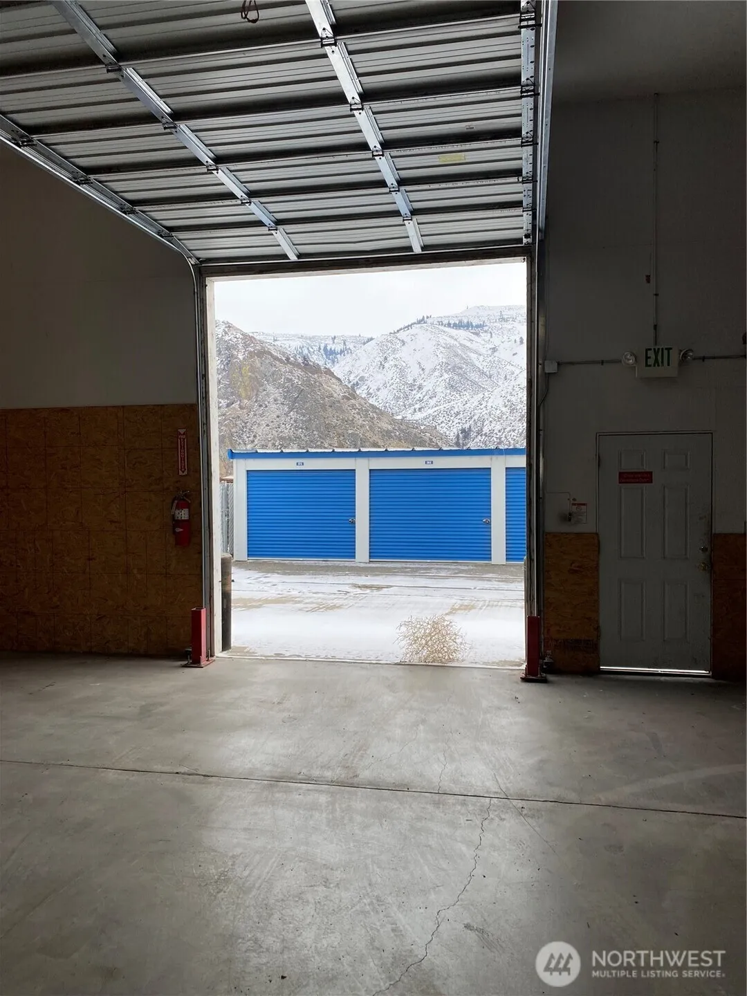 FOR LEASE: $5940 per month lease. Inexpensive dry storage space off Highway 97 A in Entiat. This 9900 sq ft structures offers two entry points with 12 foot auto rollup doors, one on the west end and one on the east end. Two man doors, one on each end. 16 foot ceiling height. Concrete slab flooring, flourescent lighting. No plumbing. Electric coded gated entry to fenced area surrounding this structure. The structure is 90×110. Tenant pays power only