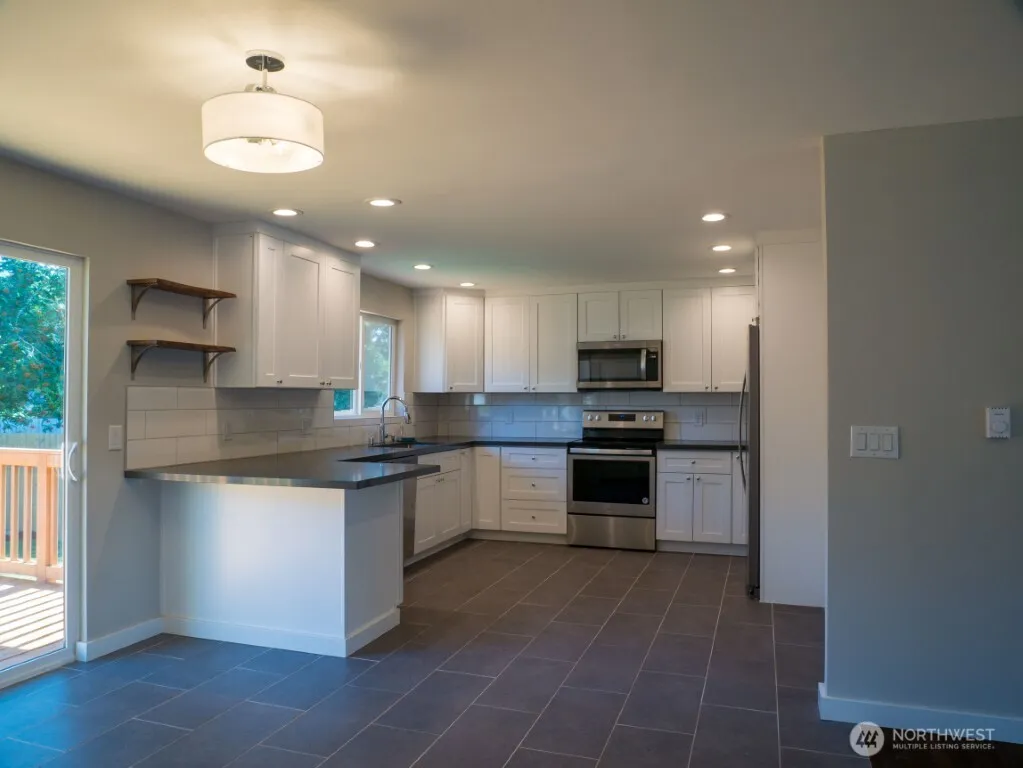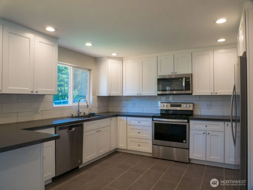 Updated mid-century 3 bed, 1 bath charmer that sits on a large lot! Light and bright living room opens to dining room and kitchen with eating space. Hardwood floors and updated bathroom with tile surround. Recently completely remodeled with new kitchen cabinetry, quartz counters, stainless appliances, int/ext paint, doors, trim, vanities, flooring, roof, plumbing, electrical and more. Large, fenced back yard for your approved pup and convenient Edmonds location. Take a look today.