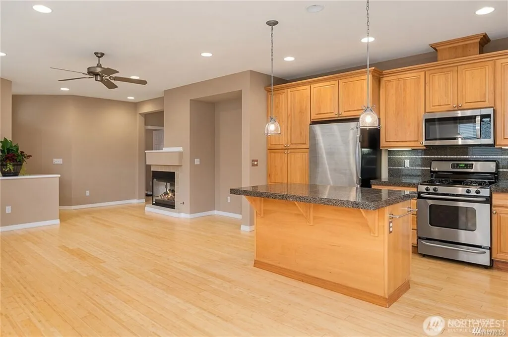 Rambler in the heart of Trilogy at Redmond Ridge. This active adult 55+ community has everything you need. Open floor plan with bamboo floors and cozy living room w/gas fireplace. Updated kitchen with granite, Stainless steel appliances, gas cooktop. Deck. Spacious primary suite with granite bathroom, dual sinks & large walk-in closet. 2nd bedroom and additional bath. 2 car garage. Amenities: arts & craft classes, tennis, gym, yoga studio, indoor lap pool + much more. Home has A/C! Landscaping included in rent.