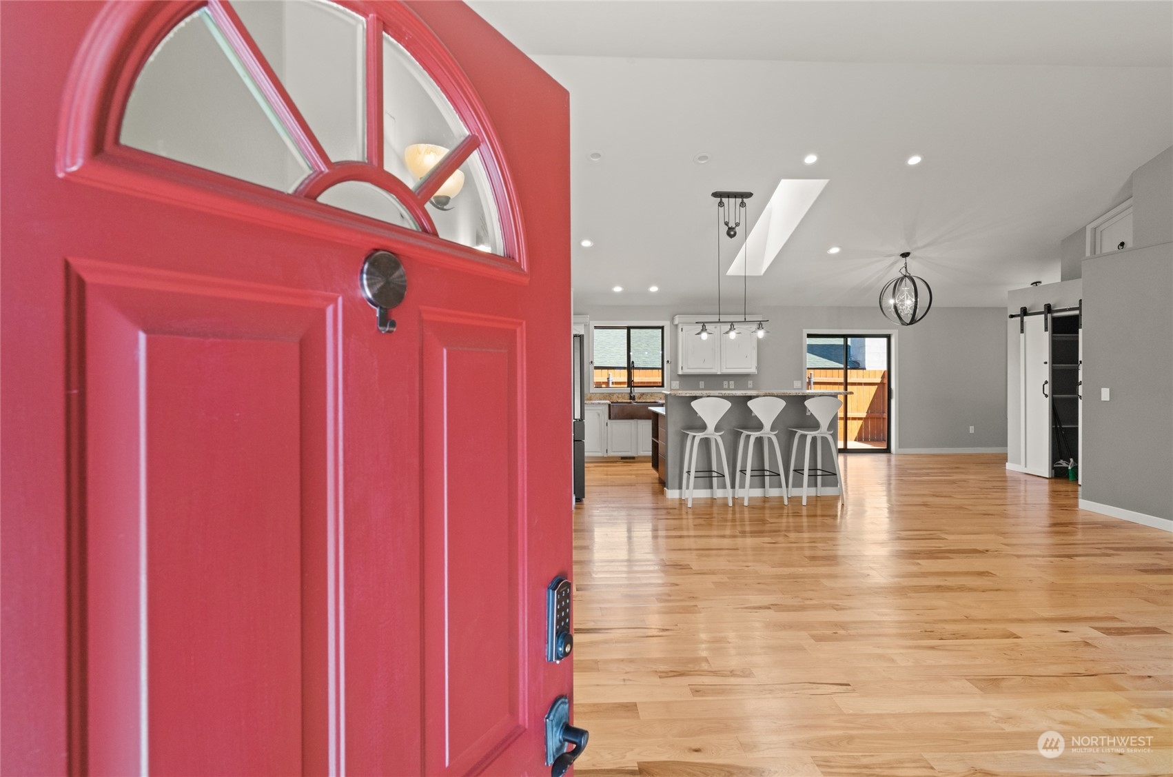 Fully remodeled rambler with stunning high-end upgrades! Gorgeous hickory hardwood floors and vaulted ceilings welcome you home. Expansive great room and kitchen with granite counters, textured copper sink, 2nd prep sink, wine fridge and instant hot water. Large walk-in pantry and dining area leading to private deck. Primary bedroom features en suite bath with dual granite vanity and wheelchair-accessible tiled shower. 3rd bedroom/bonus room off of primary could be an office, closet or great nursery. Corner lot with room for RV/boat parking on the side. Enjoy manicured low-maintenance lawn and storage shed.