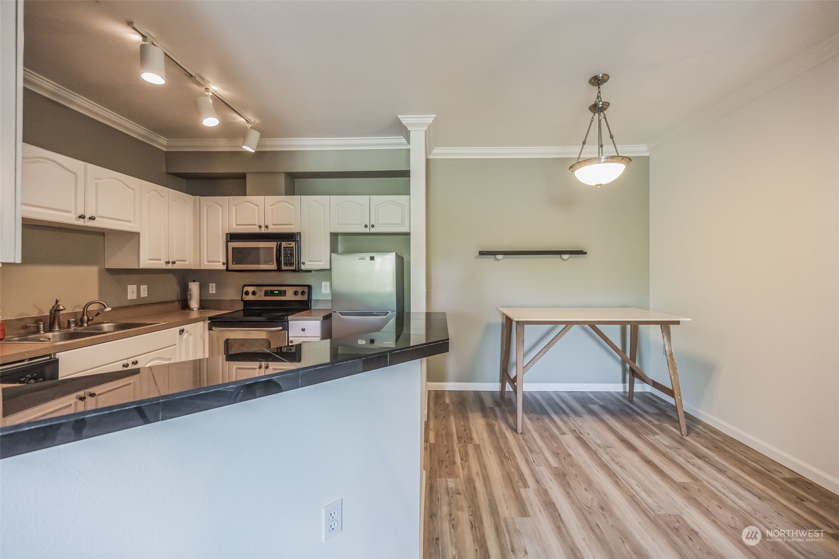 Welcome to the Bokara By The Lake! This newly renovated 2 beds, 1 bath condo is a true gem, offering a host of luxurious features. Step inside and be captivated by the thoughtful updates, including brand new LVP flooring and fresh paint. The open floor plan seamlessly connects the living, dining, and kitchen areas, creating a welcoming space for relaxation and entertaining. The full size kitchen comes with stainless steel appliances. Enjoy the view of Cascade mountain from the north-east facing unit. The gated community offers a pool, jacuzzi, and cabana. Conveniently located near Boeing HQ, the Landing, and major freeways. Live a life of comfort and convenience – schedule your viewing today!