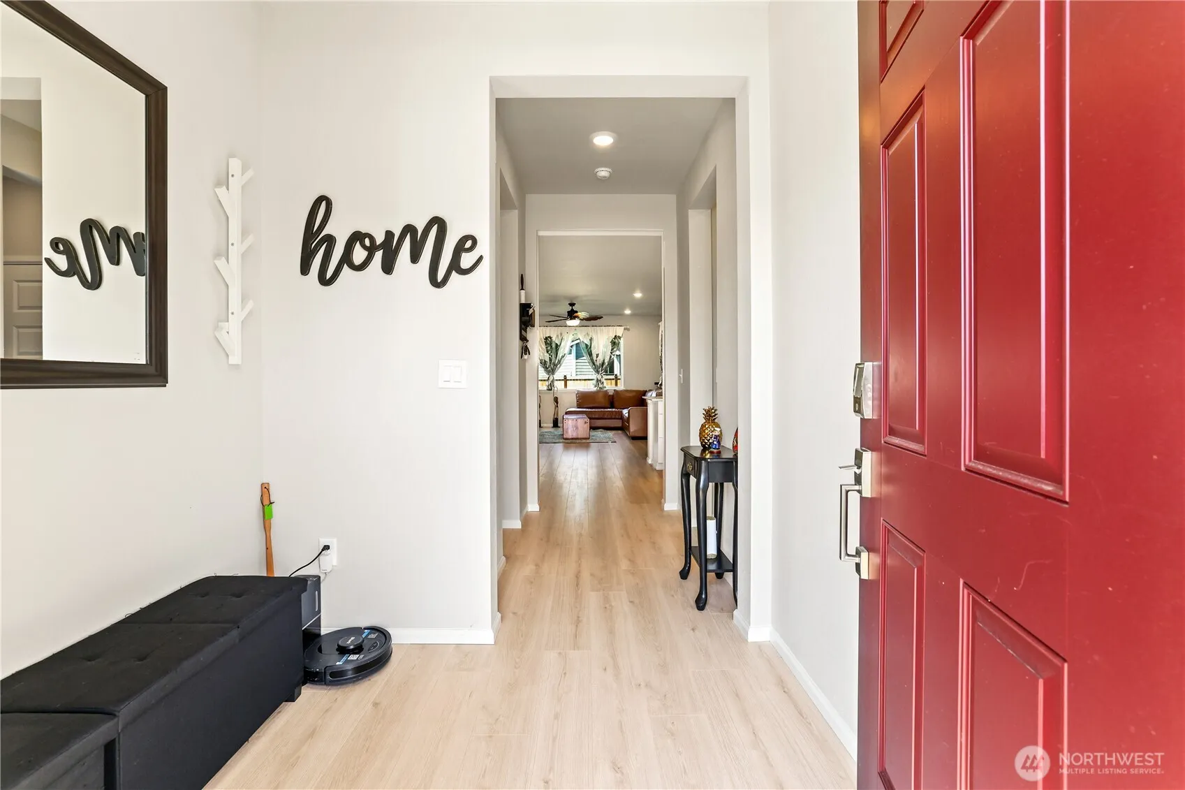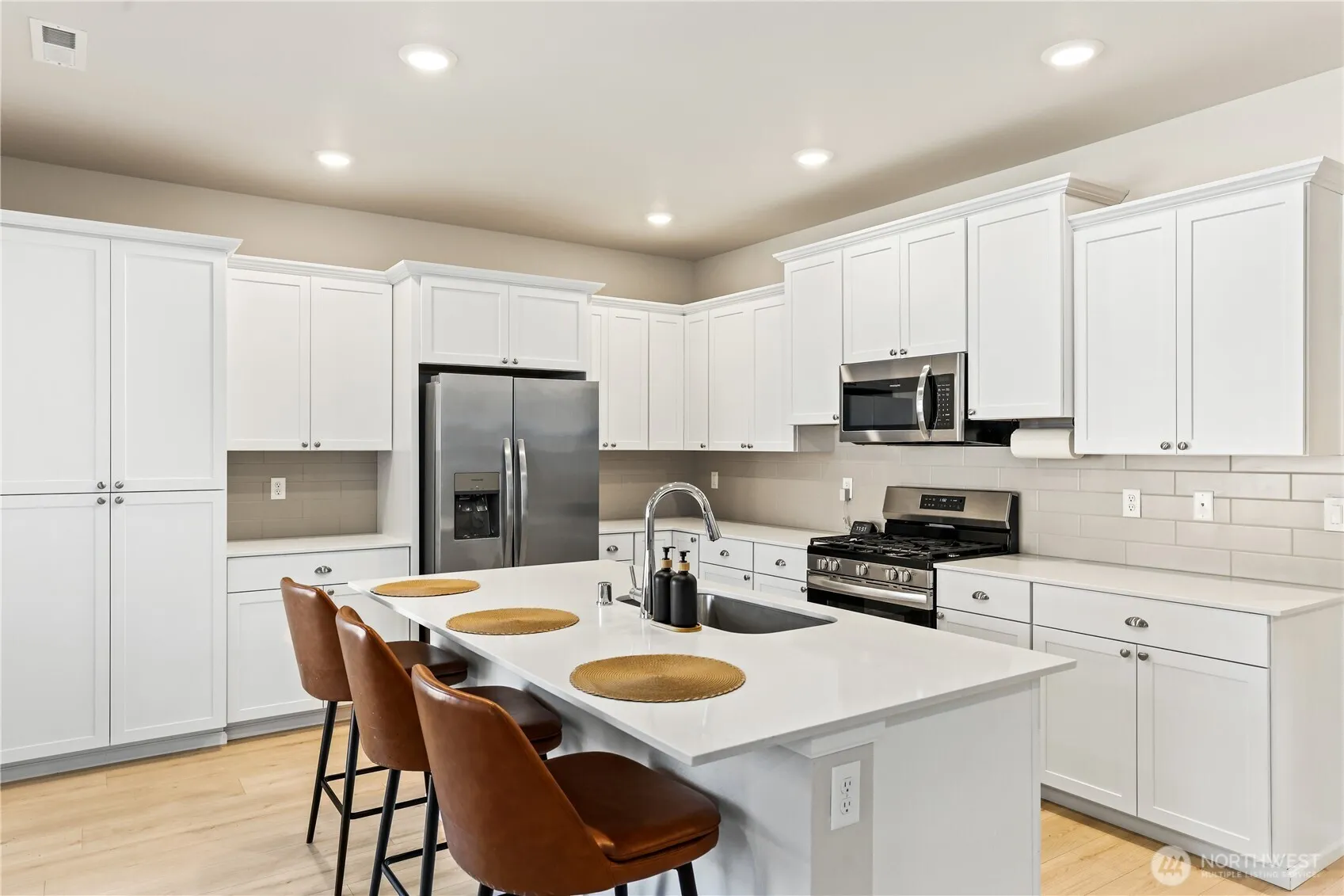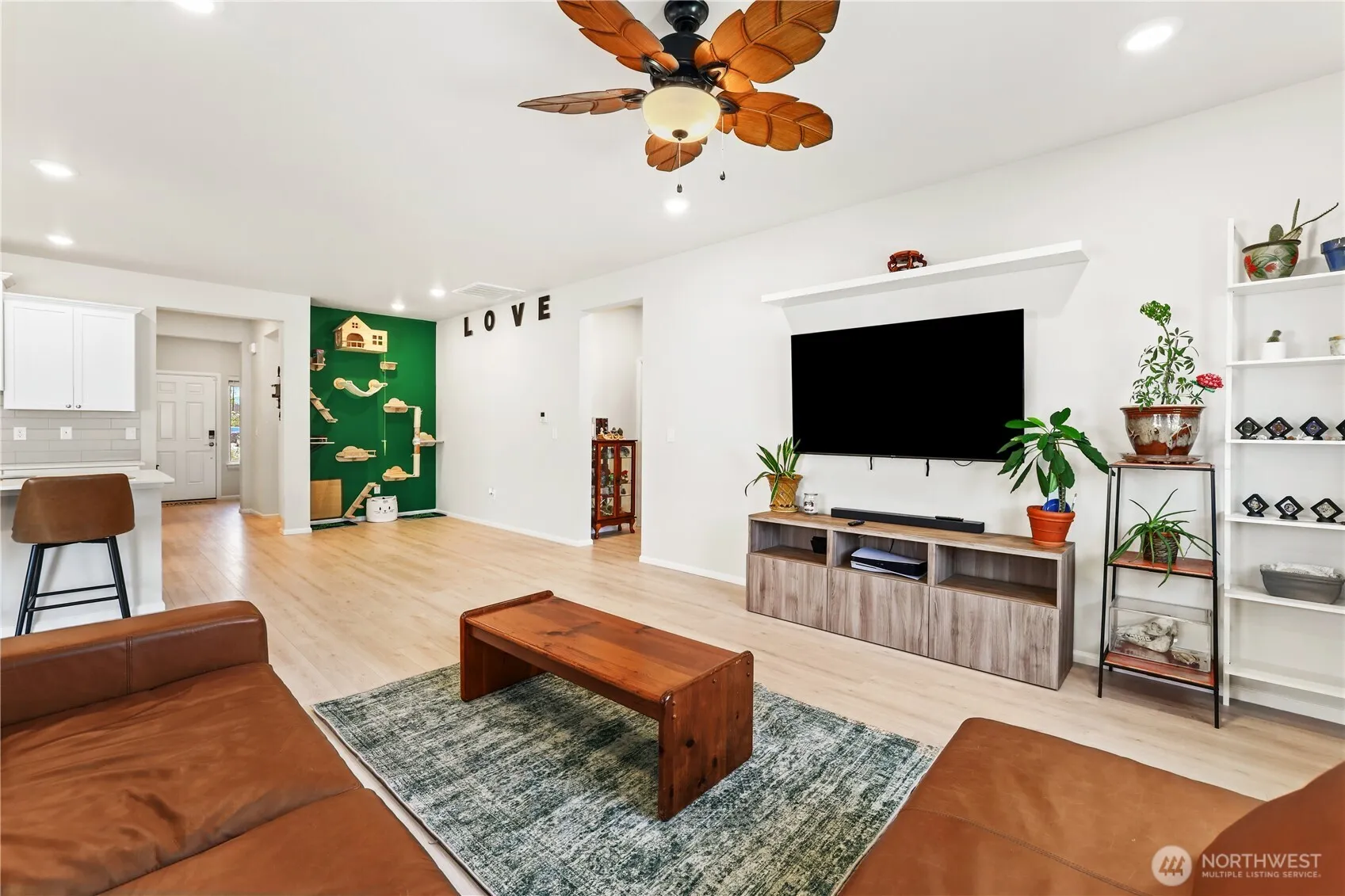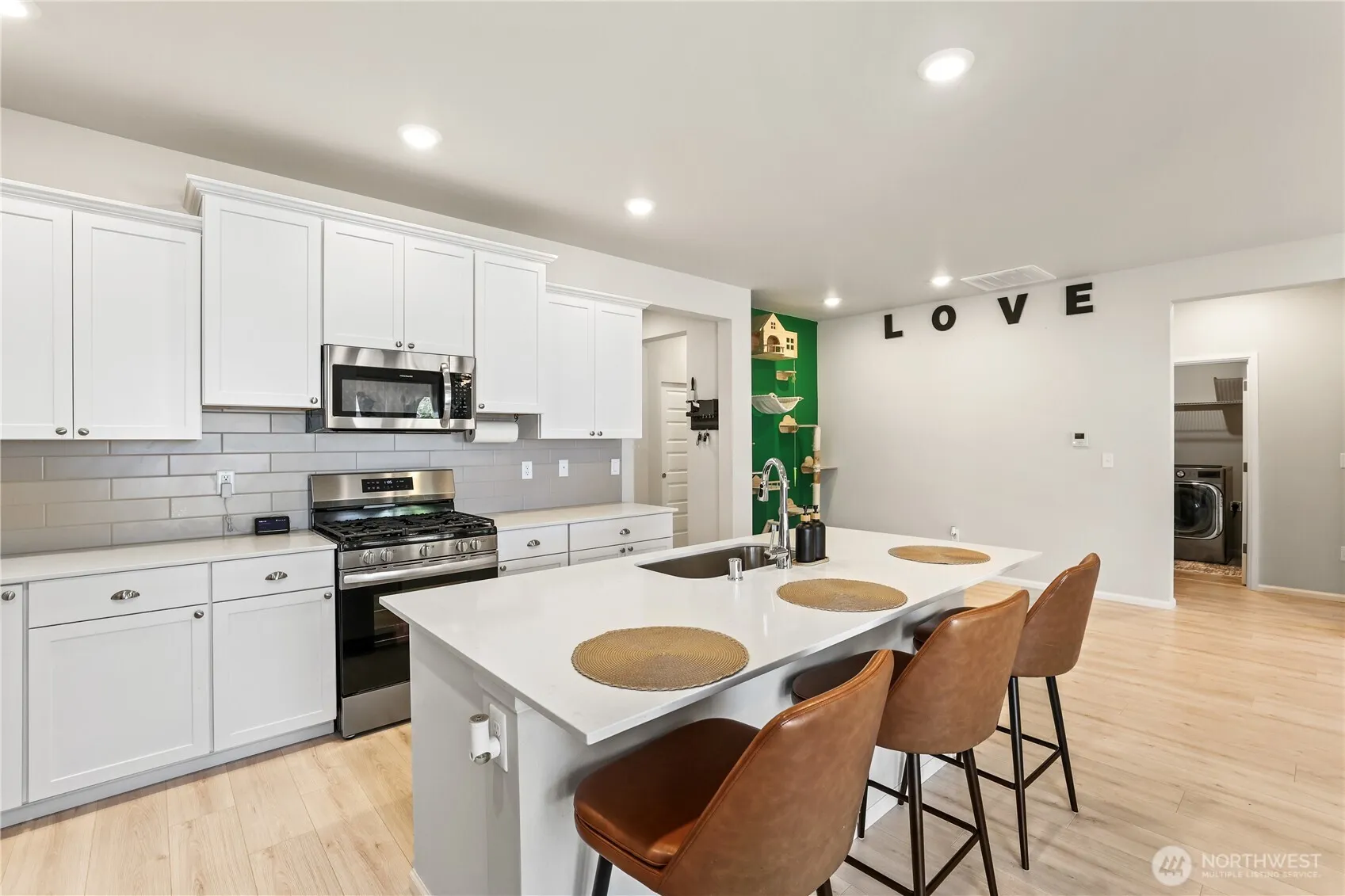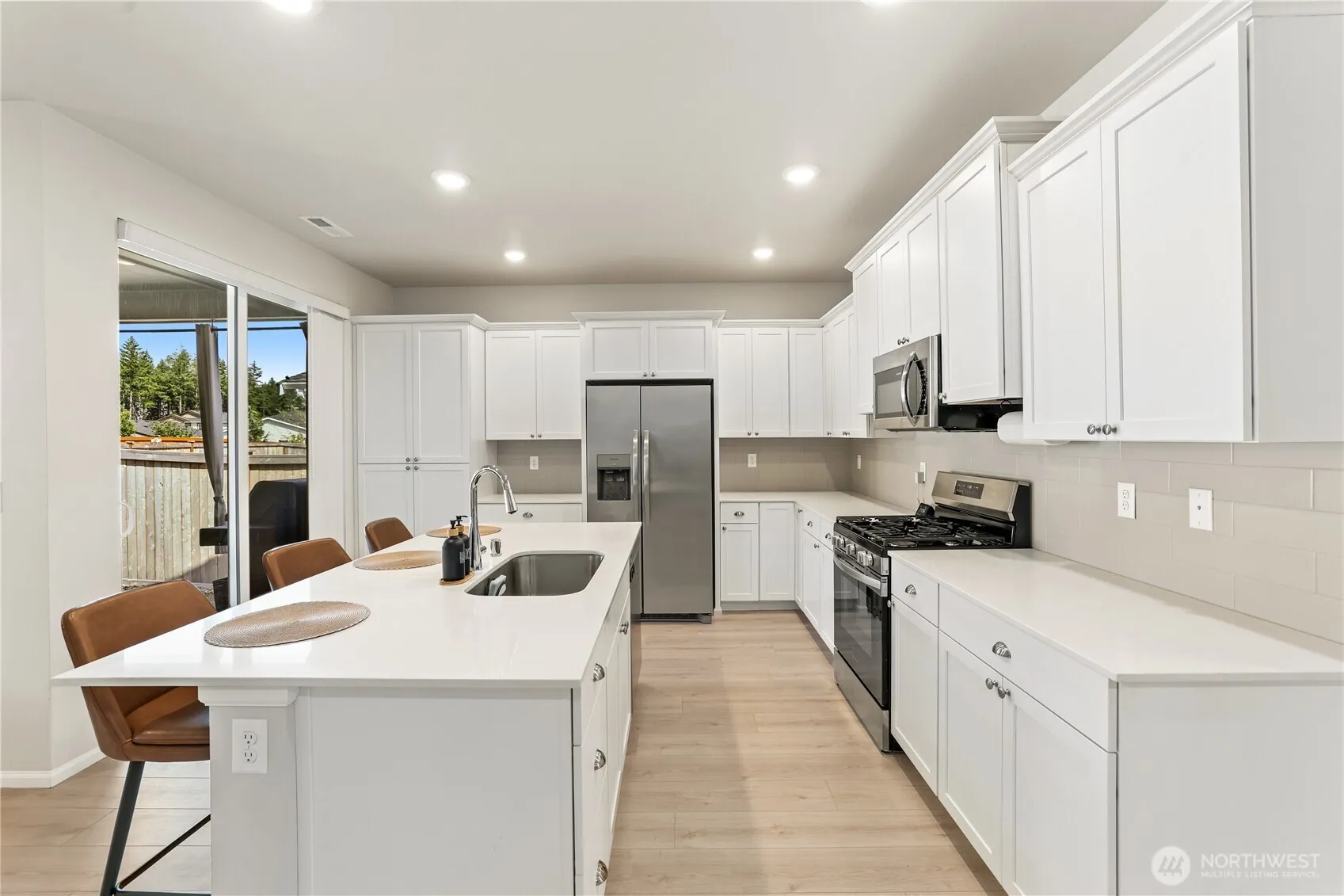 Welcome to this meticulously maintained Lennar resale rambler in the heart of Graham! This beautiful home features a stunning kitchen w/ white shaker cabinets, quartz countertops, a large quartz island, & SS appliances. The open concept design flows effortlessly into the large great room. The spacious primary suite offers a relaxing retreat & privacy w/ a gorgeous en-suite bath & w/i closet. A 2nd bedroom on the opposite side of the home & full bath. Enjoy the gorgeous covered patio overlooking the fully fenced large backyard—perfect for entertaining, gardening, or play. With a modern open layout & quality finishes throughout, this home blends style & comfort, in the peaceful neighborhood of Daybreak. Move in ready w/o the new build wait!