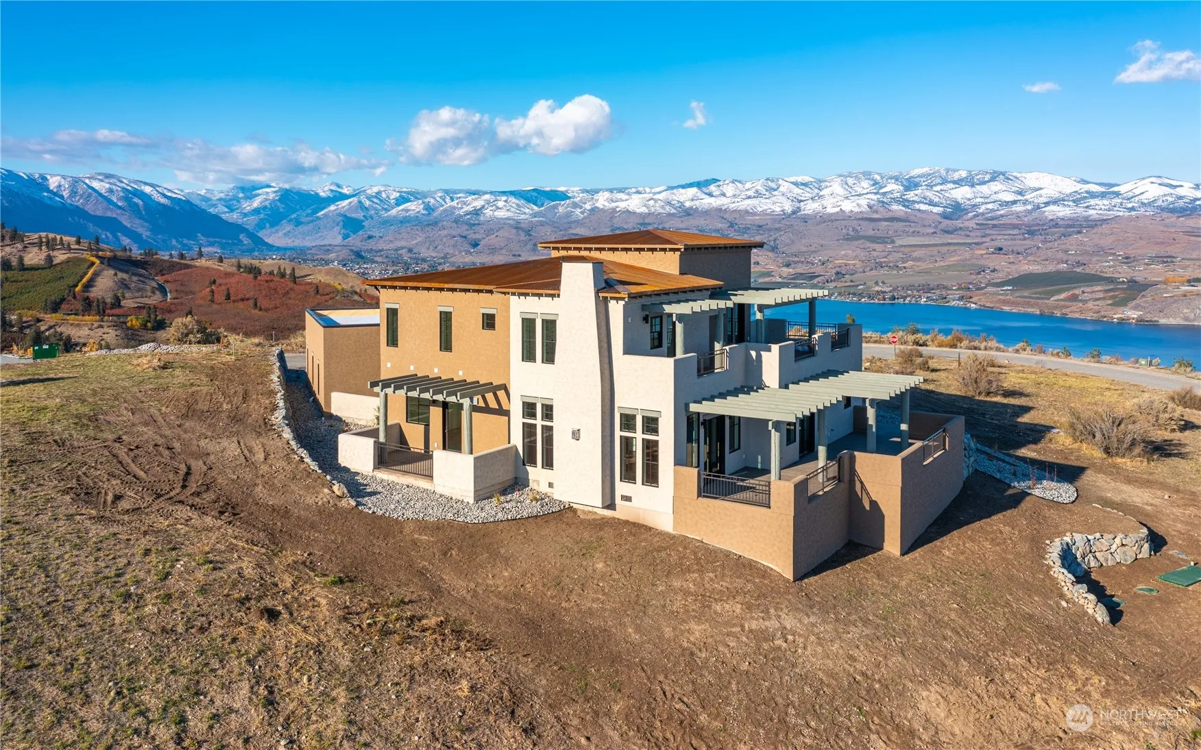 High quality new construction home at Bear Mt Ranch by Eider Construction! 3465sq 2-story home w/ huge views of Lake Chelan & surrounding territory. High end finishes & features throughout including 3 suites w/ walk-in tile showers & heated floors in primary, rocked propane fireplace, Jeld-Wen wood clad windows & french doors, 8′ solid core doors(except storage areas), quartz counters, upgraded KitchenAid appliances, corrugated steel roof, added insulation for soundproofing, wired for speakers/security, & more. Home lives nicely as a rambler & has a well-designed open concept floor plan + offers substantial flex space upstairs including family room w/ wet bar, den, & 2nd powder room. Over 1300sq of paver patio/deck space & shy 1000sq garage