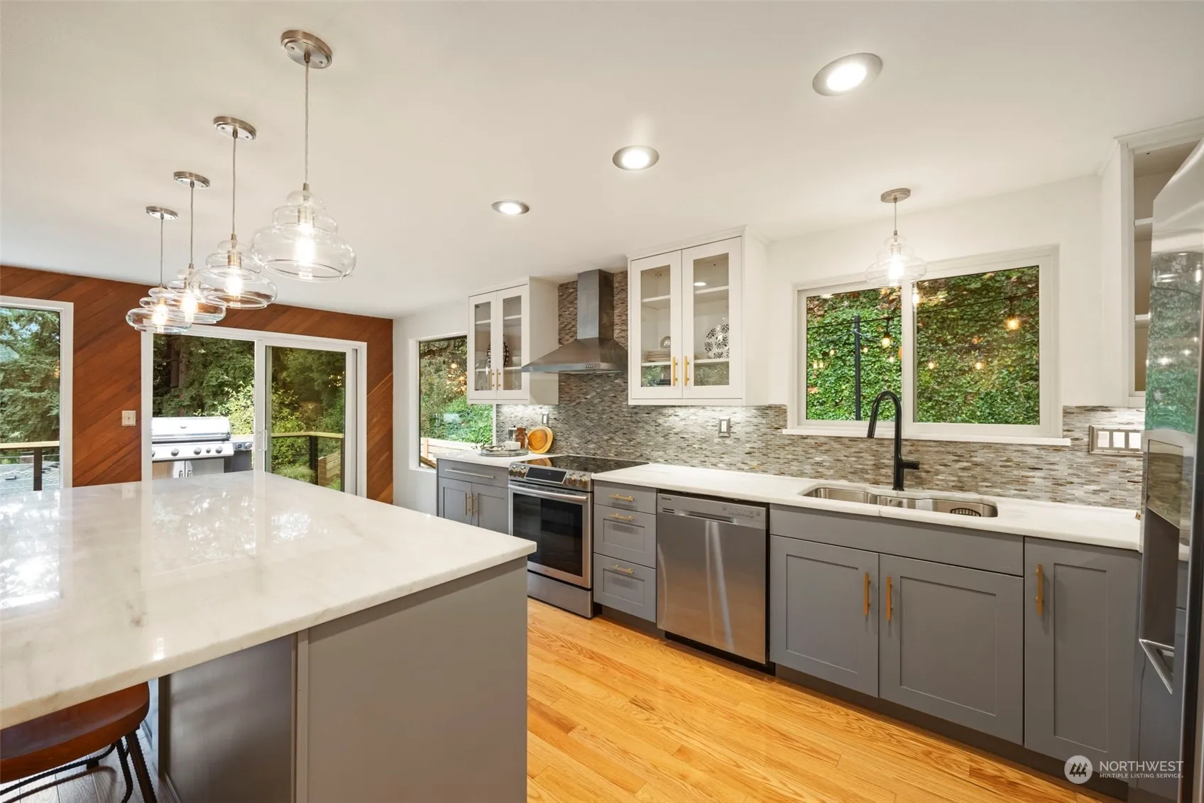 Welcome to your dream home, within walking distance of Seahurst Park! Well-lit split level with 3 bedrooms, 2.25 bathrooms, offering both comfort and style. The heart of the house is the open kitchen, adorned with quartz countertops and stainless steel appliances. Or enjoy the comfy living room area with a fireplace. Downstairs is an inviting family room which serves as a fantastic space for relaxation or play complemented by a separate laundry room for added convenience. Step outside to enjoy your expansive deck areas, perfect for outdoor dining. Additional features include double-car garage, EV and generator hook-up. Seahurst Park, is a saltwater beach, where you can explore trails, playground, have a picnic, or walk the beach.
